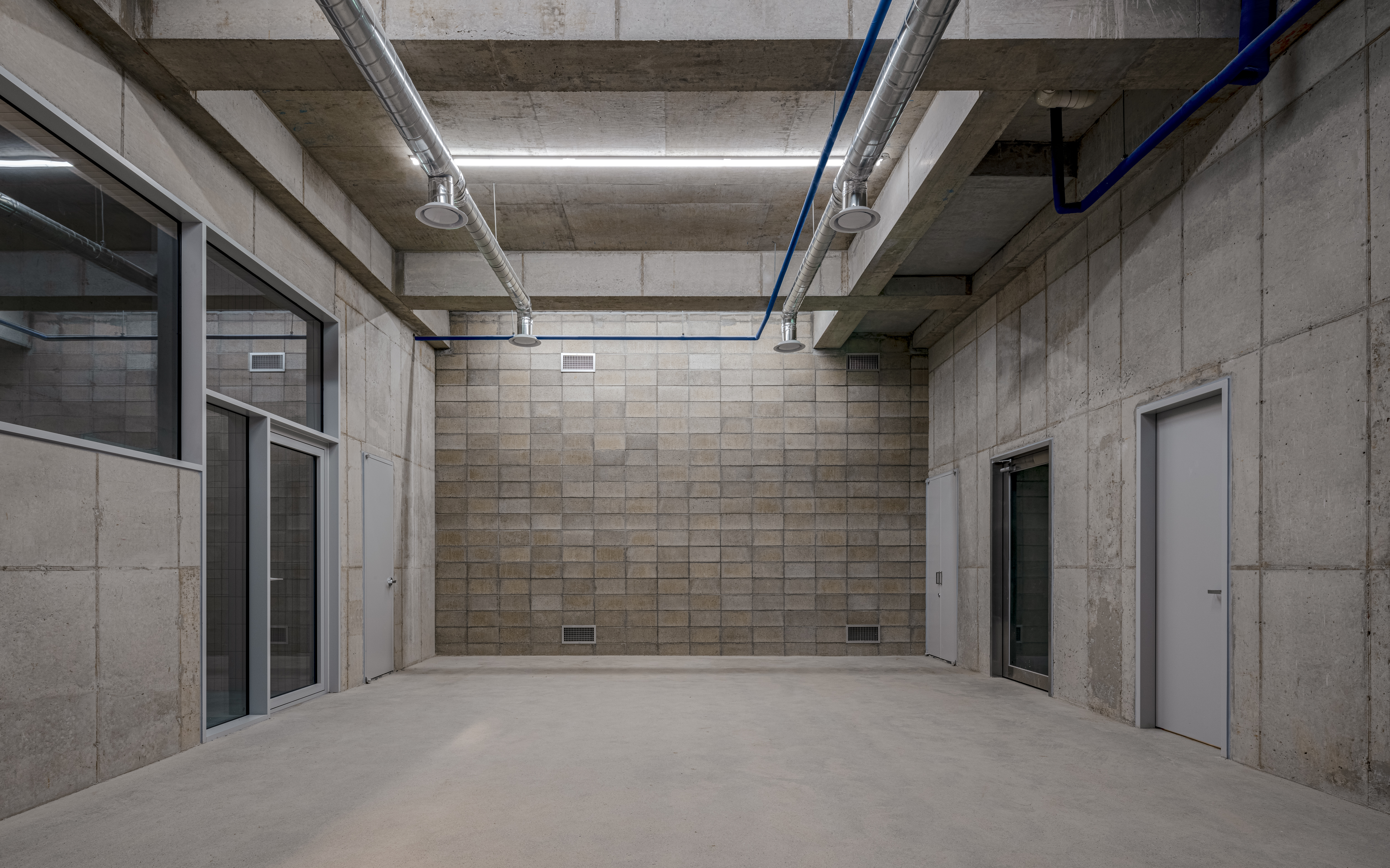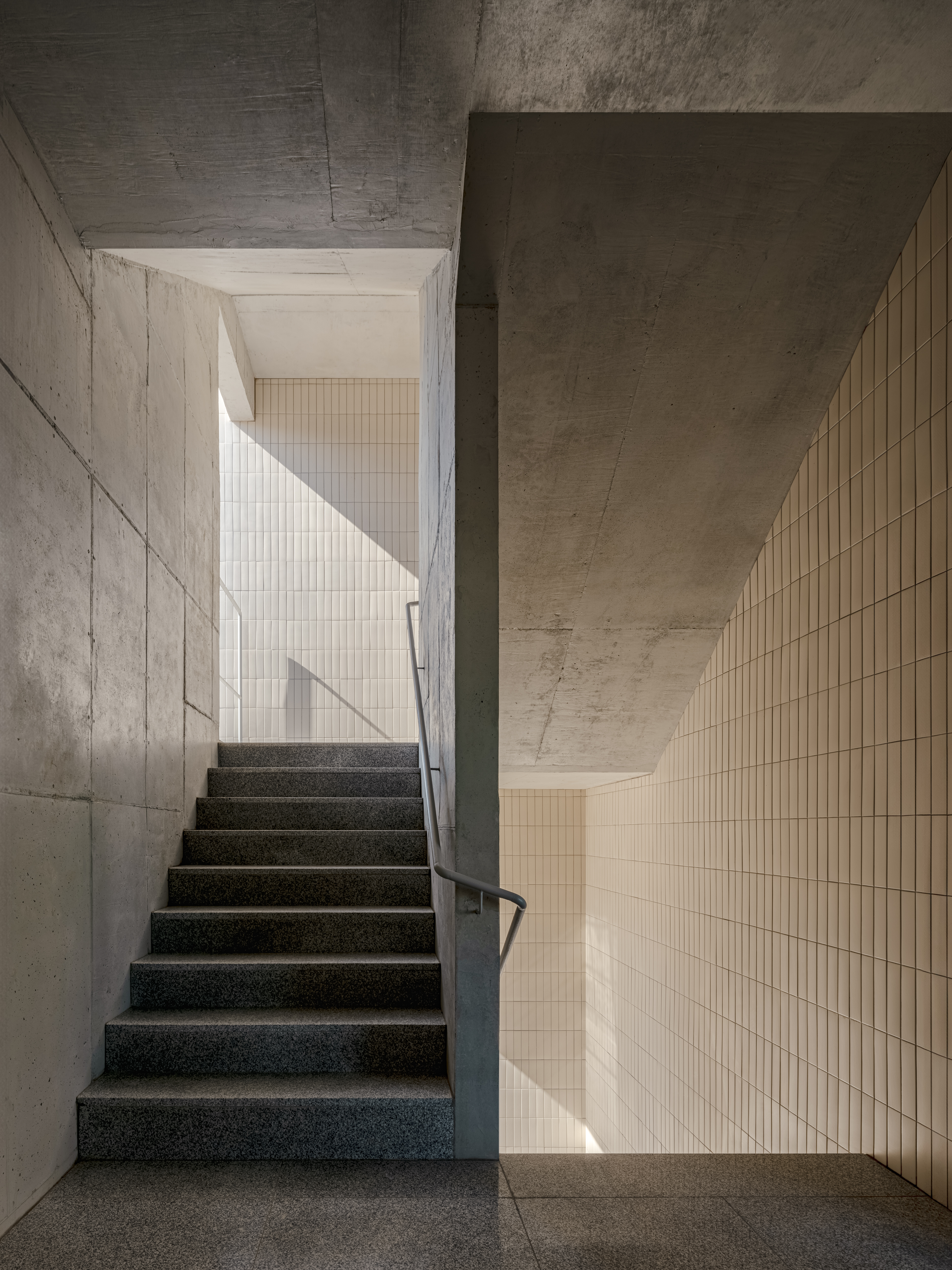 The second floor, with its wide curtain wall, is designed to be as visually effective and exposed as the ground floor creating a bright and inviting space. The third and fourth floors feature spacious terraces, enhancing the usability of each unit while fostering a healthy and pleasant environment for occupants. In small-scale mixed-use buildings, such independent terraces are rare and valuable, offering a refreshing break from dense commercial surroundings. One terrace directly faces a nearby schoolyard, securing an unexpectedly open vista within the urban fabric.