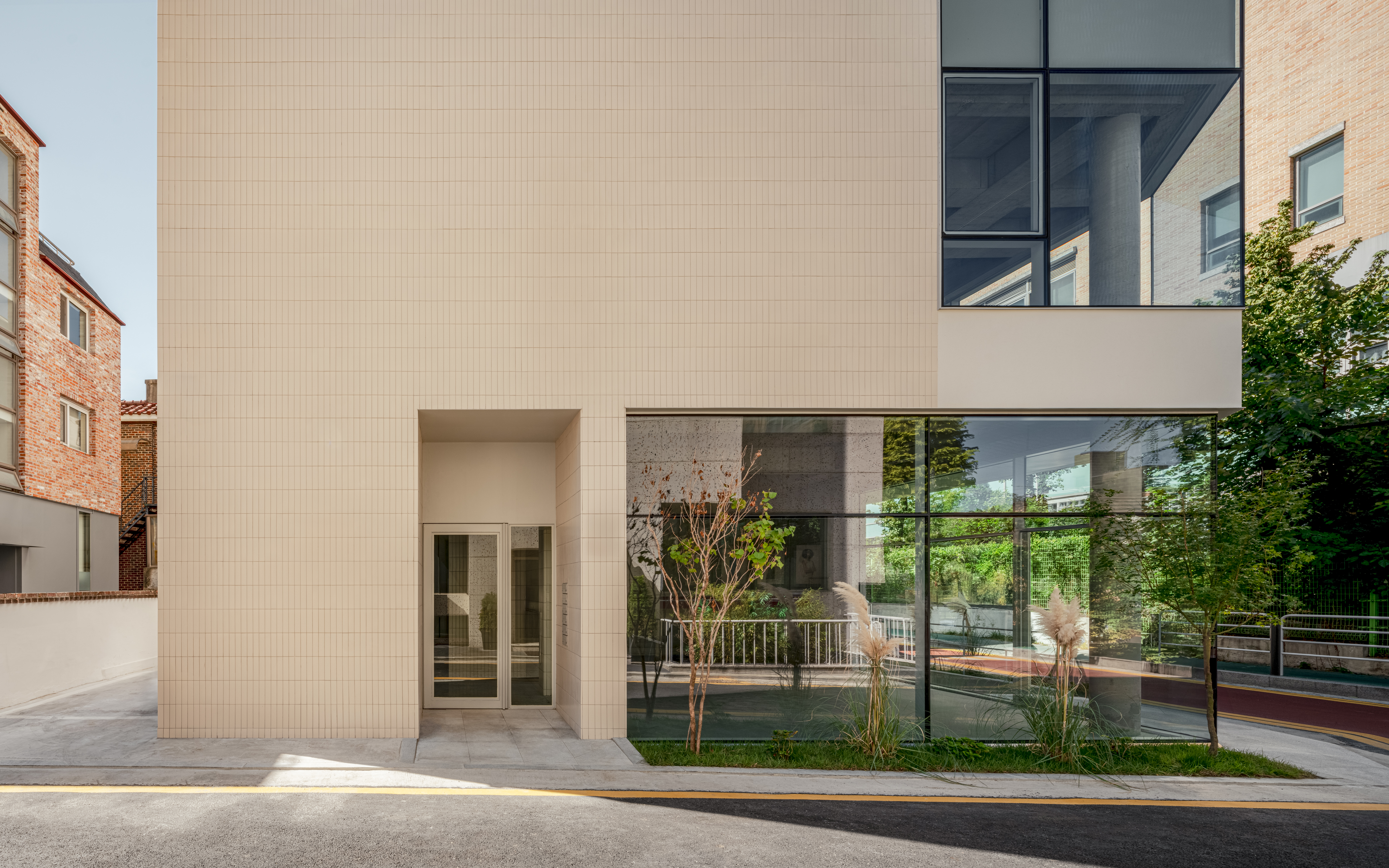 Within this framework, our main design goal and source of delight was to create a pleasant shopfront that directly engages with the street. Traditionally, the street-level facade (ground floor) is crucial in small urban commercial buildings, serving both as a visual marker and a generator of foot traffic. In Korea, small neighborhood retail buildings often attempt this, but much of the ground floor’s potential is lost due to required allocations for parking or vertical circulation.
