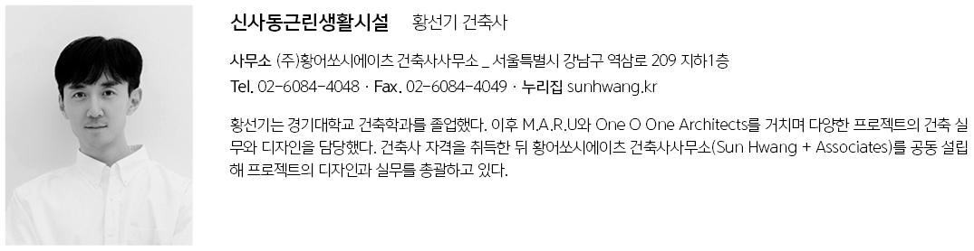 Sinsa Building Architect | Hwang, Sun W / Hwang, Sun K _ Sun Hwang + Associates Client | Private Supervisor | Sun Hwang + Associates Construction | Daewon Construction Location | Sinsa-dong, Gangnam-gu, Seoul Program | Class 2 Neighborhood Living Facilities Site area | 202.10㎡ Building area | 119.33㎡ Gross floor area | 524.77㎡ Building to land ratio | 59.05% Floor area ratio | 198.11% Building scope | B1F - 5F Structure | RC Exterior finishing | T8 Exterior tile finish, Mineral stucco finish, T24 double low-e glazing Interior finishing | Exposed conrete Design period | Mar. 2023 - Aug. 2023 Construction period | Sep. 2023 - Oct. 2024 Photograph | Jang, Mi Structural engineer | Eun Structural Engineer Mechanical·Electrical·Fire engineer | Taeyoung Tech |