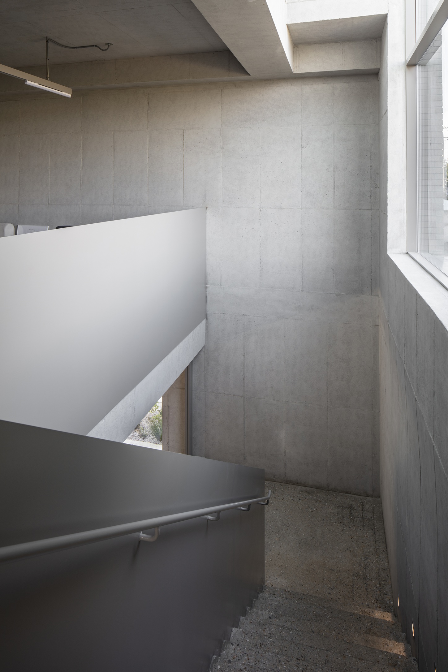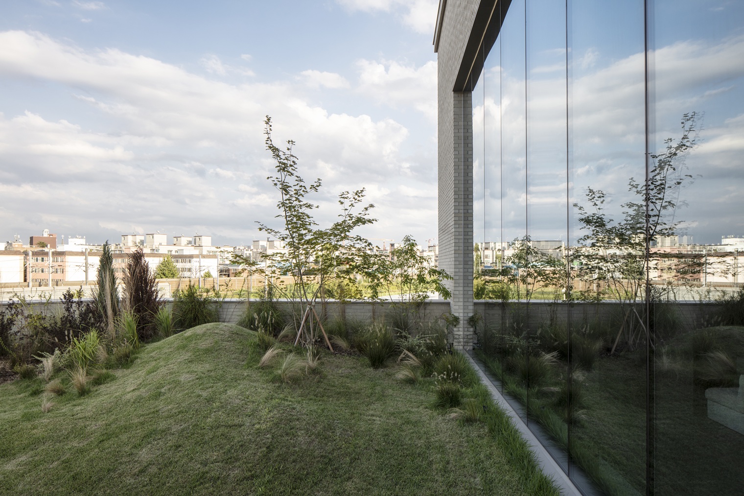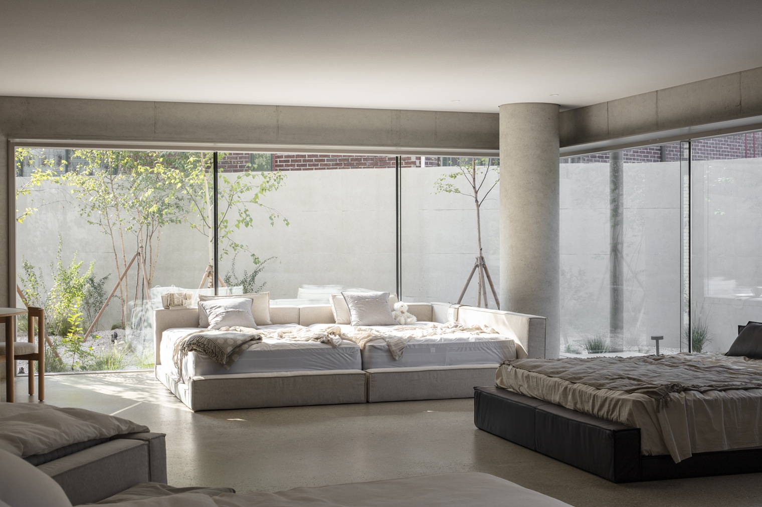 To emphasize a bedroom-like ambiance, the interior minimizes artificial lighting, instead focusing on natural daylight through carefully planned openings. Despite each floor spanning over 331㎡, the building maintains a private atmosphere while ensuring daylight penetration by incorporating skylights and clerestory windows throughout the second and third floors. These apertures capture views of the willow trees along Suwoncheon Park and passing trains, bringing the outside world into the interior.