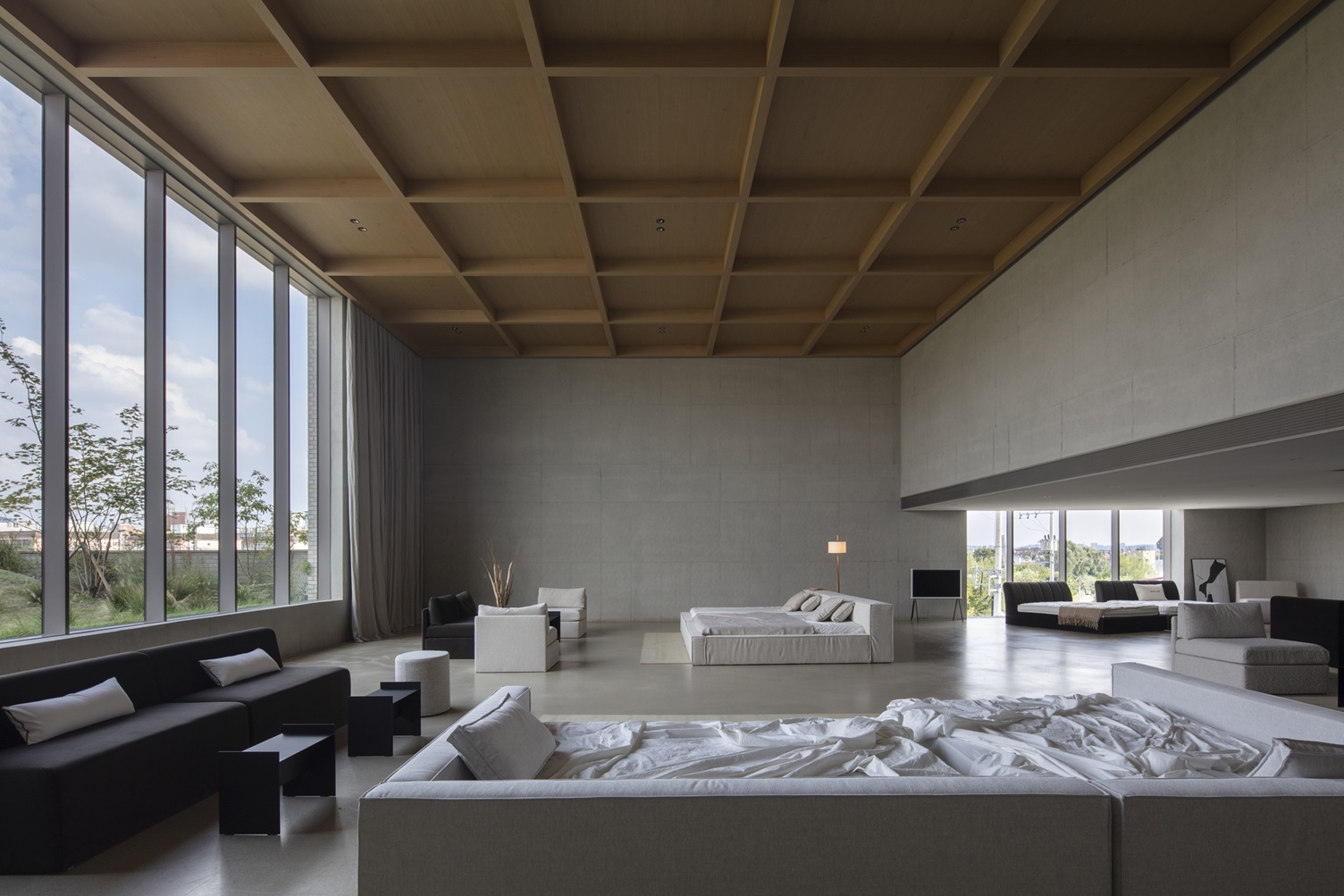 쇼룸이 아닌 아늑한 침실 경험을 제공하기 위해서는 외부 풍경을 끌어들이면서도 밖에서는 내부가 보이지 않도록 하는 것이 중요했다. 이런 이유로 1층 외부 입면에는 창호를 두지 않고, 북측 정원을 향한 부분에 전면 창호를 계획했다. 2층과 3층에도 고측창과 천창을 두어 주변 대지가 아닌 버드나무와 하늘이 보이도록 의도했다.