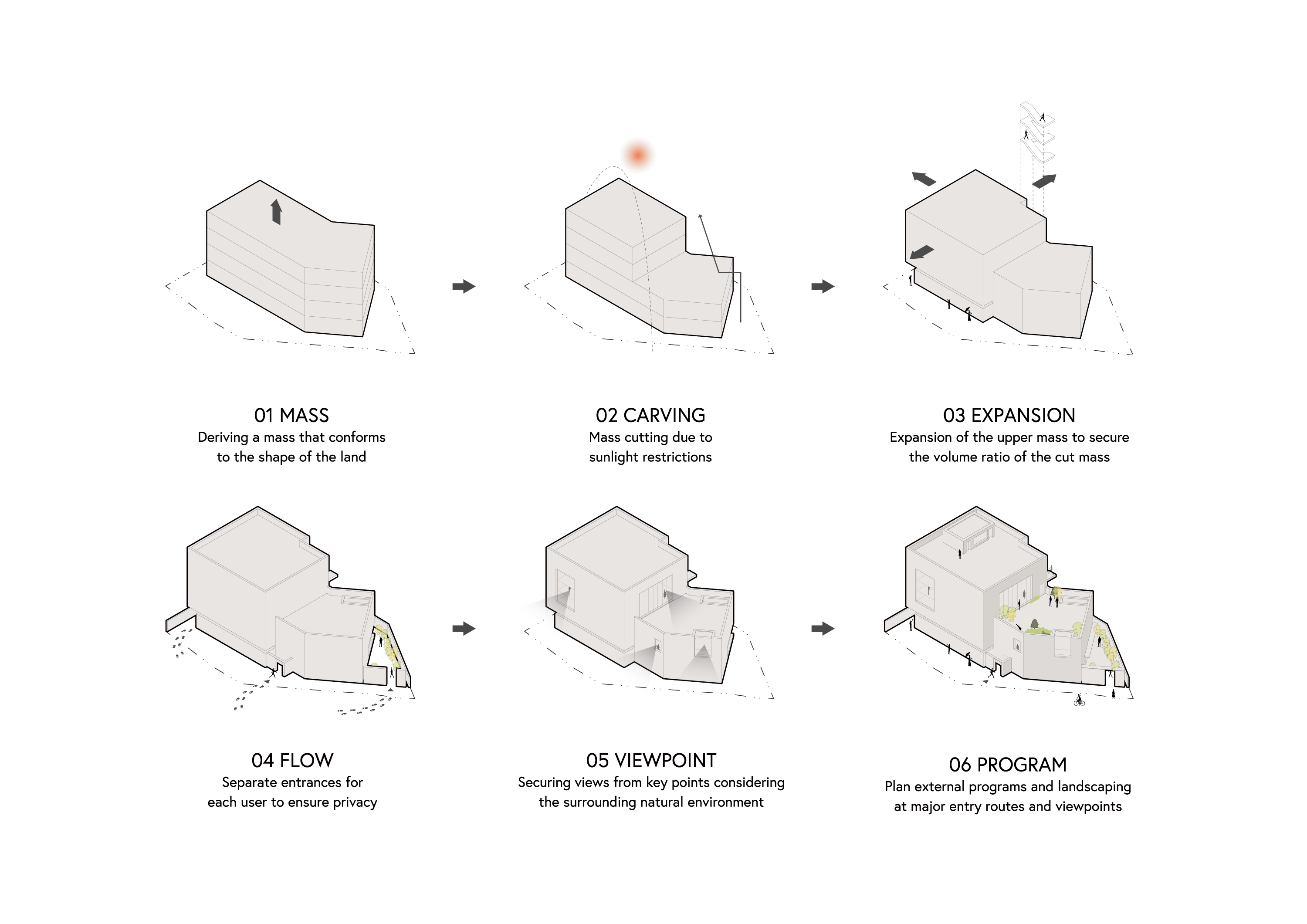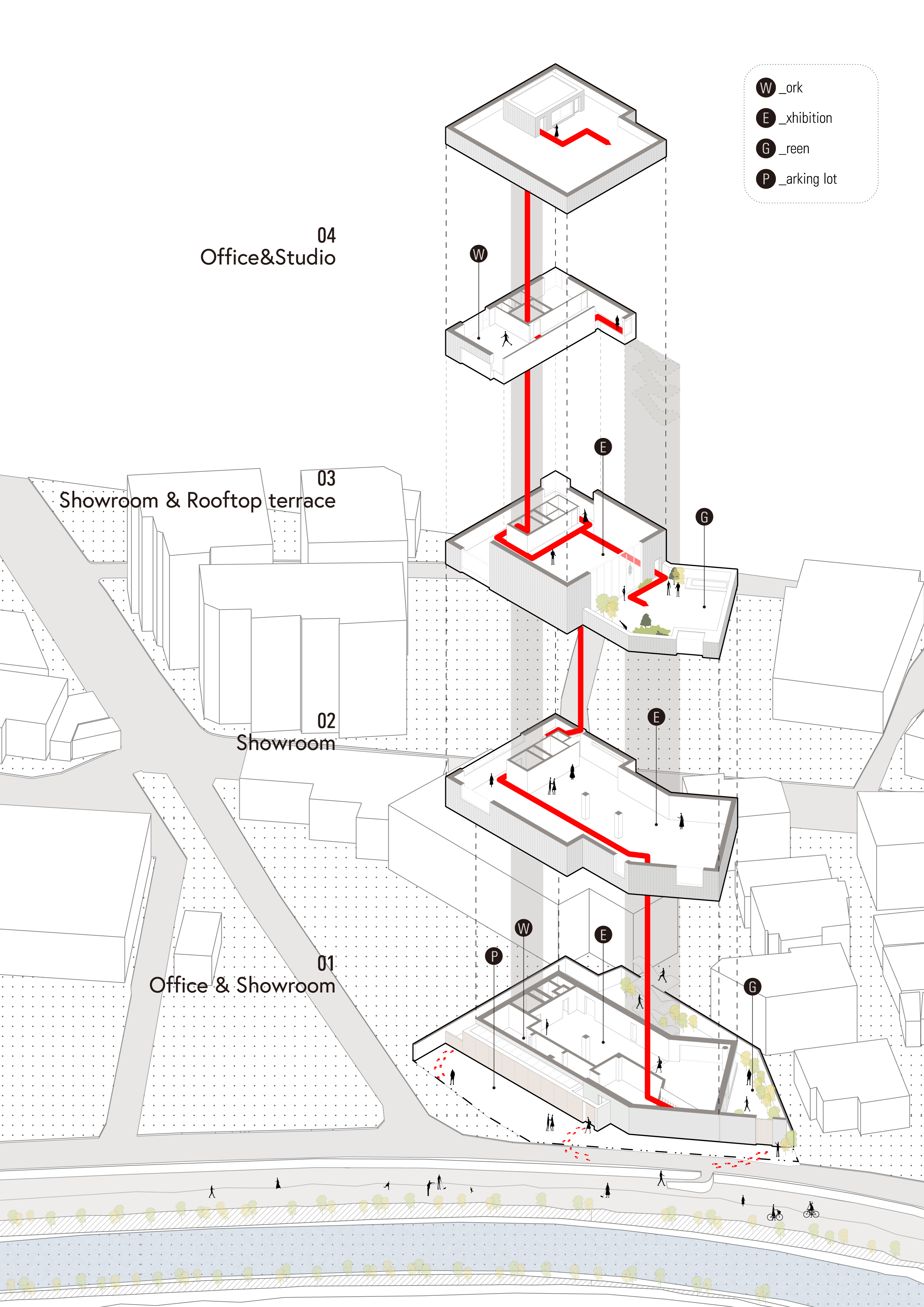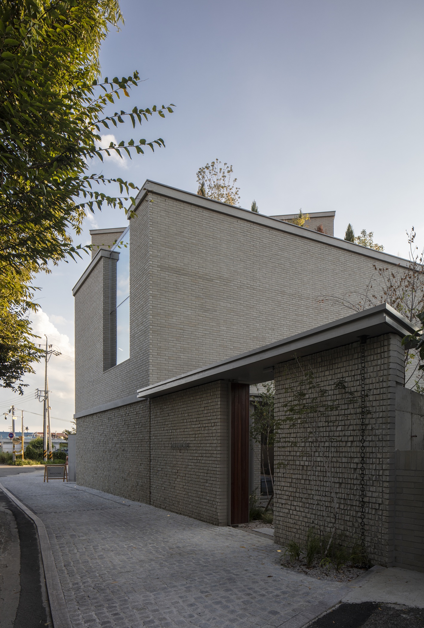 설계 초기 단계부터 건축물의 사용 방식과 방문자의 동선을 다양하게 시뮬레이션한 뒤 최종안을 선정했다. 사옥과 쇼룸 두 가지 용도를 모두 충족하기 위해 관리자와 고객의 동선을 분리하고, 각 사용자에게 필요한 동선을 계획하는 과정이 필요했다. 이에 따라 서측 대문을 통해 길게 우회하는 고객 진입 동선을 형성하고, 남측 정면에는 주차장에서 바로 진입할 수 있는 관리자 출입구를 두었다. 고객은 건축물의 가장 넓은 남측 정면을 처음 마주하고, 서측 대문을 통해 대지를 우회하며 날카로운 입면을 조망한다. 대문을 지나 부지로 들어서면 프라이빗한 정원을 거닐며 건축물을 한 바퀴 둘러본 후 후면 로비로 향하게 된다.