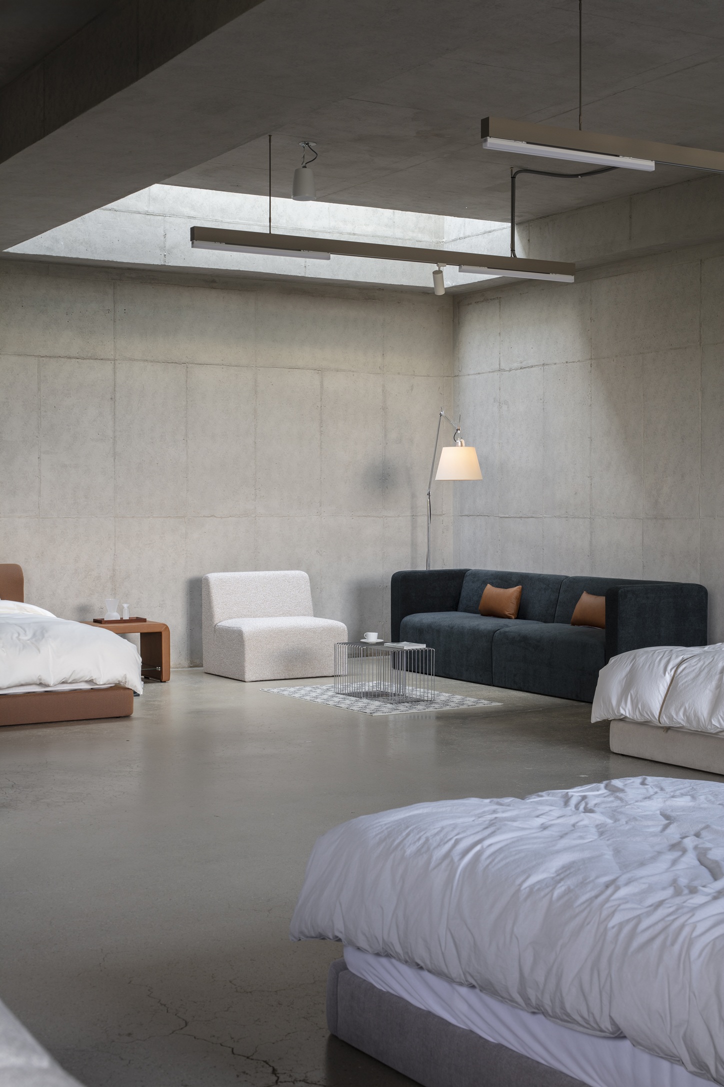 침실을 기반으로 한 브랜드 공간 조성을 위해 내부 공간은 인공조명을 최소화하고 자연 채광을 위한 창호 계획에 집중했다. 한 층 바닥면적이 331㎡가 넘는 공간을 프라이빗하게 구성하면서도 풍부한 채광을 확보하기 위해 천창과 고측창을 2층과 3층 곳곳에 배치했다. 이를 통해 창호 너머로 수원천 공원의 버드나무와 기차가 지나가는 풍경이 건물 내부로 유입된다.