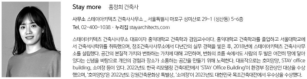 | STAYMORE 설계자 | 홍정희 _ 스테이아키텍츠 건축사사무소 건축주 | STAYMORE 감리자 | 스테이아키텍츠 건축사사무소 시공사 | 우리마을에이엔씨 주식회사 설계팀 | 고정석, 김판수, 김영도 대지위치 | 경기도 수원시 주요용도 | 근린생활시설 대지면적 | 891.00m² 건축면적 | 428.25m² 연면적 | 1,159,57m² 건폐율 | 48.61% 용적률 | 133.29% 규모 | 4F 구조 | 철근콘크리트구조, 목구조 외부마감재 | 벽돌, 노출콘크리트 내부마감재 | 우드, 도장, 노출콘크리트 마감 설계기간 | 2022. 03 - 2023. 06 공사기간 | 2023. 08 - 2024. 07 사진 | 홍기웅 구조분야 | SM구조 기계설비·전기·소방분야 | 세원ENG |