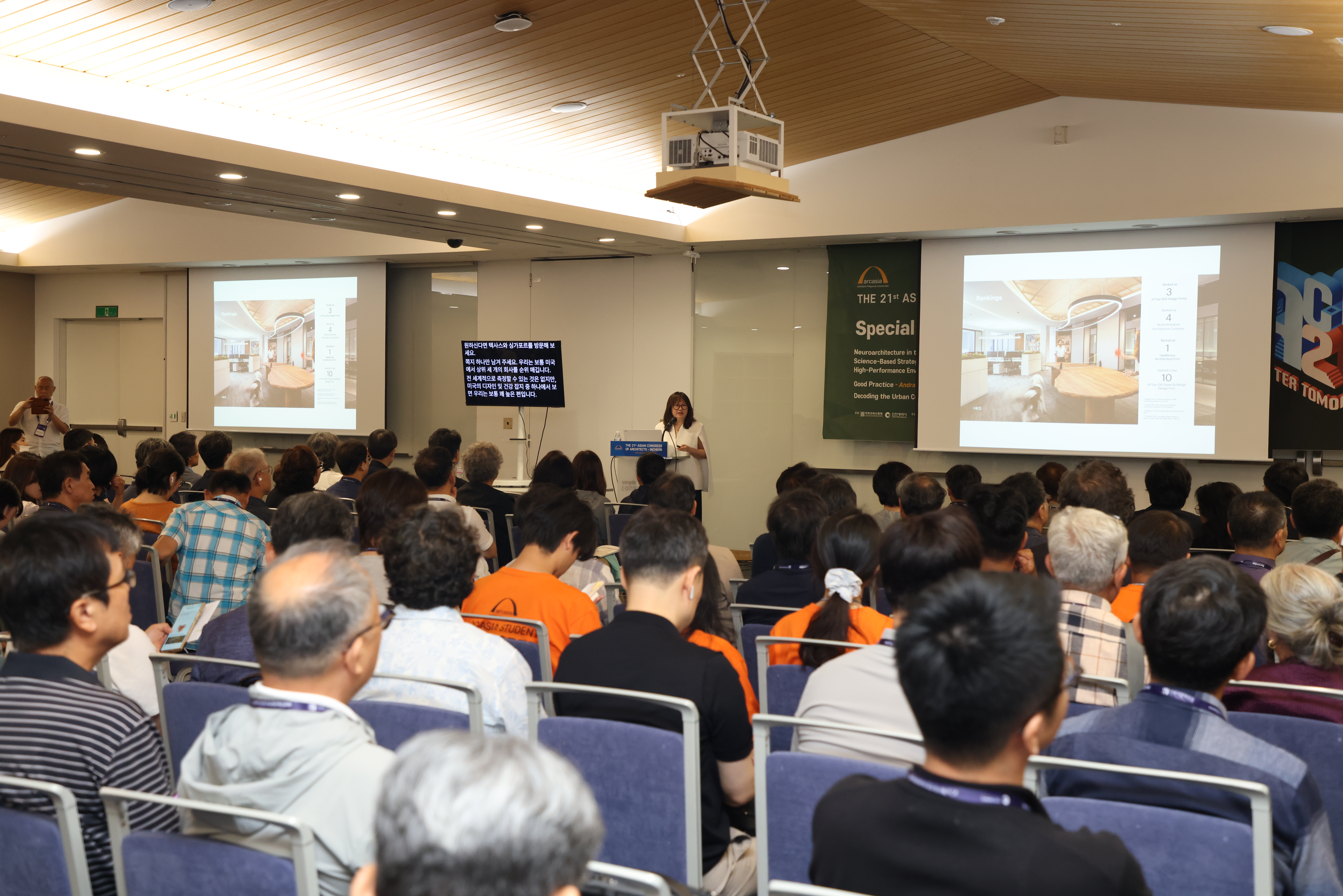 제21차 인천 아시아건축사대회에서 엔젤라 리가 ‘정신건강까지 배려한 근무환경 디자인’을 주제로 특별강연을 진행하고 있다.