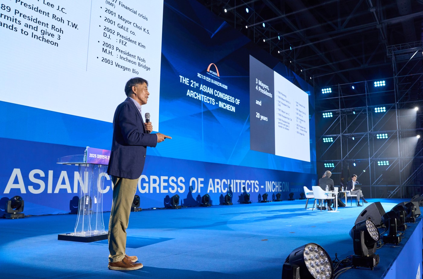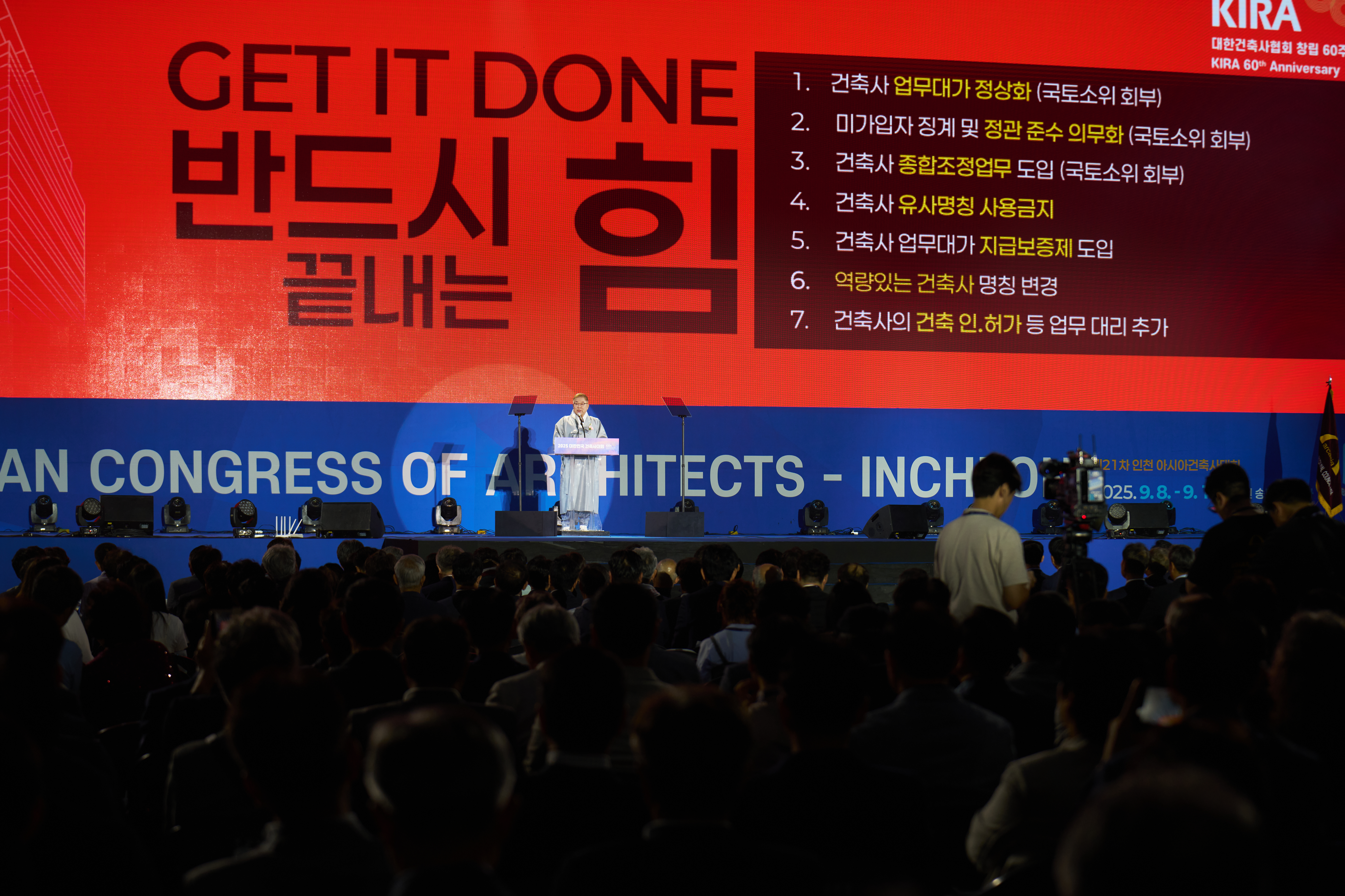 2025 대한민국건축사대회 개회식에서 내외빈들이 국기에 대한 경례를 하고 있다.2025 대한민국건축사대회 개회식에서 대한건축사협회 김재록 회장이 대회사를 통해 향후 100년의 건축 비전을 제시하고 있다.2025 대한민국건축사대회 개회식에서 대회사를 전하고 있는 대한건축사협회 김재록 회장2025 대한민국건축사대회 개회식 전경. 인천 송도컨벤시아 전시홀을 가득 메운 1만여 대한 건축사협회 회원과 아시아 24개국 건축사들이 대회사를 경청하고 있다.2025 대한민국건축사대회 개회식에서 김재록 대한건축사협회 회장은 “시민의 삶을 바꾸는 공공전문가인 건축사가 지역 문제 해결에서부터 공공 이익 실현의 주역이 될 수 있도록 공공건축 참여 확대와 업무 대가기준 제도화를 실현하겠다”고 말했다.제21차 인천 아시아건축사대회 강성익 조직위원장이 인사말을 전하고 있다.2025 대한민국건축사대회 개회식에서 김재록 대한건축사협회 회장이 “GET IT DONE, 반드시 끝내는 힘”을 강조하며, ▲업무대가 정상화 ▲정관 준수 의무화 ▲종합조정업무 도입 ▲유사명칭 사용금지 ▲지급보증제 도입 ▲건축사 명칭 변경 ▲건축 인·허가 대리 추가 등 7대 과제를 제시했다.제21차 인천 아시아건축사대회에서 “17,546명 대한건축사협회가 그려갈 100년의 청사진”이라는 지속 가능한 건축의 미래 비전이 공유됐다.2025 대한민국건축사대회 개회식에서 사이푸딘 아마드 아시아건축사협의회 회장이 “한국의 통찰력과 미래지향적 접근방식이 아시아 건축계에 큰 혜택을 주었다”며 대회사를 전하고 있다.2025 대한민국건축사대회 개회식에서 국토교통부 이상경 제1차관이 축사를 통해 “건축은 시대를 반영하며, ‘더 나은 내일’이라는 주제는 시대적 흐름과 맞닿아 있다”며 기후대응 등 국가적 연대의 중요성을 강조했다.2025 대한민국건축사대회 개회식에서 정일영 국회의원이 “경제가 살아나야 건축도 꽃을 피울 수 있다”며 건축사들의 업무 여건 개선과 세계가 찾는 도시 조성을 희망한다는 축사를 전하고 있다.2025 대한민국건축사대회 개회식에 참석한 주요 내빈들이 환하게 웃으며 행사를 지켜보고 있다.