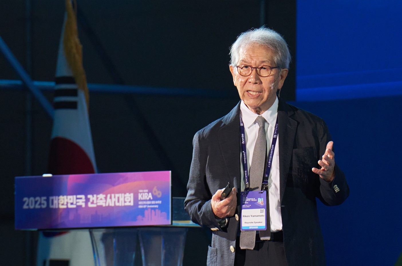 제21차 인천 아시아건축사대회에서 기조강연에 나선 야마모토 리켄 건축사가 ‘공존의 건축, 공동체를 위한 건축의 응답’을 주제로 발표하고 있다.제21차 인천 아시아건축사대회, 건축사 야마모토 리켄의 기조강연제21차 인천 아시아건축사대회에서 기조강연을 맡은 야마모토 리켄 건축사가 도시와 공동체의 공존을 주제로 발표하고 있다.