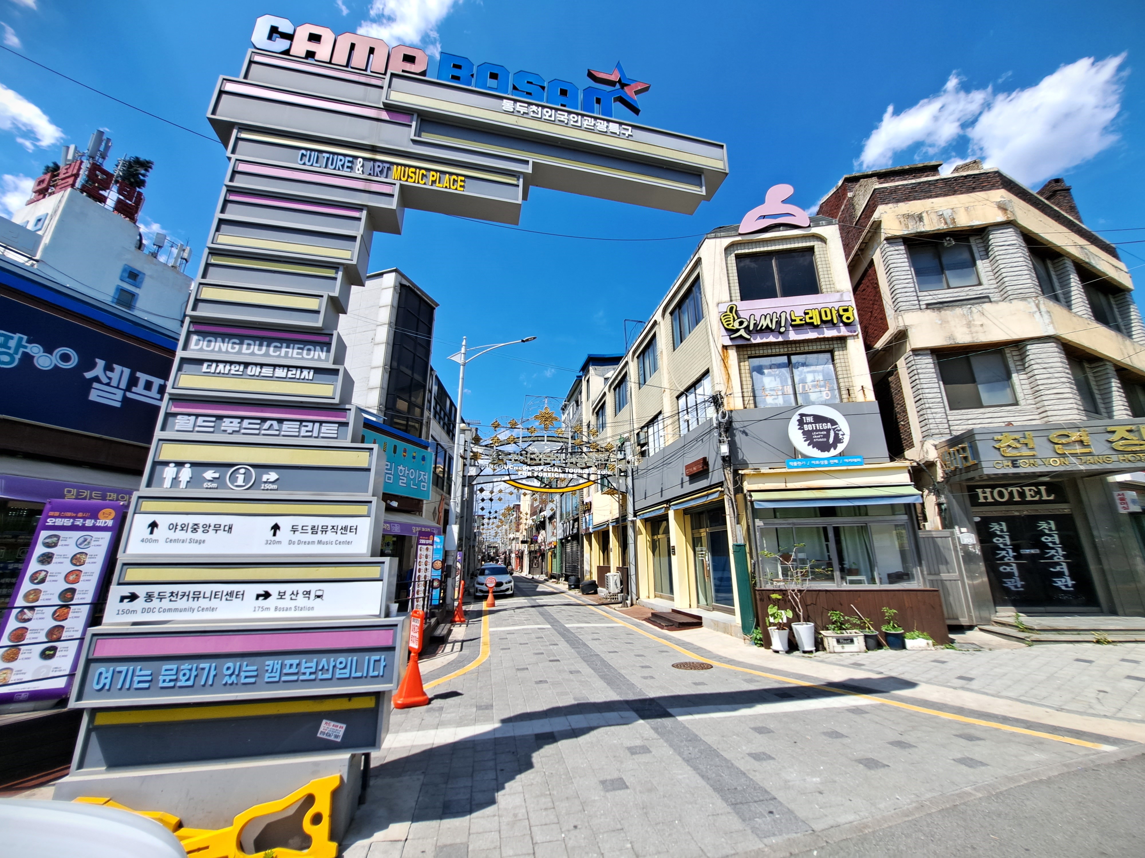 공간이 무척 밝다. 흡사 미국의 어느 소도시에 선 느낌이다. 이곳을 ‘리틀 시카고’라 부르던 때가 있었다는 말을 실감한다. 한 시절 휘황한 네온사인으로 밤을 빛냈던 영어 일색의 형형색색 간판에 시선이 머문다. 간판에서 이 공간이 살아낸 시간을 능히 읽어낼 수 있겠다. 외국인관광특구로 지정된 정식명칭 ‘Camp Bosan’의 첫인상이다. 경원선 보산역과 잇닿아 있다. 환한 표정 뒤에 감춰진 속살이 엿보이는 것 또한 어쩔 수 없다. 내보이기 싫은 기지촌이었고, 기생적 소비공간이었다. 지금은 많이 변했다지만 말이다. 기지촌을 사전적으로 ‘외국군 기지 주변에 형성된 촌락’이라 풀이한다. 즉 외국군 주둔지 주변에서, 부대에 필요한 재화와 용역은 물론 인력까지 제공하는 배후지란 의미다.