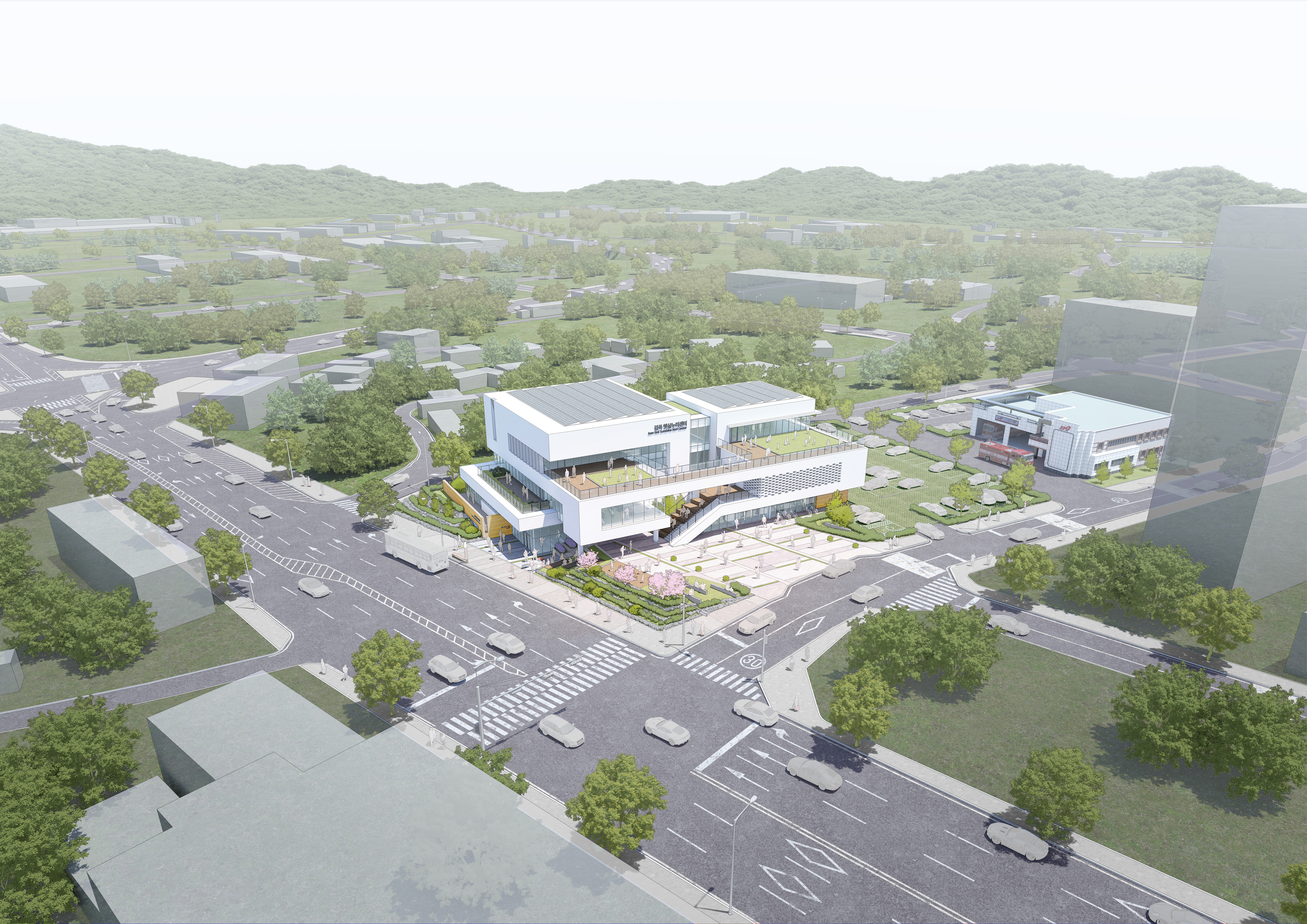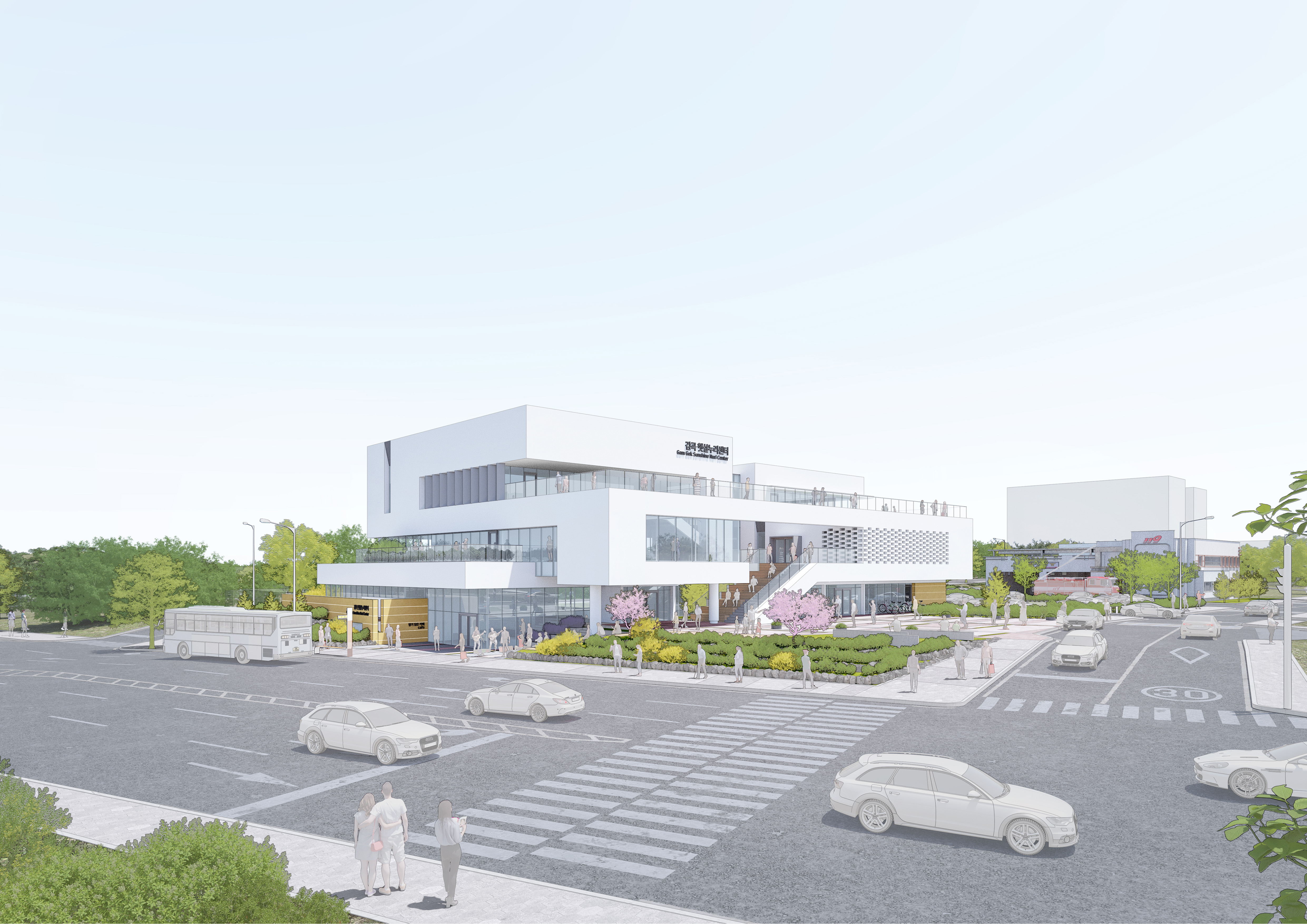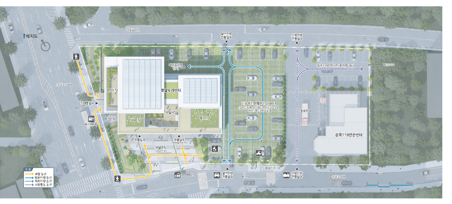 햇살누리센터는 남향 배치를 원칙으로 하며, 119안전센터와의 사이에는 다목적공간으로 활용 가능한 활력마당을 배치한다. 전면도로에 연접한 진입마당에서는 행정복지센터와 주민자치센터로 직접 진입이 가능하고, 버스정류장에서는 향기 담음카페로의 진출입이 가능하도록 고려했다. 또한 북측에는 직원들을 위한 별도의 출입구와 주차장을 배치하였다.