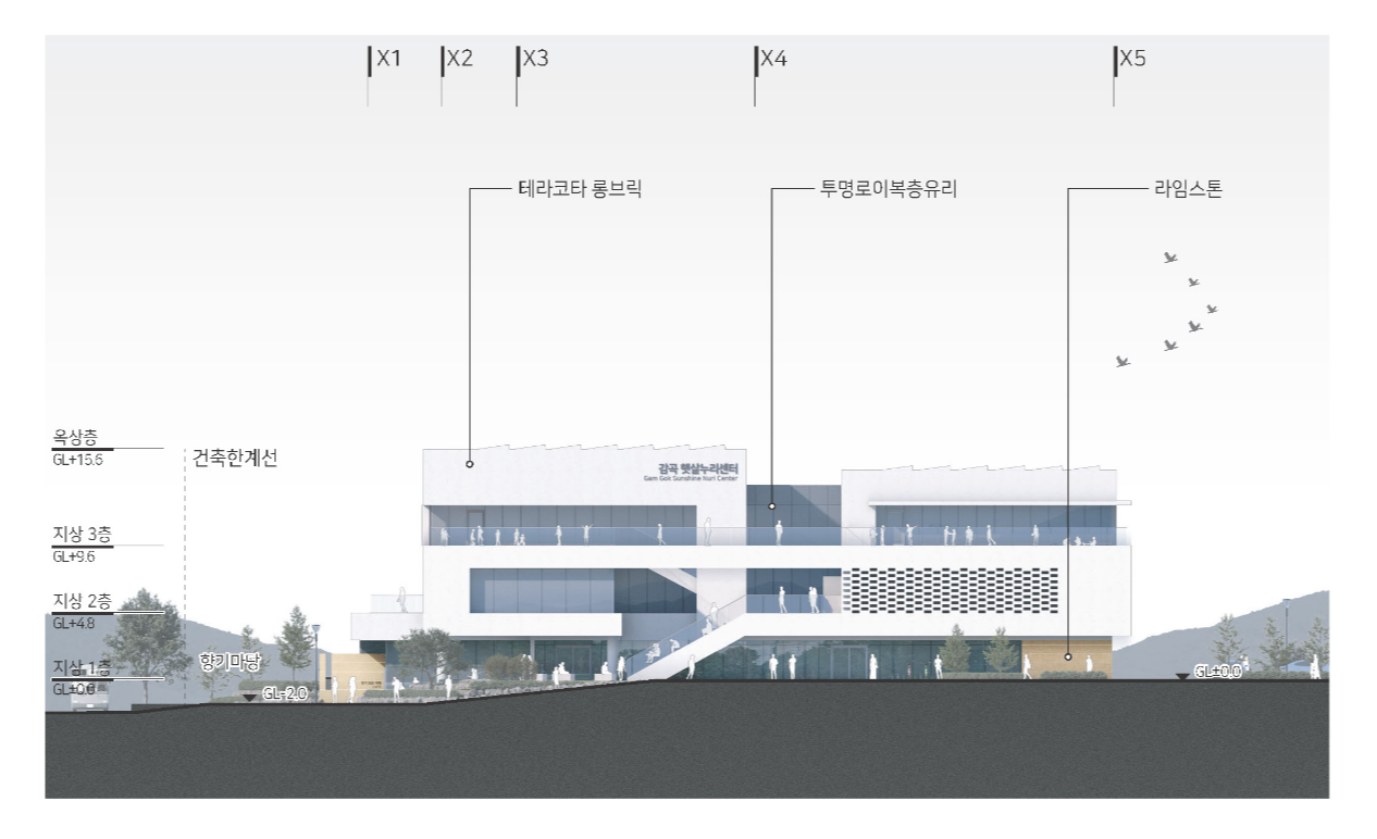 | 감곡 햇살누리센터 발주자 | 음성군 균형개발과 설계팀 | 박홍철, 김중근, 조상준, 노동수, 홍진욱, 오지호 대지위치 | 충청북도 음성군 감곡면 오향리 주용도 | 공공청사, 주민공동이용시설 대지면적 | 6,233.00㎡ 건축면적 | 1,431.09㎡ 연면적 | 3,242.69㎡ 건폐율 | 22.96% 용적률 | 47.21% 규모 | B1F - 3F 구조 | 철근콘크리트구조 마감 | 테라코타 롱브릭, 투명 로이복층유리 |