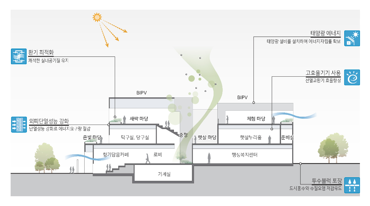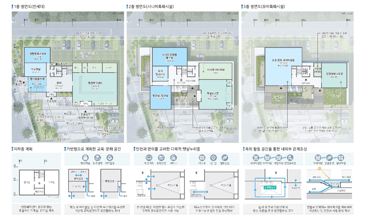 이용 목적에 따른 공간별 영역을 분리하고, 세대별 맞춤형 층별 프로그램 조닝과 내·외부가 자연스럽게 연결되는 동선 계획을 해 모두에게 사랑받는 햇살누리센터가 되고자 한다.