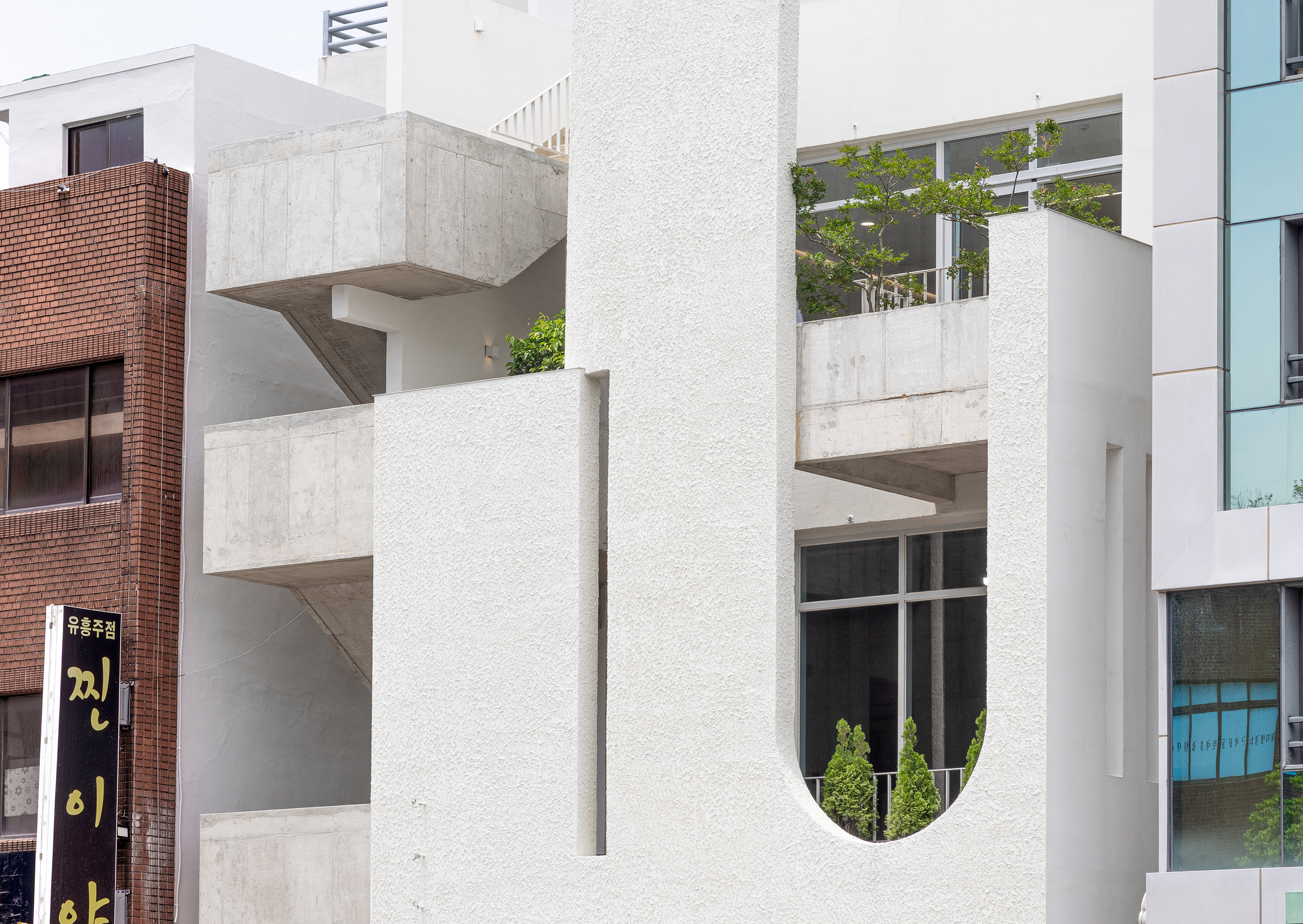 1층에서 4층까지 올라오며 숨겨진 테라스 공간을 느낄 수 있다. 도로에 위치한 도심이지만 절제된 조경으로 안정적이고 편안함을 느낄 수 있다.