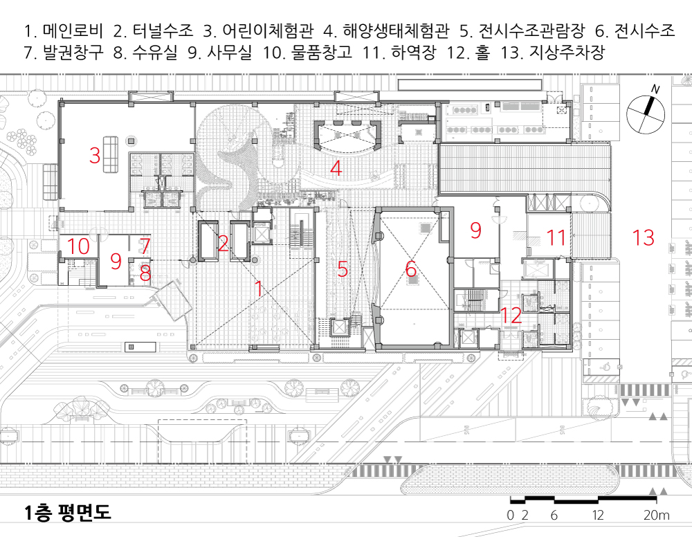이러한 문제의식 속에서 프로젝트는 해양동물의 구조, 치료, 연구, 교육, 홍보 기능을 통합적으로 수행하는 복합 공공시설로 계획됐다. 시민과 함께하는 해양생태 교육과 인식 개선의 장으로 이어지도록 개방적 구조와 통합 동선을 마련했다. 보호수조와 치료·연구 영역, 교육·홍보 전시 영역을 분리하면서도 유기적으로 연결해 각 기능이 독립성과 동시에 상호 소통할 수 있도록 했다. 구조된 해양생물이 회복되는 과정을 시민이 직접 관찰하고 이해할 수 있는 ‘공유 가능한 치유의 공간’도 제안했다.