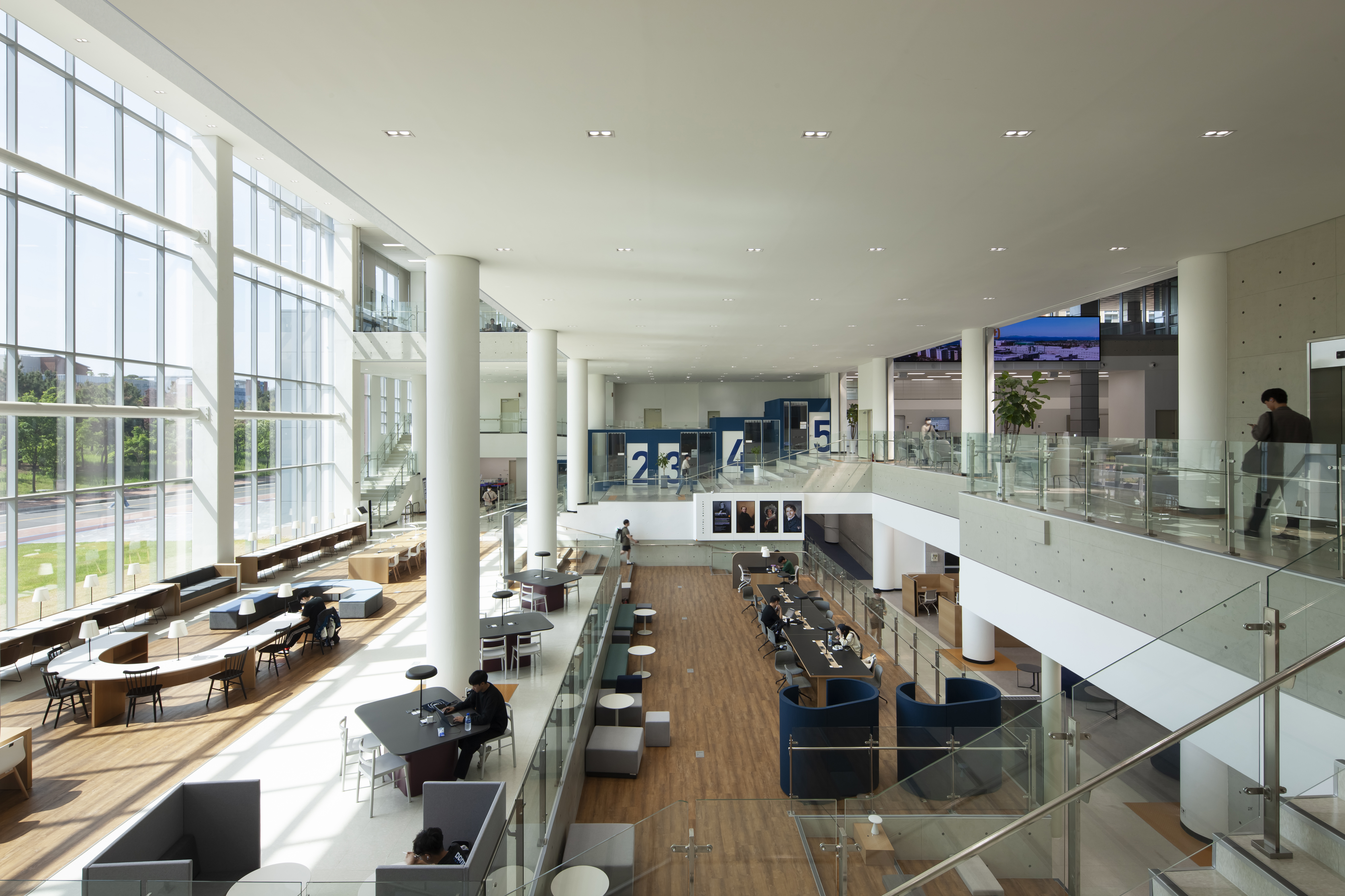 In 2019, ten years after relocating to the Songdo Campus, Incheon National University initiated a design competition to address the shortage of library space, assuming that a separate, standalone building would be required. The winning proposal diverged from this guideline and instead suggested a horizontal extension directly connected to the existing library. The result is a project that seeks to balance campus and city, old and new structures, quiet study and open communication, and areas for movement and areas for staying. The extension is placed opposite the university’s main central plaza, opening the facility toward the city and allowing public access. The former piloti and façade of the existing library are enclosed and incorporated into the new convergence hall, which serves as the primary interface between the old and new spaces. While the overall spatial strategy emphasizes openness and connectivity, areas dedicated to focused research are distributed throughout. The ICT lounge, open lounge, and focus lounge are linked with makerspaces, startup zones, and individual carrels, forming an integrated sequence of study and collaborative environments. Library II thus functions both as an academic facility and as an internal public space shared by faculty, students, and citizens. The fact that a horizontally connected extension was selected in a competition based on guidelines for a detached building raises important questions for future public-building planning and design competition practices.