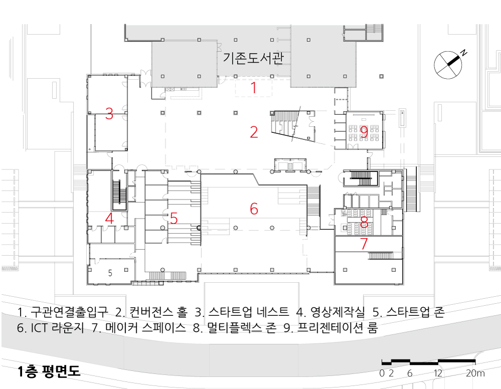 Reflecting the dynamics of a hyper-connected era, The Irumgwan presents a new concept of a library where entrepreneurship, production, learning, and play coexist. The upper extension opens above the ICT Lounge—situated beside the existing stepped plaza—and forms a sequence of interconnected spaces supporting entrepreneurship, media creation, and convergence-based activities. Within the open hall and atrium, visual connections and overlapping movements allow users to linger, exchange ideas, and naturally share experiences. The Irum-gwan becomes more than a repository of knowledge; it is a creative platform where thinking, imagination, collaboration, and experimentation are woven together—positioning itself as a new academic center shaped by the evolving culture of today’s universities.