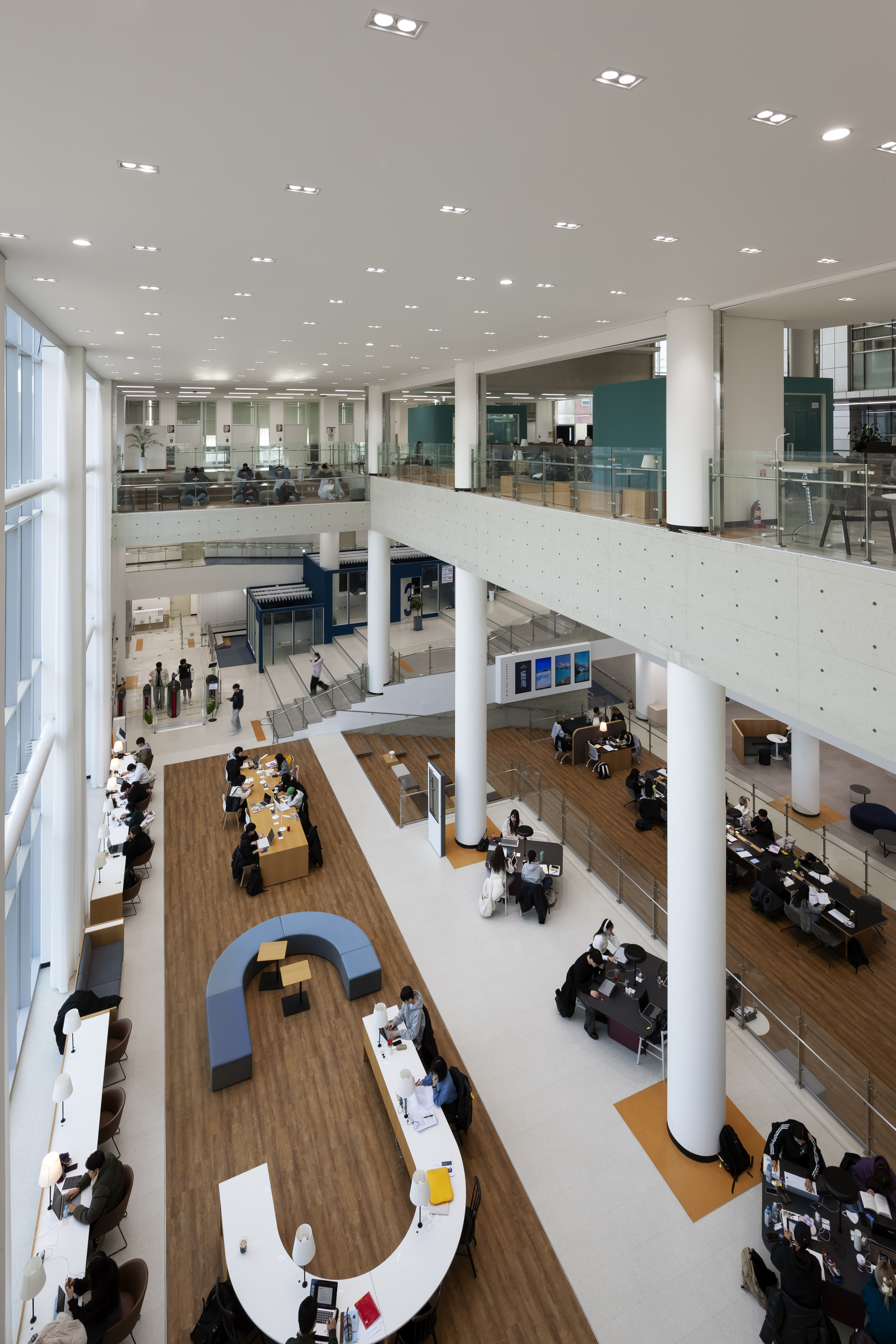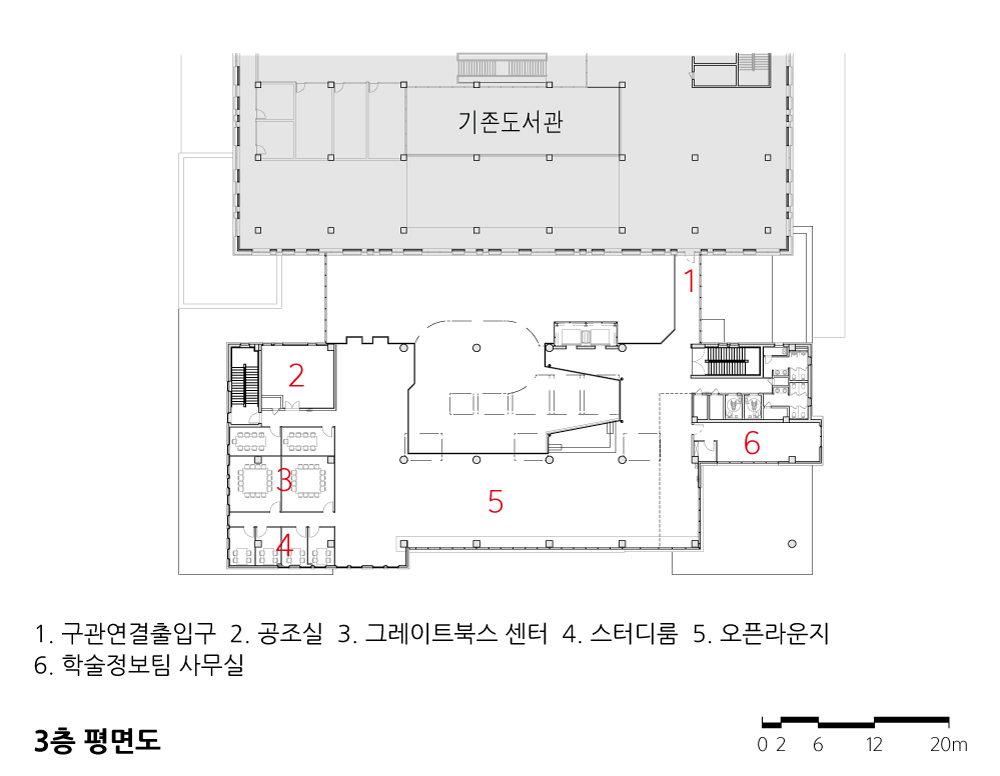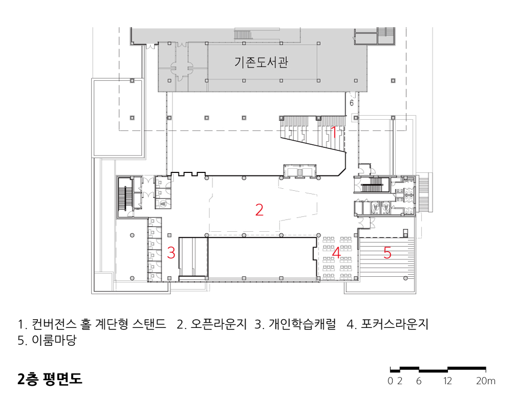 증축 도서관은 기존 도서관의 필로티 하부와 계단 광장을 적극적으로 활용하여, 수평과 수직의 흐름이 교차하는 입체적 공간 구조를 형성하였다. 기존 도서관과 연결되는 중앙 컨버전스 홀에는 계단형 스탠드를 배치하여, 전시·강연·공연 등 다양한 행사가 자연스럽게 이루어질 수 있도록 계획하였다. 층과 층이 시각적·공간적으로 연속되는 구조로 개별공간이 이동과 시선, 생각과 경험이 교차하는 다층적 장으로 확장된다. 그 결과, 도서관은 단순한 학습의 장소를 넘어 사유와 만남, 창의적 교류가 살아 숨 쉬는 대학의 열린 광장으로 자리하게 된다.