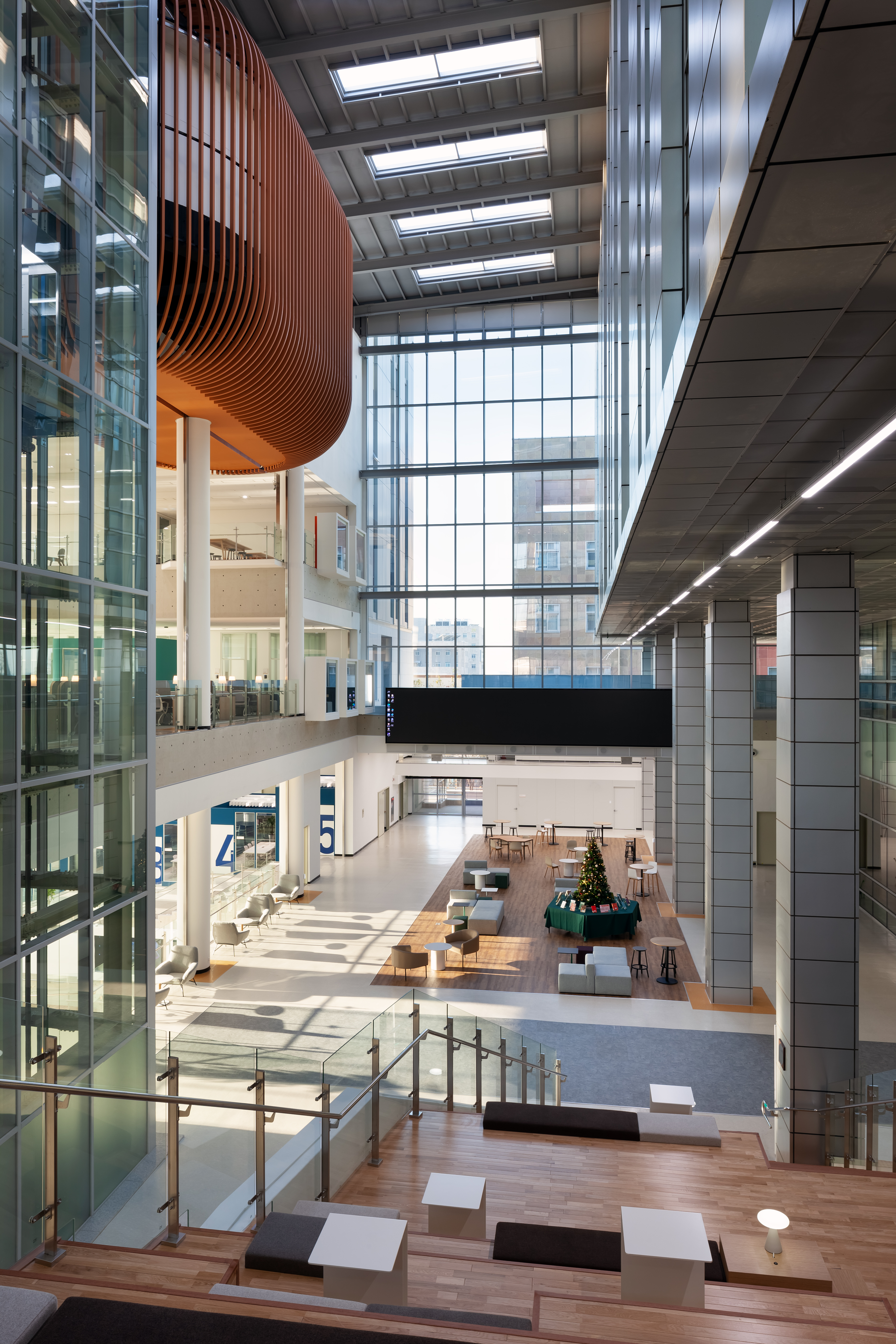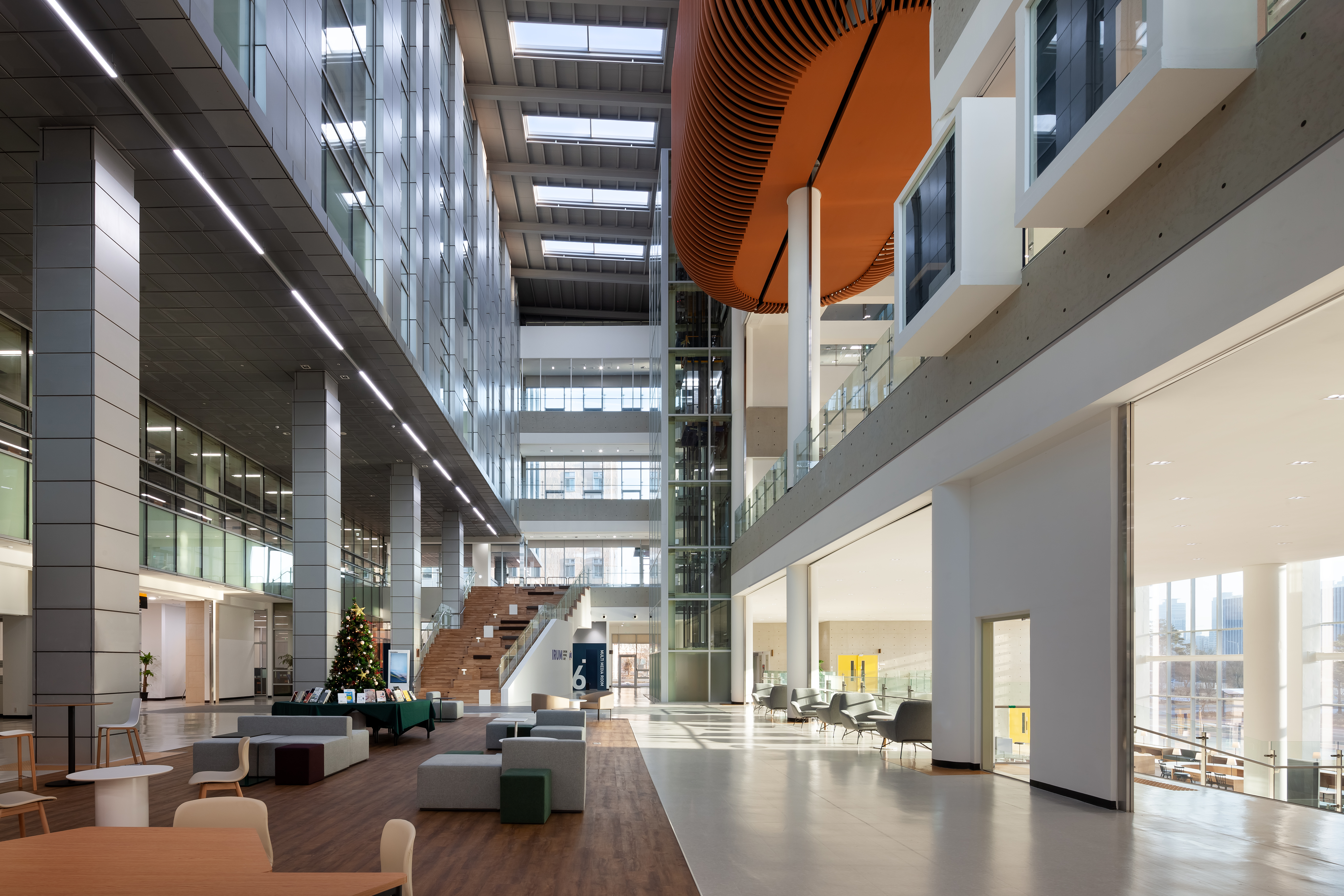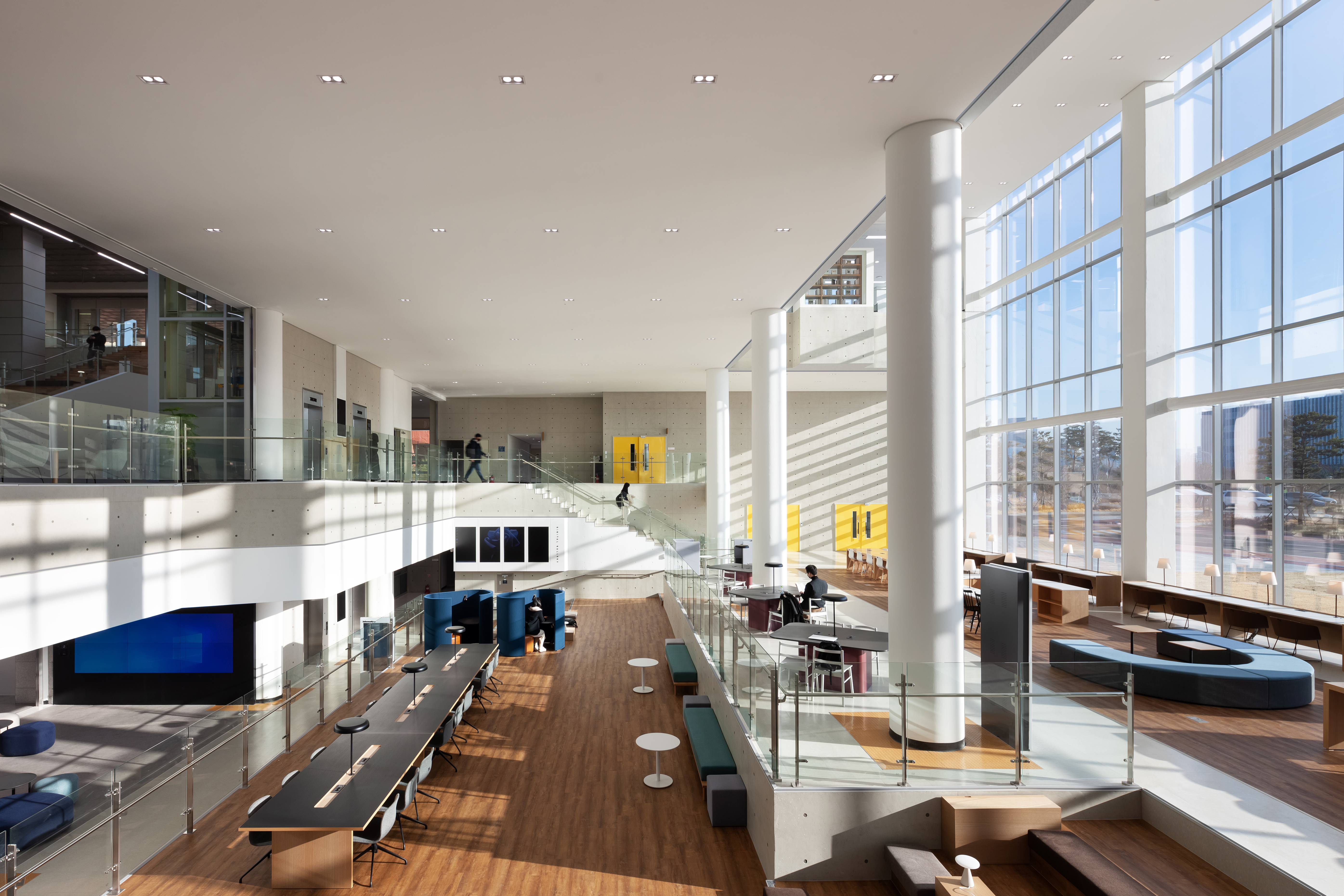 증축 도서관은 기존 도서관의 필로티 하부와 계단 광장을 적극적으로 활용하여, 수평과 수직의 흐름이 교차하는 입체적 공간 구조를 형성하였다. 기존 도서관과 연결되는 중앙 컨버전스 홀에는 계단형 스탠드를 배치하여, 전시·강연·공연 등 다양한 행사가 자연스럽게 이루어질 수 있도록 계획하였다. 층과 층이 시각적·공간적으로 연속되는 구조로 개별공간이 이동과 시선, 생각과 경험이 교차하는 다층적 장으로 확장된다. 그 결과, 도서관은 단순한 학습의 장소를 넘어 사유와 만남, 창의적 교류가 살아 숨 쉬는 대학의 열린 광장으로 자리하게 된다.