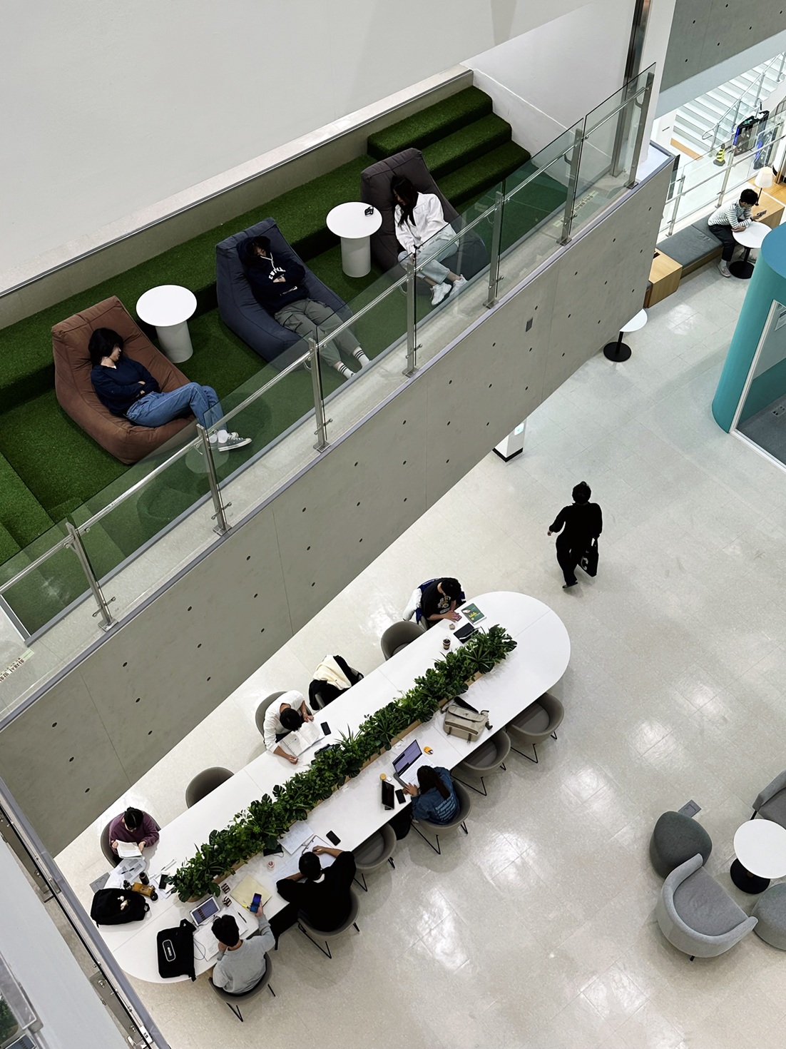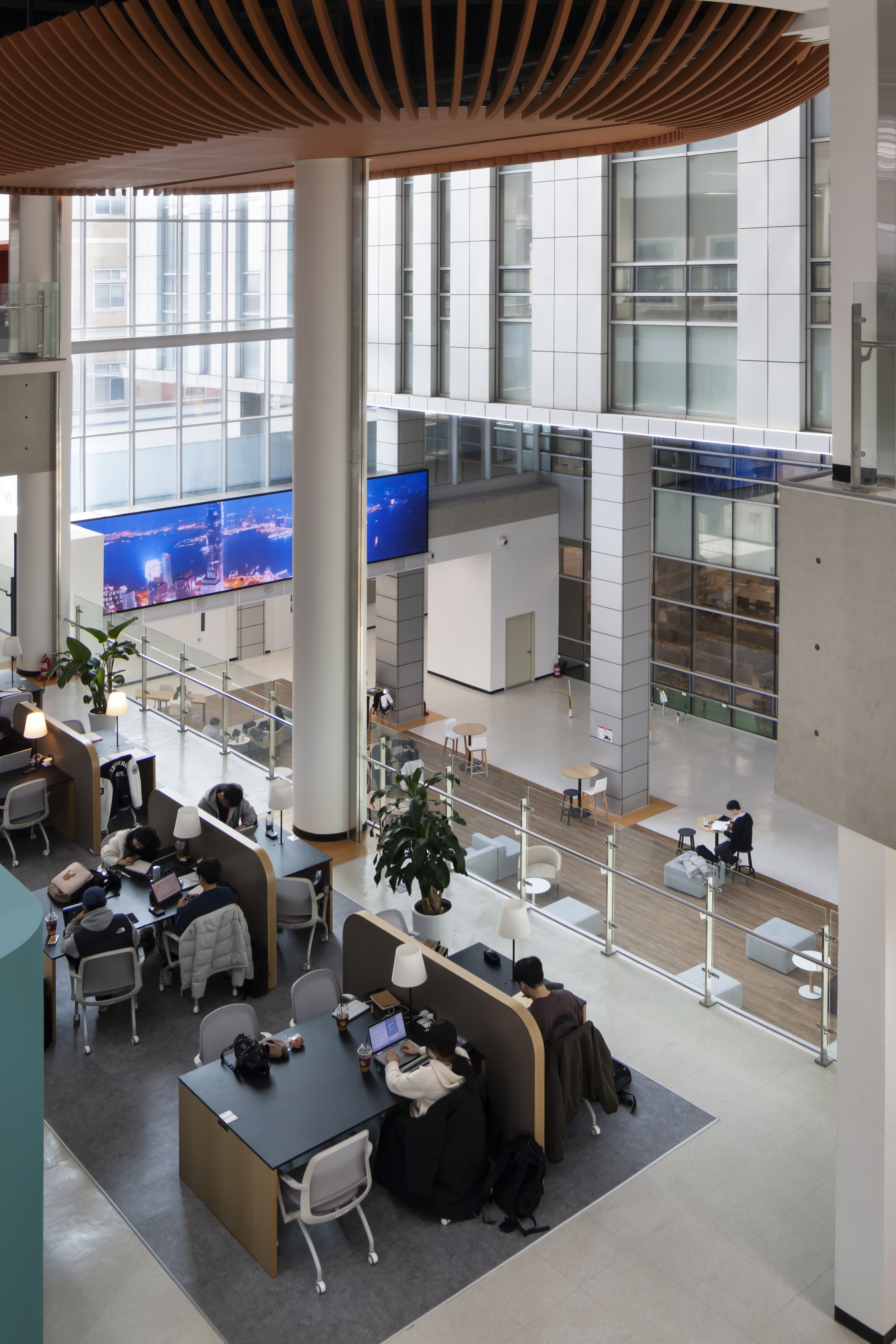The Second Library (Irum-gwan) breaks away from the conventional silent reading room. Instead, it is reconfigured as an open, unpartitioned space where ambient white noise becomes a natural backdrop. Students are free to linger, explore, talk, and think. The visually connected floors and lounges form a multi-dimensional landscape where movement, study, contemplation, and conversation are interwoven. Here, the library is no longer a place of enforced quiet but a dynamic intellectual platform—alive with interaction, curiosity, and creative energy.