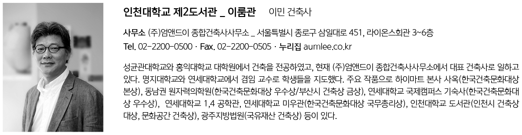 | 인천대학교 제2도서관 _ 이룸관 설계자 | 이민 건축사_ (주)엄앤드이 종합건축사사무소 시공자 | (주)바림종합건설 건축주 | 국립대학법인 인천대학교 감리자 | 신성종합건축사사무소(주) 설계팀 | 김선덕, 김용우, 정호철, 김성실, 김숙희(컬러코디네이터) 설계의도 구현 | (주)엄앤드이 종합건축사사무소 대지위치 | 인천광역시 연수구 송도동 주요용도 | 교육연구시설(대학교) 대지면적 | 456,805.90㎡ 건축면적 | 2,438.53㎡ 연면적 | 7,510.77㎡ 건폐율 | 16.23% 용적률 | 53.46% 규모 | B1F - 4F 구조 | 철근콘크리트구조, 철골구조 외부마감재 | 금속판넬, 테라코타 내부마감재 | 노출콘크리트 설계기간 | 2019. 08 – 2020. 04 공사기간 | 2020. 11 – 2021. 12 사진 | 박영채 구조분야 | 이강훈 _ 티섹구조엔지니어링 기계설비분야 | 강기호 _ 한국설비(주) 전기·소방분야 | 이정호 _ (주)하이텍엔지니어링 인테리어 설계 | 변준우 _ (주)네트콤 |