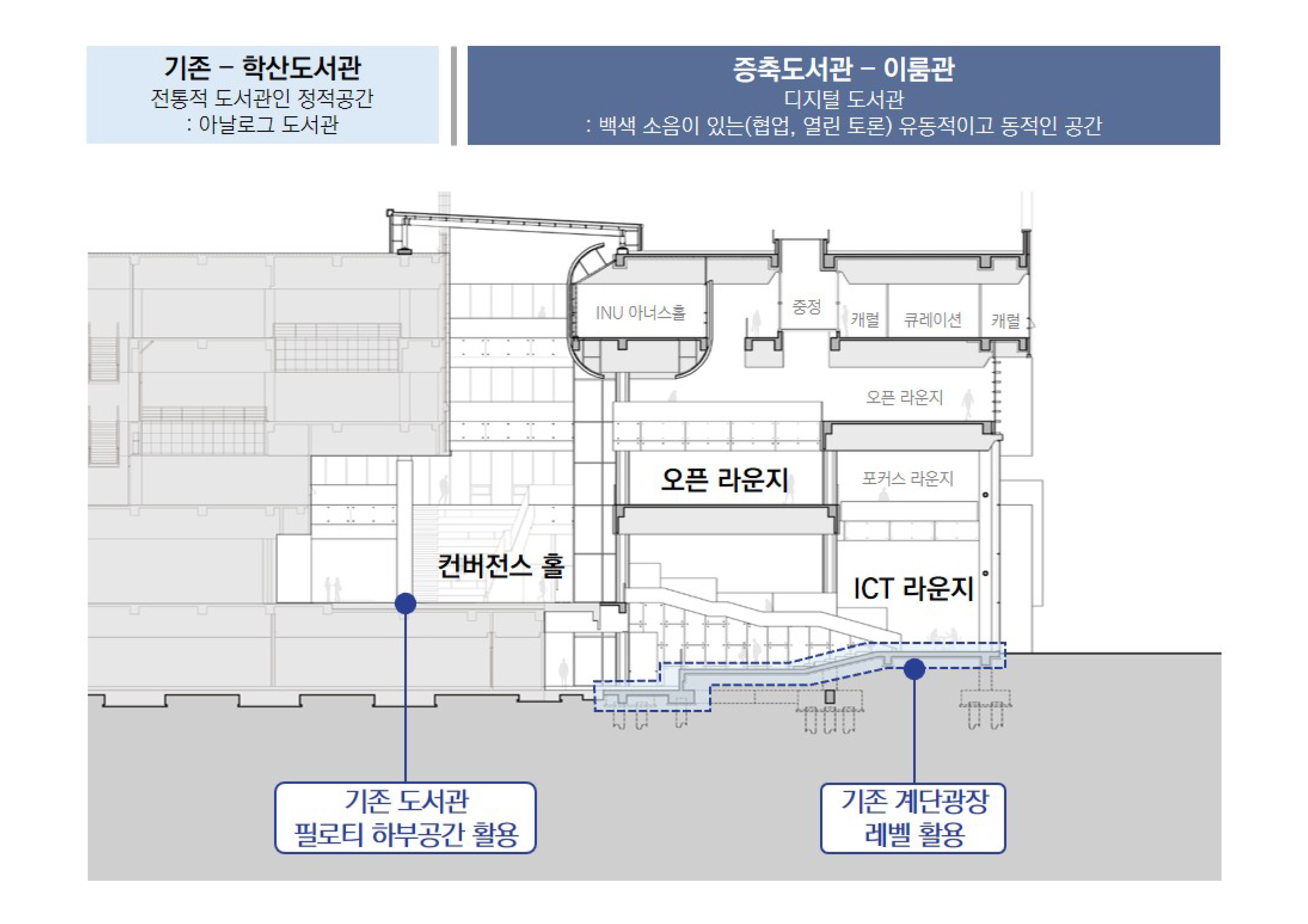 증축 도서관은 기존 도서관의 필로티 하부와 계단 광장을 적극적으로 활용하여, 수평과 수직의 흐름이 교차하는 입체적 공간 구조를 형성하였다. 기존 도서관과 연결되는 중앙 컨버전스 홀에는 계단형 스탠드를 배치하여, 전시·강연·공연 등 다양한 행사가 자연스럽게 이루어질 수 있도록 계획하였다. 층과 층이 시각적·공간적으로 연속되는 구조로 개별공간이 이동과 시선, 생각과 경험이 교차하는 다층적 장으로 확장된다. 그 결과, 도서관은 단순한 학습의 장소를 넘어 사유와 만남, 창의적 교류가 살아 숨 쉬는 대학의 열린 광장으로 자리하게 된다.