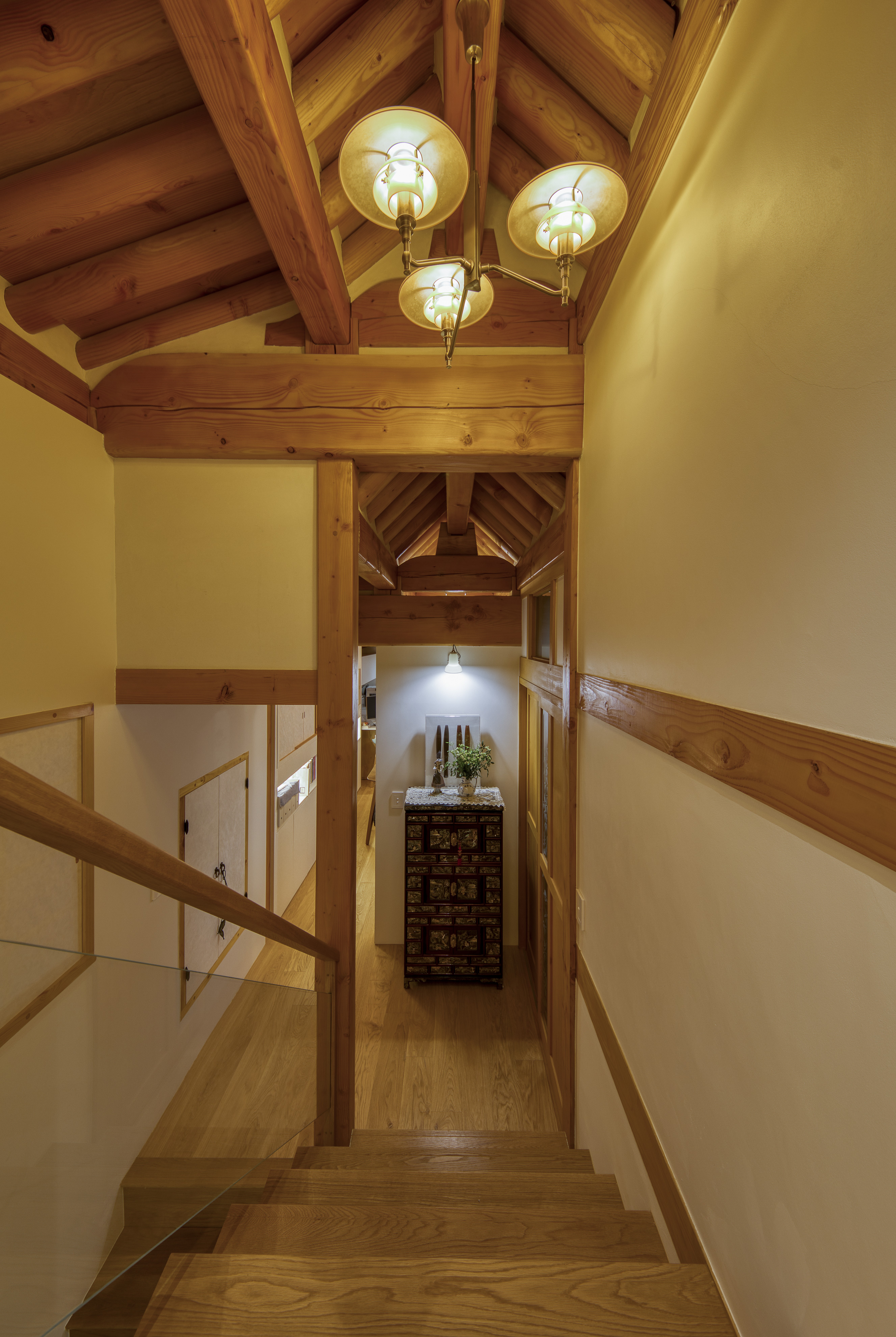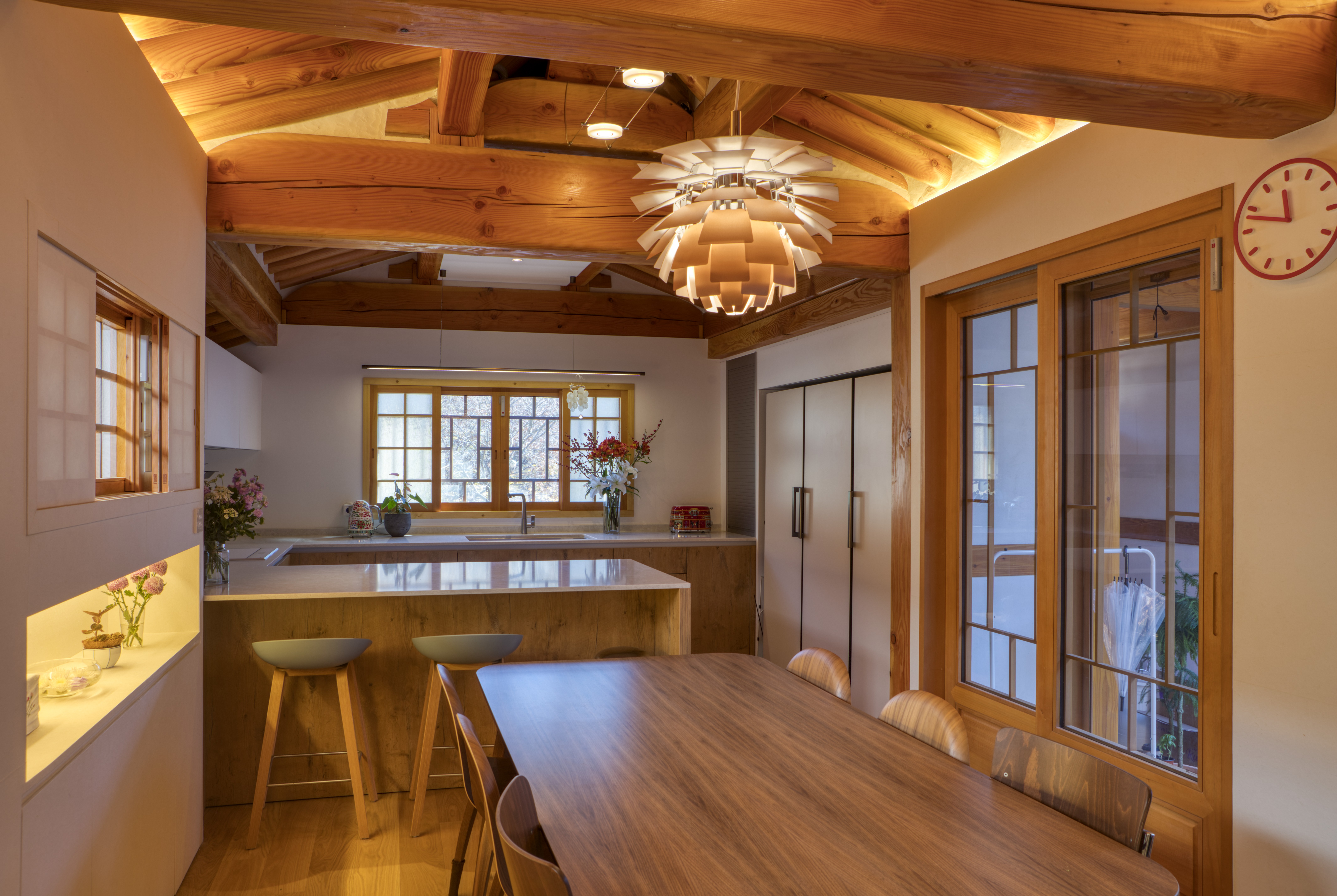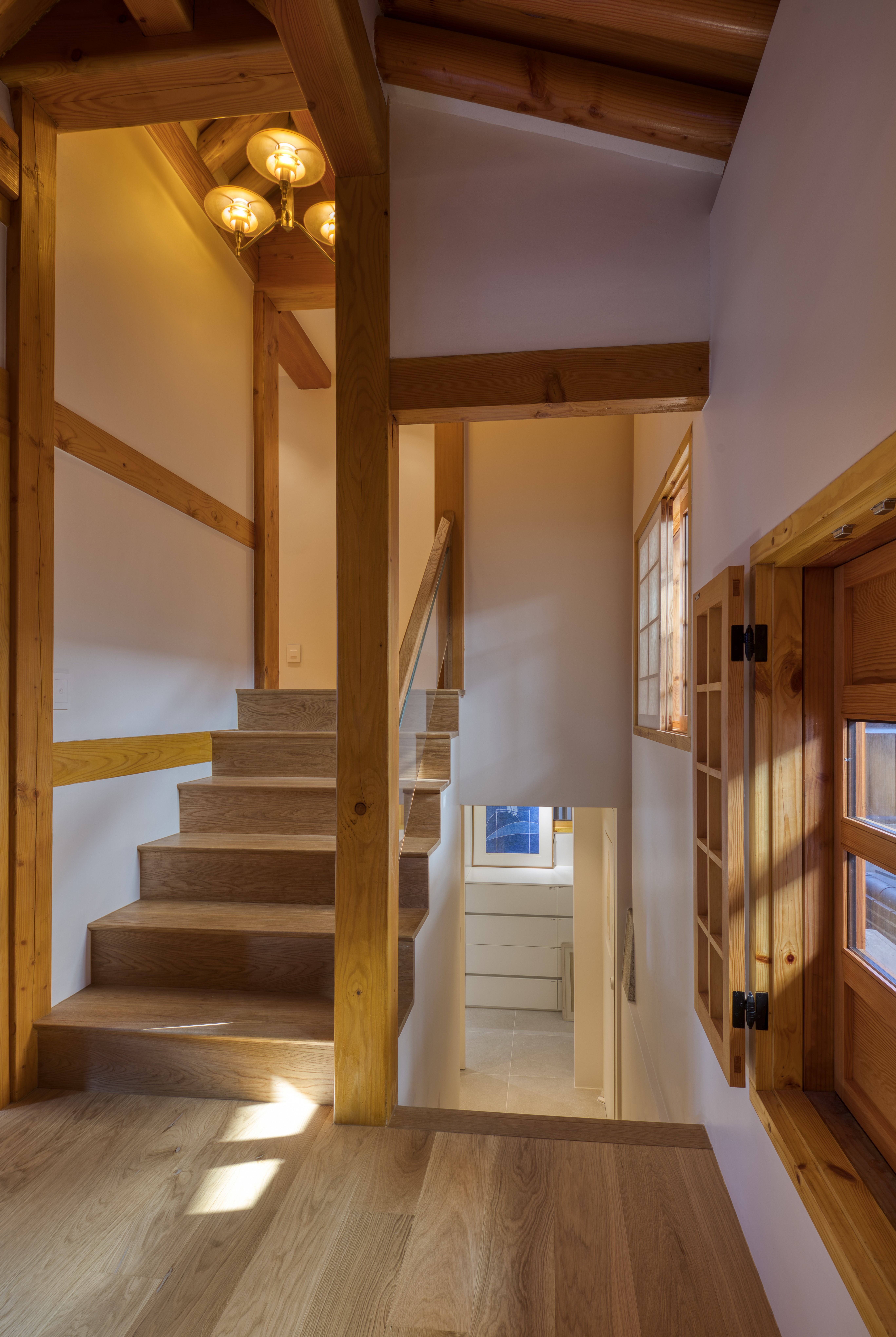 The numaru, a traditional elevated wooden platform, is the focal point of the house and offers its best views. To maintain privacy from the neighboring house, operable traditional wooden panels were installed, enabling the resident to control openness while preserving depth within the space. The numaru opens directly toward the ridges of Bukhansan, allowing the residents to enjoy the changing scenery from inside the home.