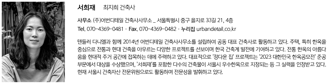 | 서희재(曙熙齋) 설계자 | 최지희 건축사_ (주)어번디테일 건축사사무소 시공자 | 김희진 건축주 | 김희진 공동설계 | 성수진(AIA) _ Studio BA 감리자 | (주)어번디테일 건축사사무소 설계팀 | 텐들러 다니엘, 이상훈 설계의도 구현 | (주)어번디테일 건축사사무소 대지위치 | 서울특별시 은평구 진관동 주요용도 | 단독주택 대지면적 | 165.00㎡ 건축면적 | 71.45㎡ 연면적 | 98.49㎡ 건폐율 | 43.30% 용적률 | 59.69% 규모 | 2F 구조 | 한식목구조 외부마감재 | 육송, 한식회미장, 자연석, 한식기와 내부마감재 | 육송, 수성페인트, 한지도배, 타일, 원목마루 설계기간 | 2019. 02 - 2019. 08 공사기간 | 2019. 10 – 2021. 05 사진 | 이상훈 _ Hooxme |