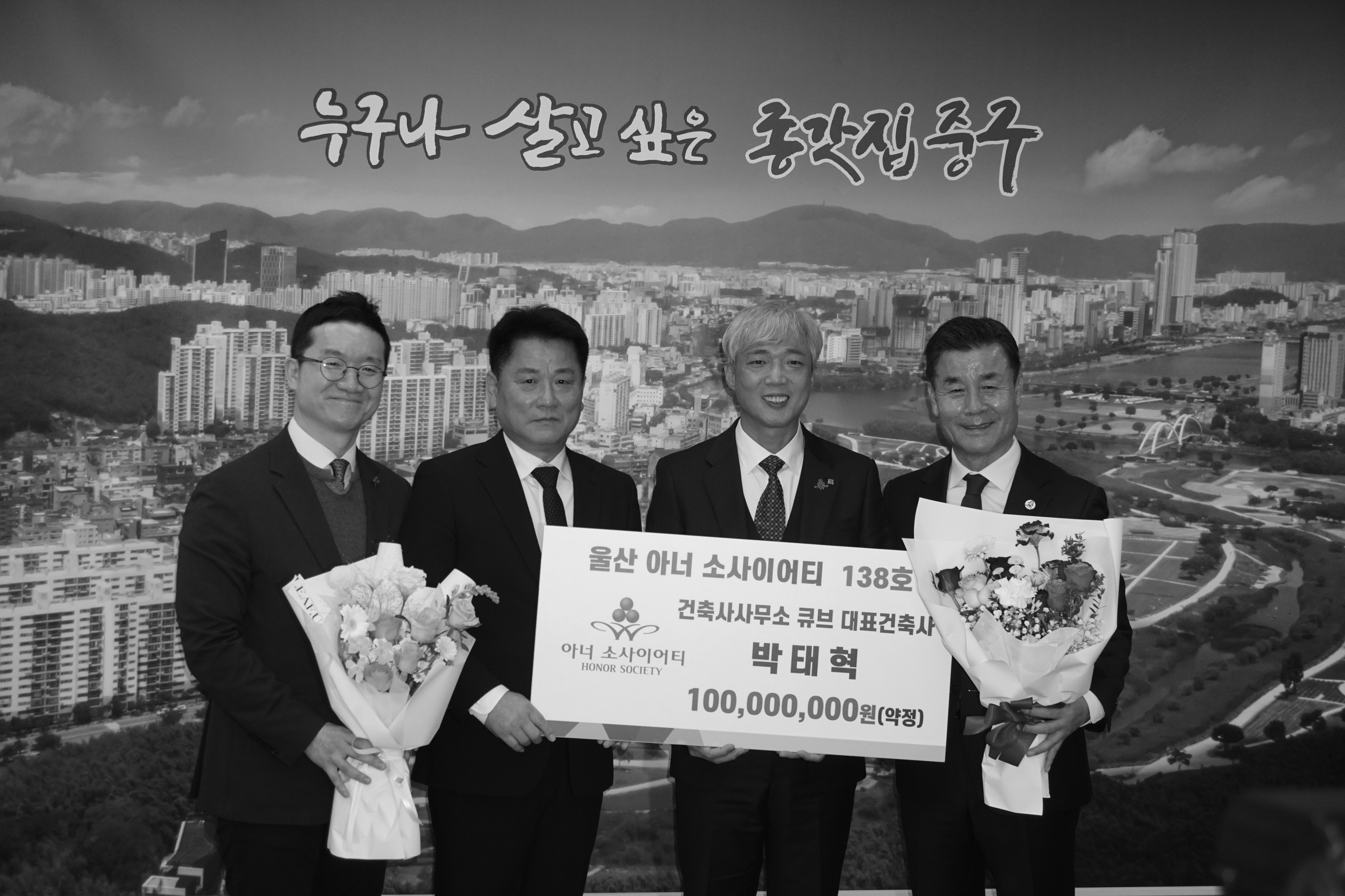울산광역시건축사회 소속 박태혁 건축사(주. 큐브 건축사사무소)는 11월 24일 울산 ‘아너소사이어티’의 138번째 회원에 이름을 올리며 1억 원을 기부하였다. 울산광역시 중구청에서 진행된 가입식은 김영길 중구청장, 울산시건축사회 김경섭 회장, 울산사회복지공동모금회 양호영 사무처장이 참석한 가운데 진행됐다.