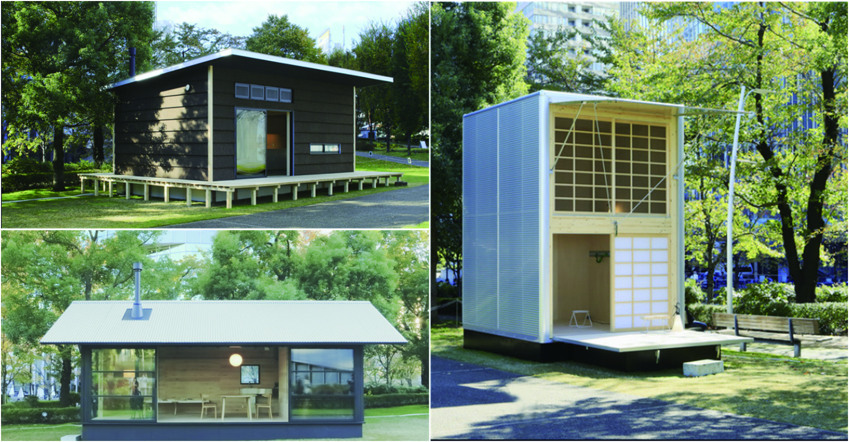 ③ 후카사와 나오토의 오두막_검게 태운 삼나무로 마감했고 커다란 미닫이 유리 패널, 주철 난로, 접이식 침대, 작은 주방 공간, 넓은 사각형 욕조가 있다.