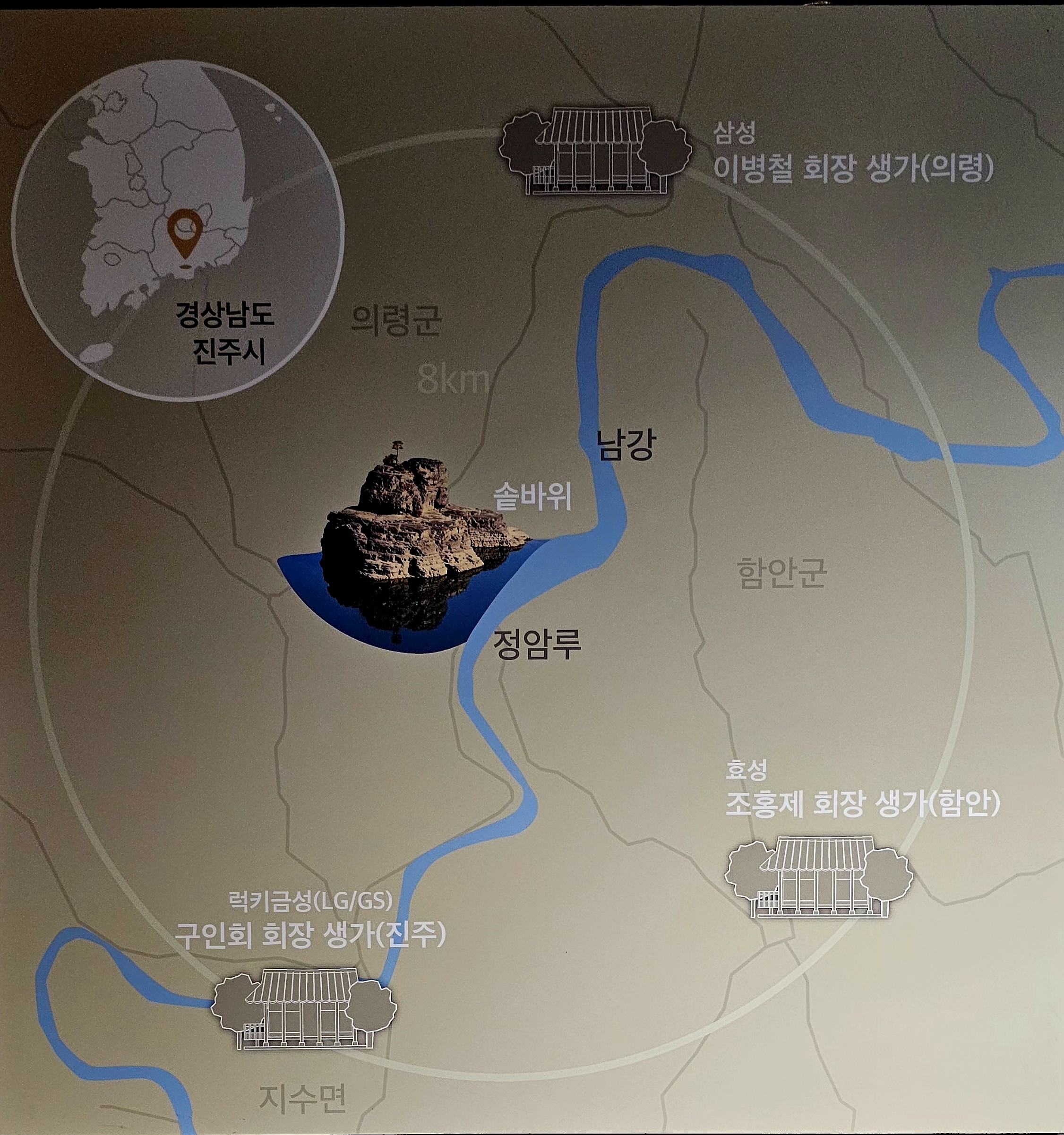 그런데 실제로 이 솥바위를 기점으로 세 갈래 8km 이내에 삼성 이병철(의령), LG구인회(진주), 효성 조홍제(함안)가 태어났다.