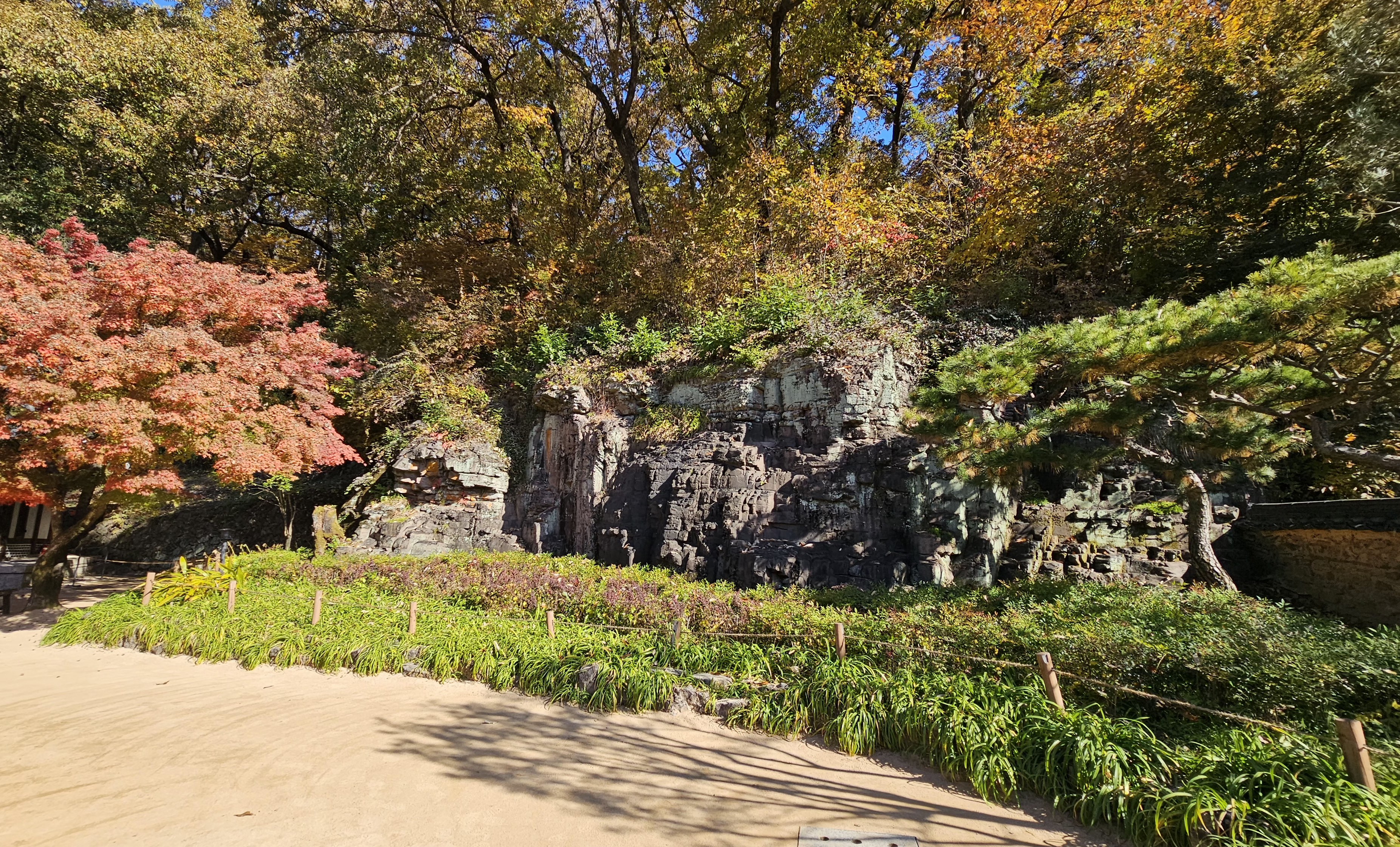 그리고 안채 뒤편으로 병풍처럼 펼쳐진 대나무 숲과 함께 고택을 감싸고 있는 떡바위가 예사롭지 않다. 돈바위라 부르기도 하는 암벽에는 만(卍) 자, 전(田) 자와 거북이 또는 두꺼비 형상 같은 무늬가 있다고 하는데, 숨은 그림 찾기를 하듯 바위 면을 살펴보며 부자의 기운을 받으려는 사람들이 많다. 내가 보기에는 차곡차곡 쌓인 바위가 나락섬을 쌓아 놓은 것으로 보였다. 재물을 상징하는 바위다.