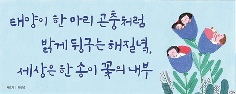 다음의 이미지는 올여름 내내 광화문 교보생명 빌딩에 걸려 있던 글판이다. 채호기 시인의 ‘해 질녘’이라는 시에서 한 구절을 빌려 ‘노을을 바라보며 우리가 살고 있는 이곳이 꽃잎으로 둘러 싸인 아름답고 포근한 세상임을’ 느끼는 마음을 표현하고 있다.
