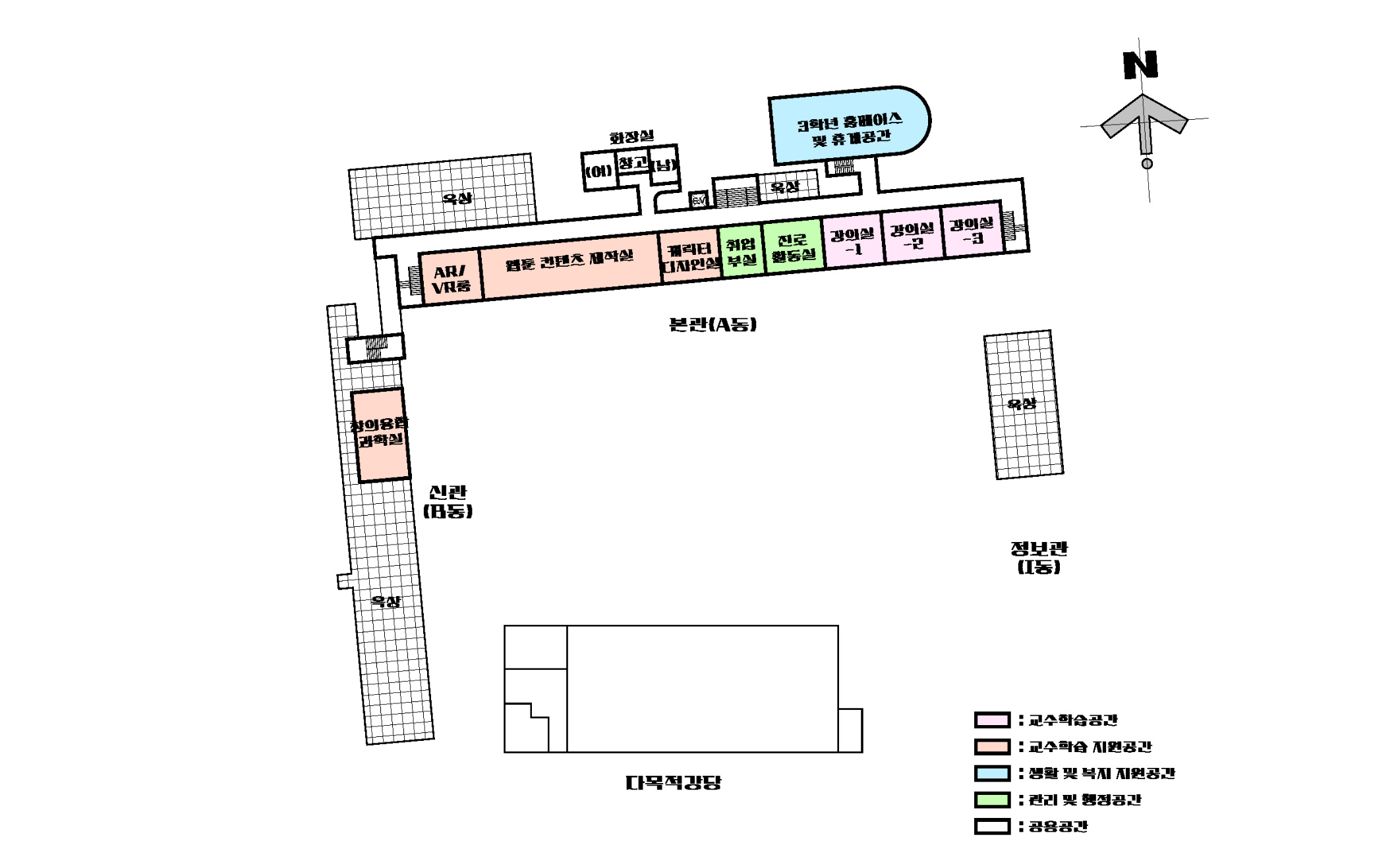 본관, 별관, 생활관 1층 평면 / 다목적강당, 신관, 정보관 : 2층 평면