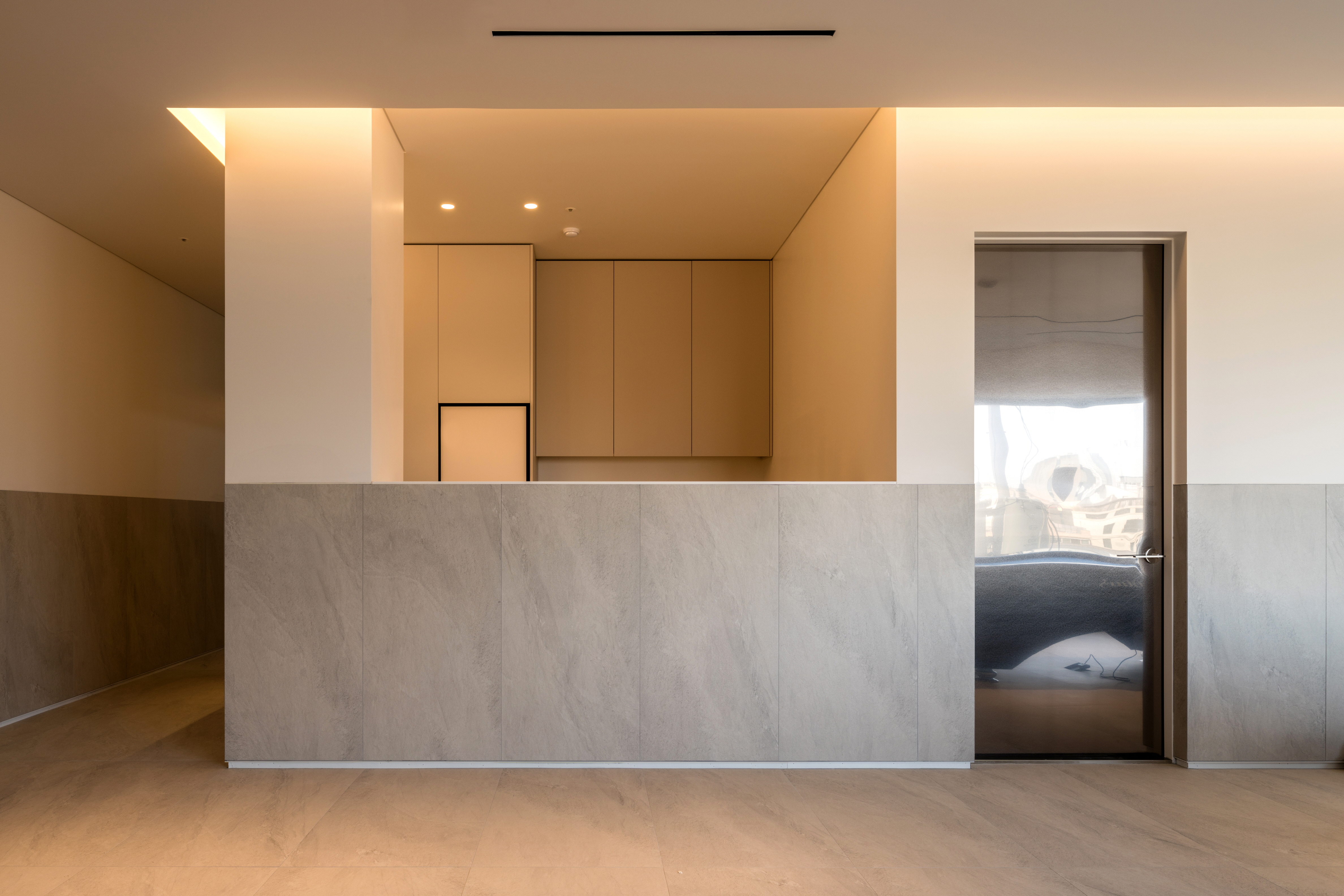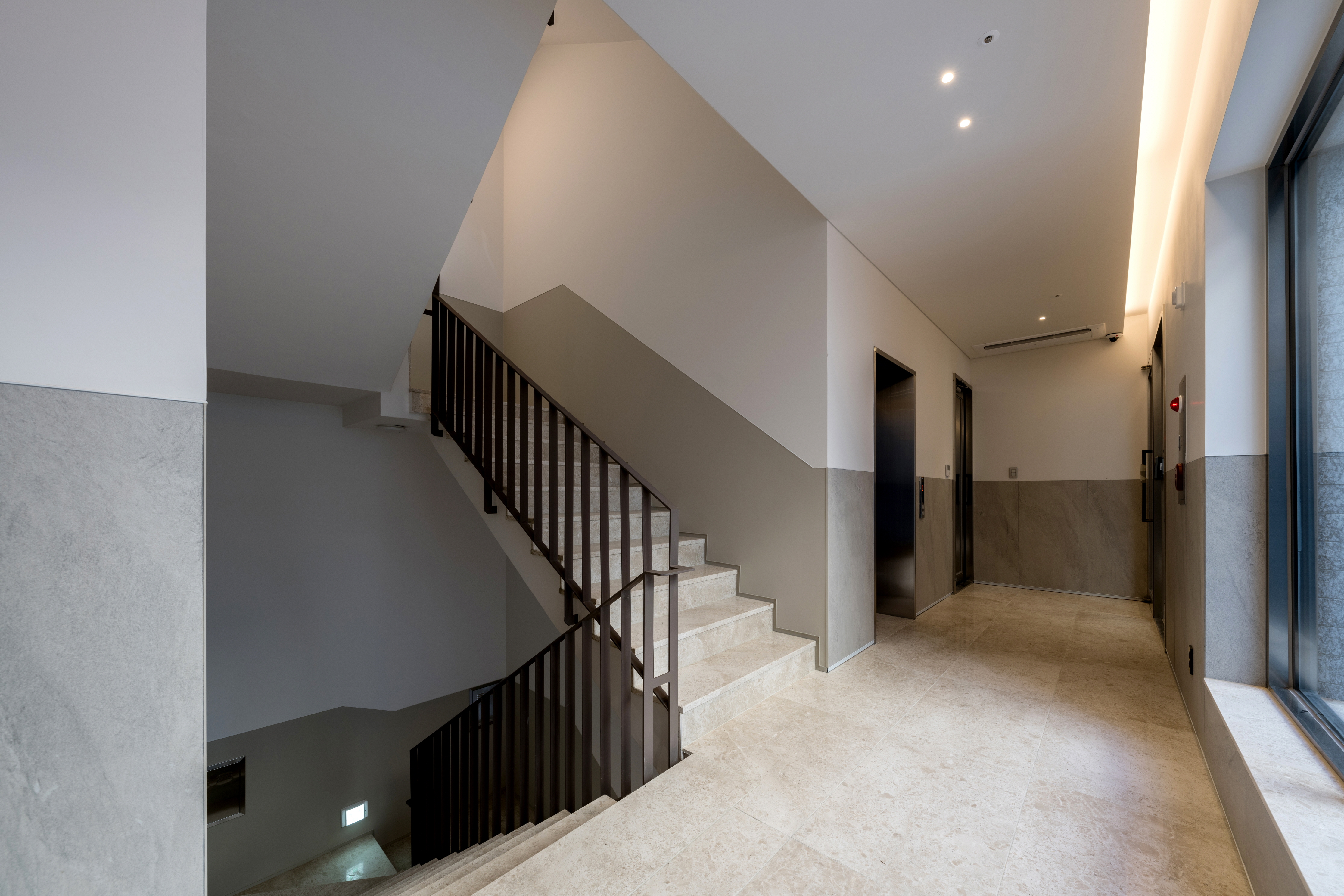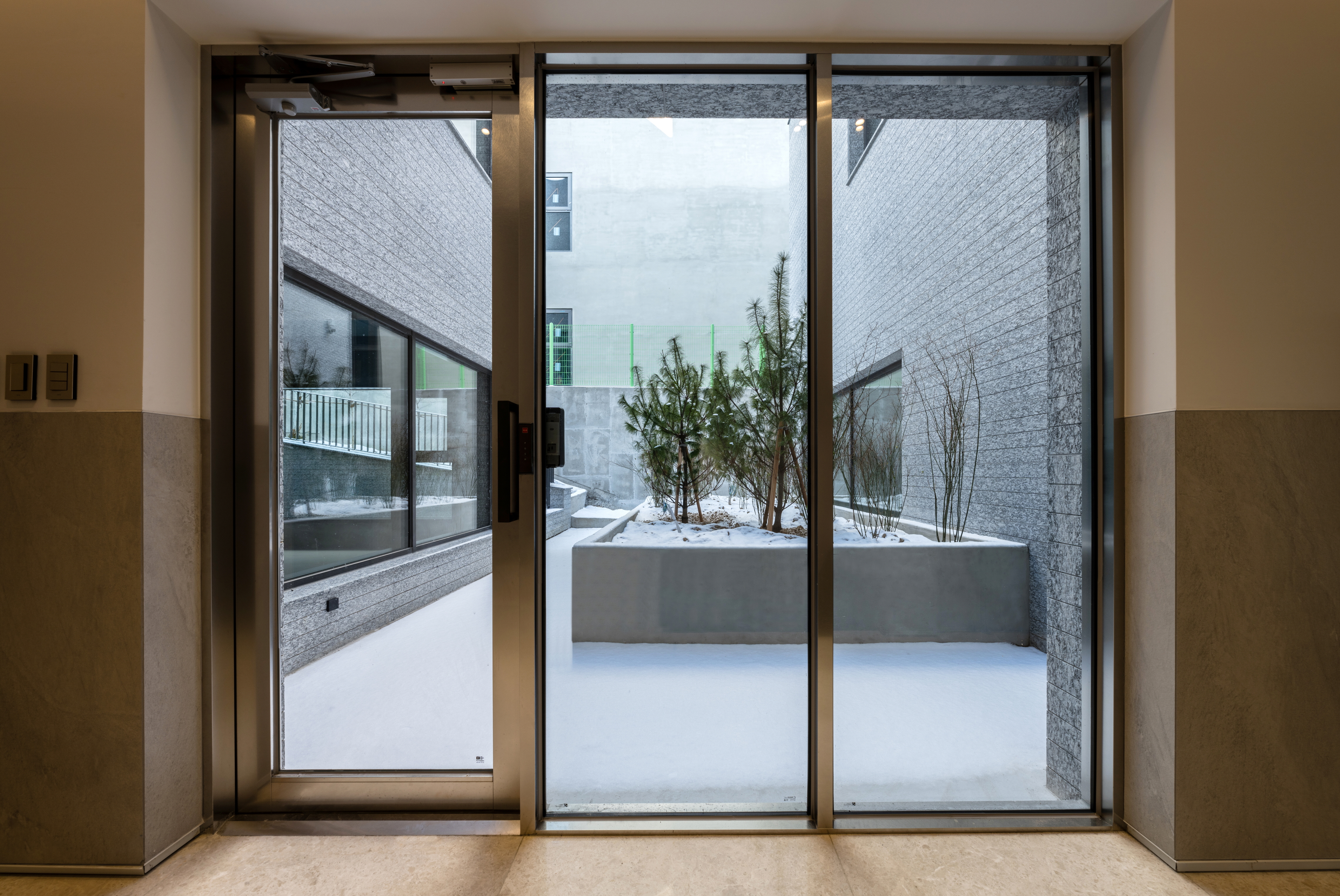 For the exterior, granite panels were cut into various modular joints, with surface finishes applied differently to create variations in the façade. The solid mass conveys a strong architectural presence, while subtle textural variations add a sense of vibrancy.