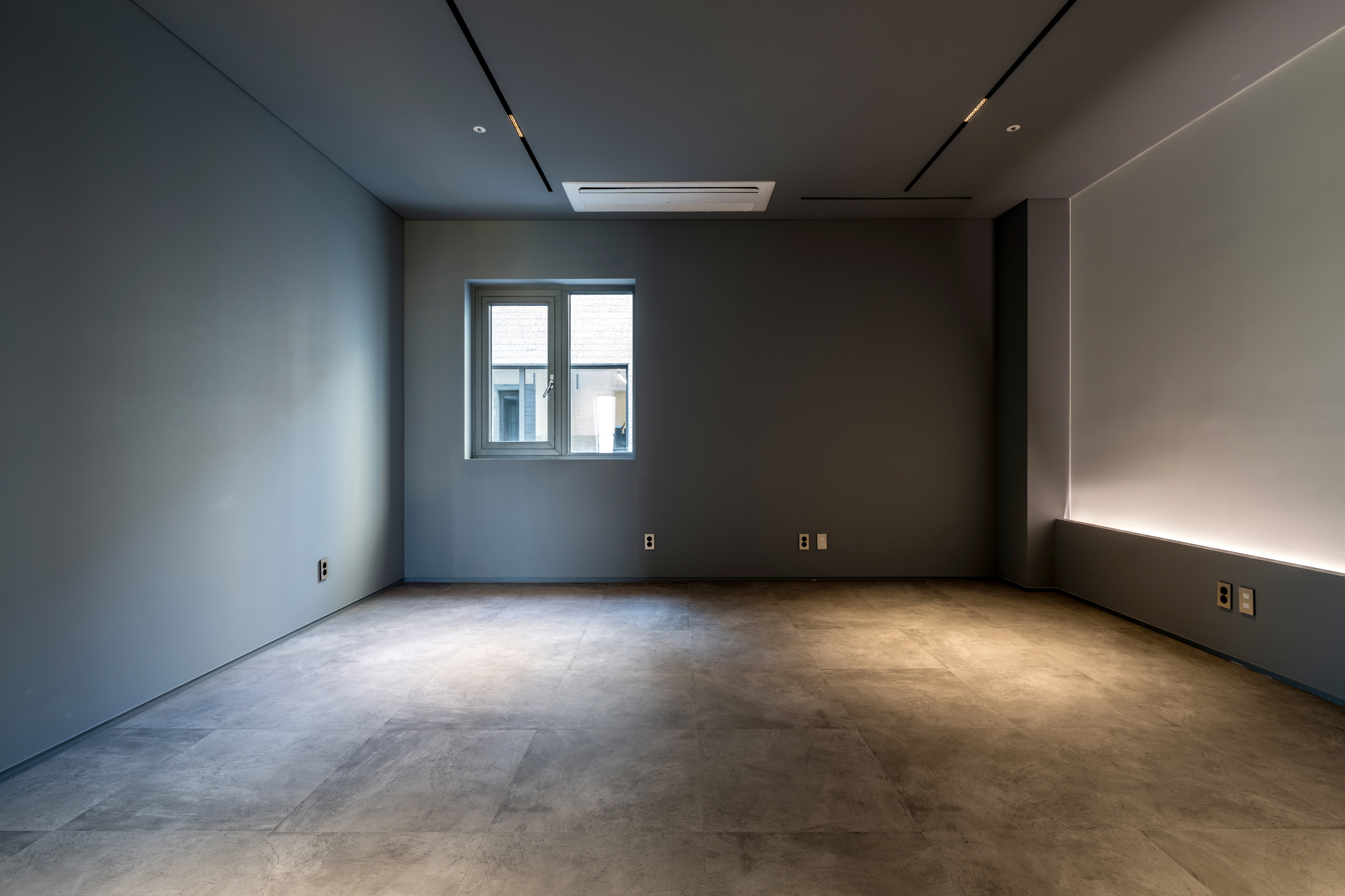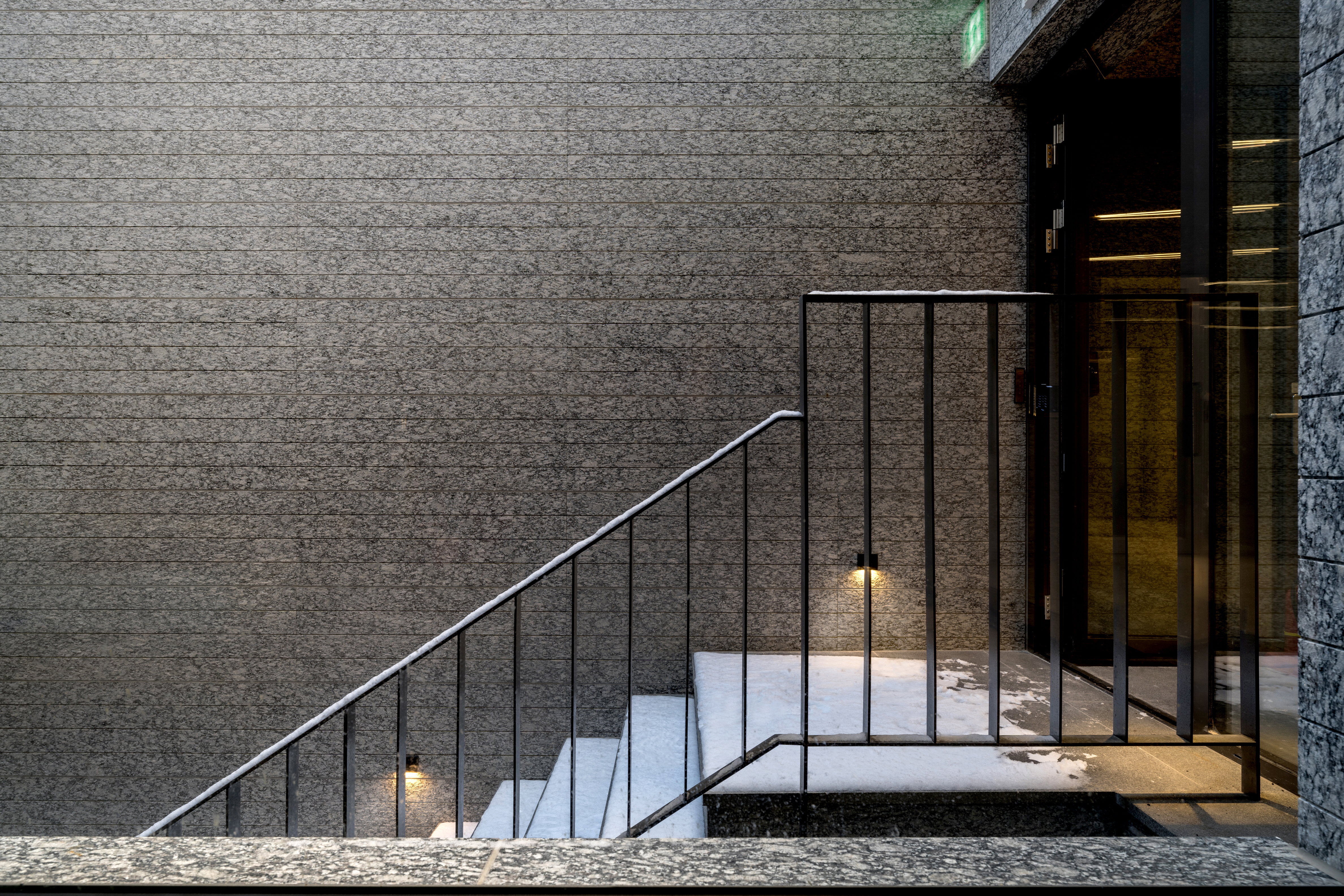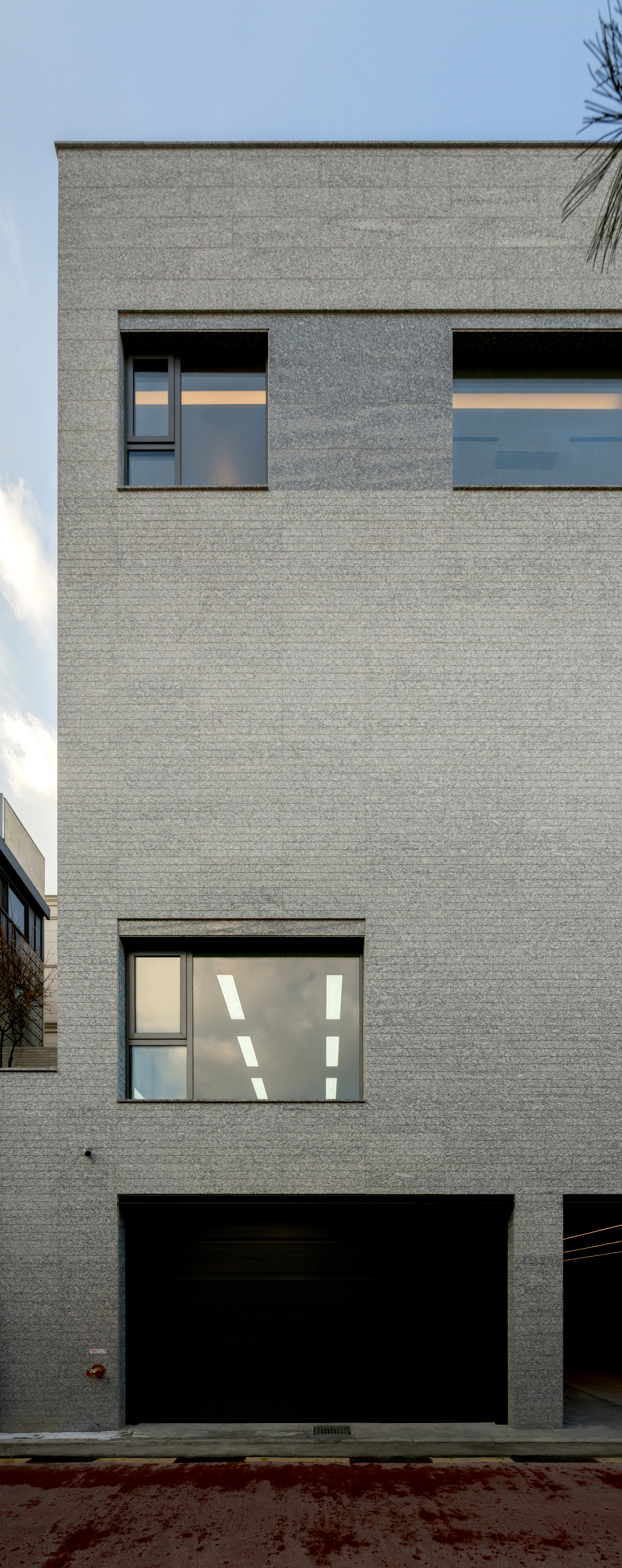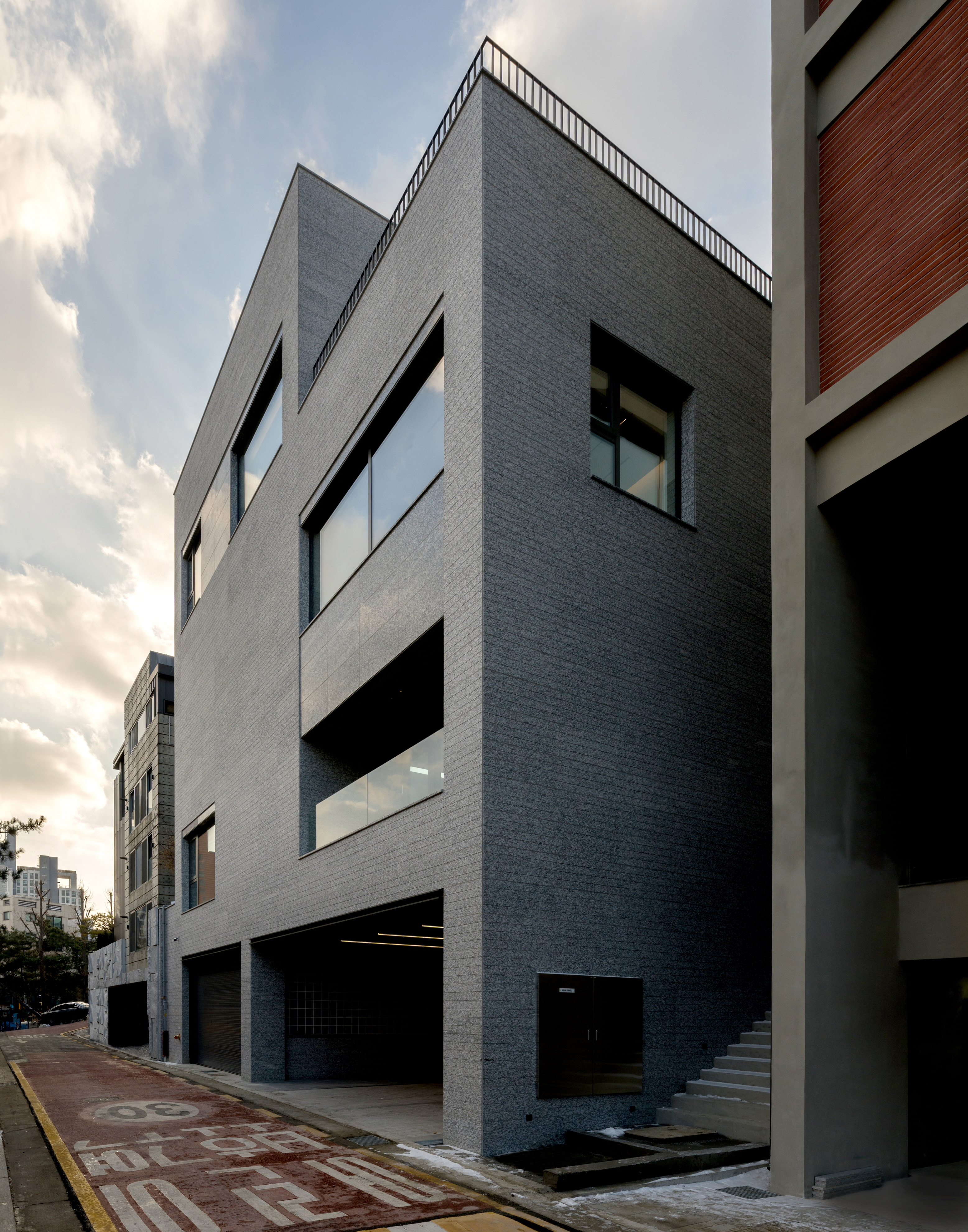 외장재는 화강석 판재를 여러 모듈로 줄눈 커팅을 하고, 표면 마감의 차이를 통해 입면에 변주를 주어 구성하였다. 묵직한 양감을 통해 건축의 존재감을 부여하고, 미시적인 텍스처의 변화를 통해 작은 생동감을 부여했다.