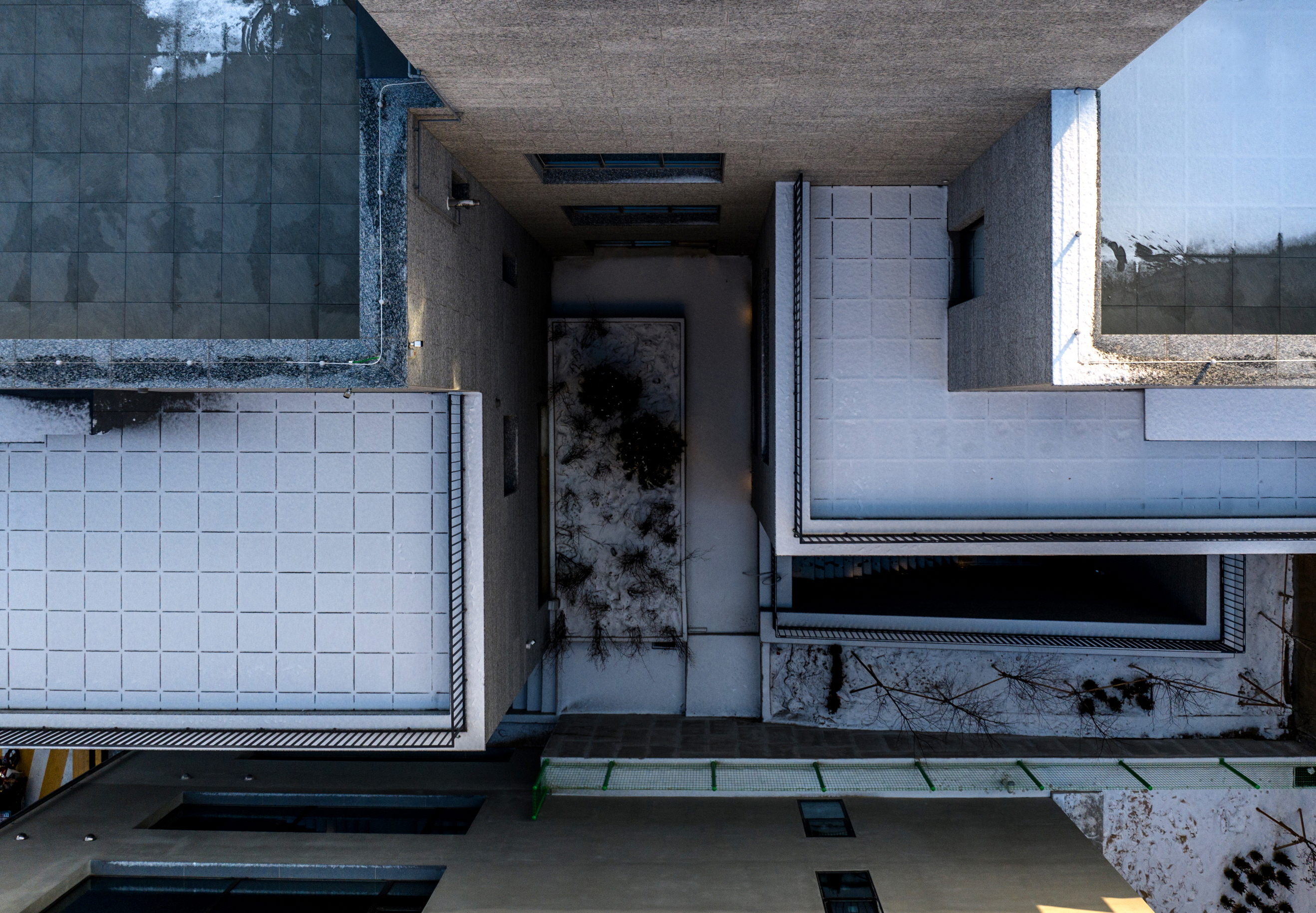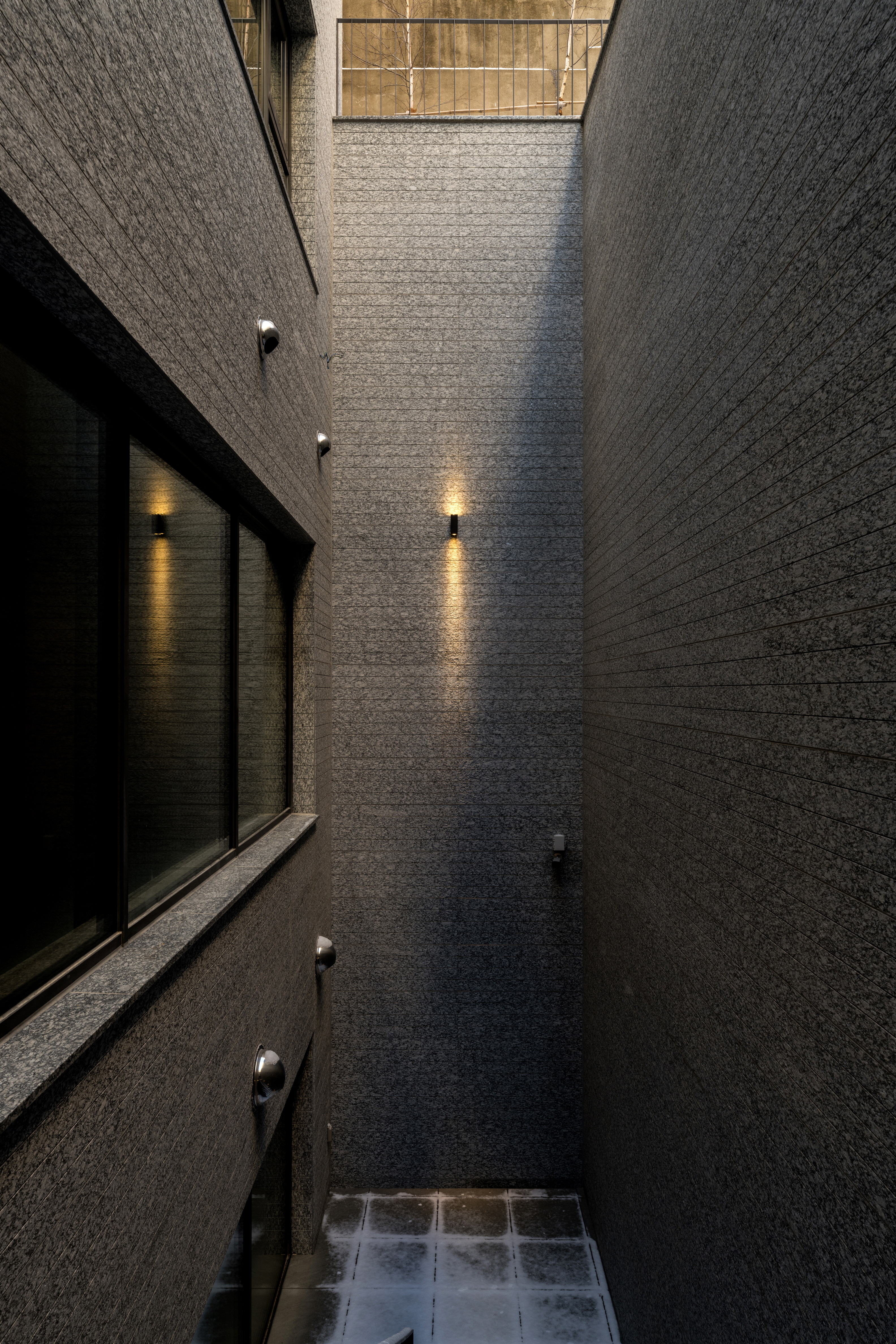 A central courtyard was established in the middle of the site, dividing the elongated plot into front and rear sections. Additionally, a sunken space was introduced at the rear, allowing natural light to penetrate down to the second basement level and enabling natural ventilation.