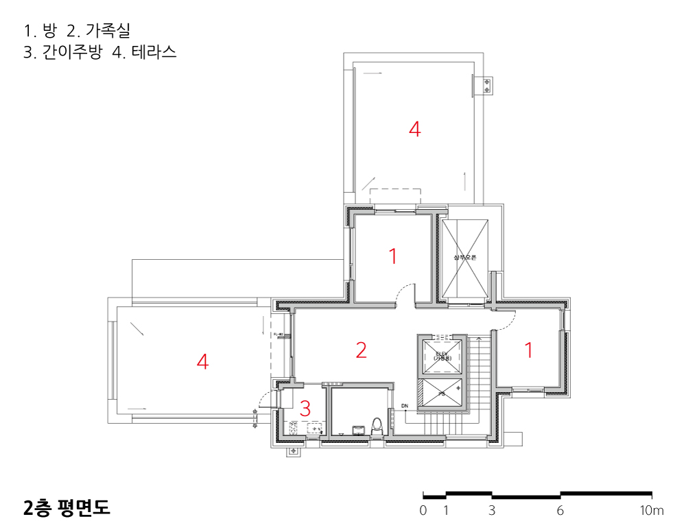 2층에서는 넓은 테라스를 통해 삼다재 저수지의 풍경을 감상할 수 있도록 하였으며, 복도와 계단 공간은 오픈되어 있어 시각적 개방감을 주고 가족 간의 소통이 자연스럽게 이루어지도록 설계했다.