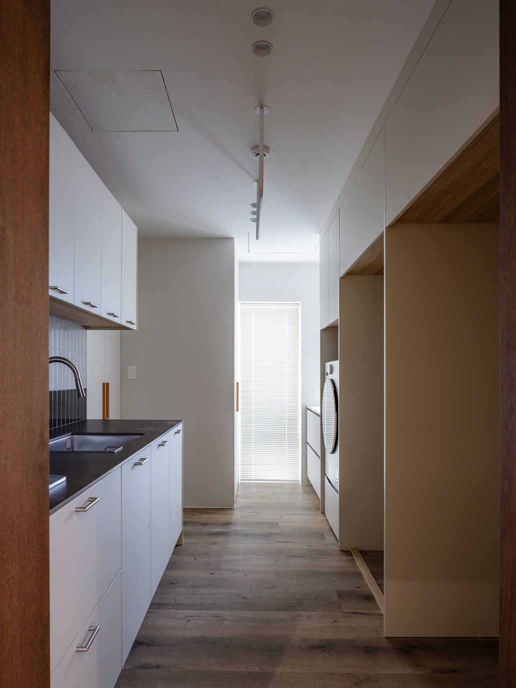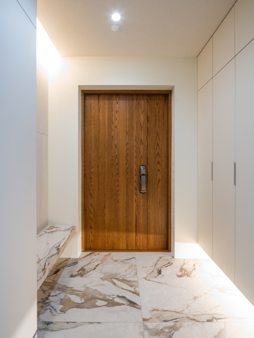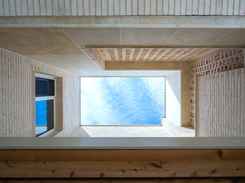 On the road-facing side, the mass of the building functions as a wall, clearly separating the public space outside from the private interior. A transitional buffer space was introduced at the entrance to create a natural shift from public to private. The entryway is designed as an enclosed area, with an open ceiling that frames the sky in a square, guiding visitors into the house through this thoughtfully crafted space.