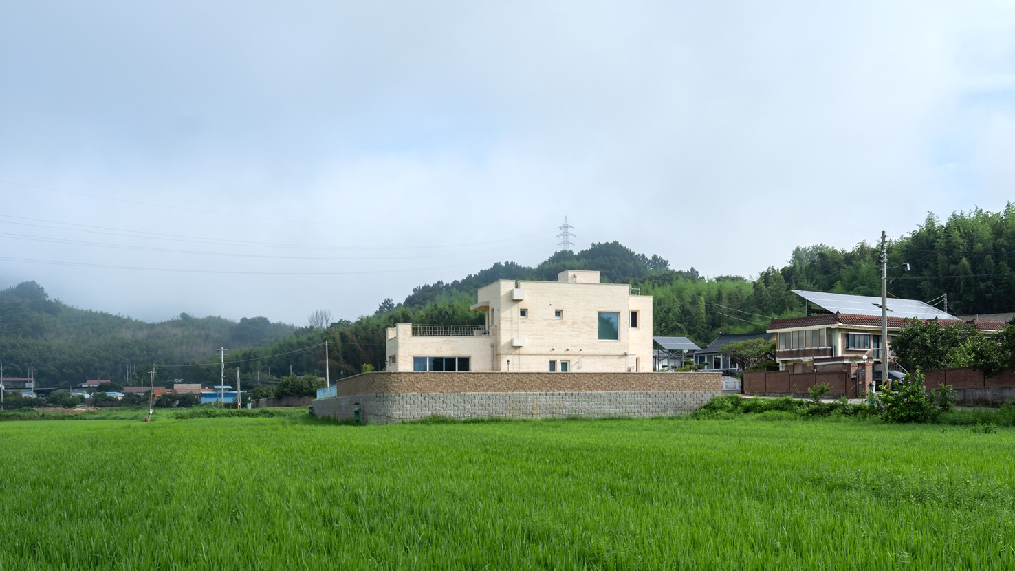 This house is located in the village of Samdari, where the Yongcheon stream joins the Yeongsan River, and faces the Samdajae Reservoir, beautifully adorned with blooming lotuses. Surrounded by rice paddies, the area presents different landscapes with each season. In spring, before the rice grows, the water filled paddies create the impression of an island floating on a sea, offering a particularly striking view.