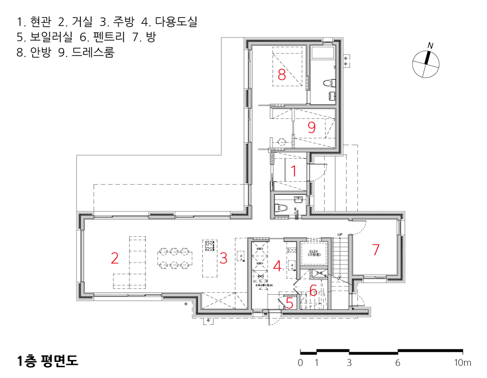 도로 쪽에서는 주택의 매스가 담장의 역할을 하여 외부의 공공 영역과 내부의 사적인 공간을 명확히 구분해 주었다. 현관으로 진입할 때는 공공성과 프라이버시가 자연스럽게 전환되도록, 완충 공간의 개념을 도입했고, 현관은 위요된 공간으로 구성되어 있으며, 상부를 오픈시켜 하늘이 네모난 프레임처럼 보이는 공간을 지나 주택 안으로 진입하도록 설계했다.