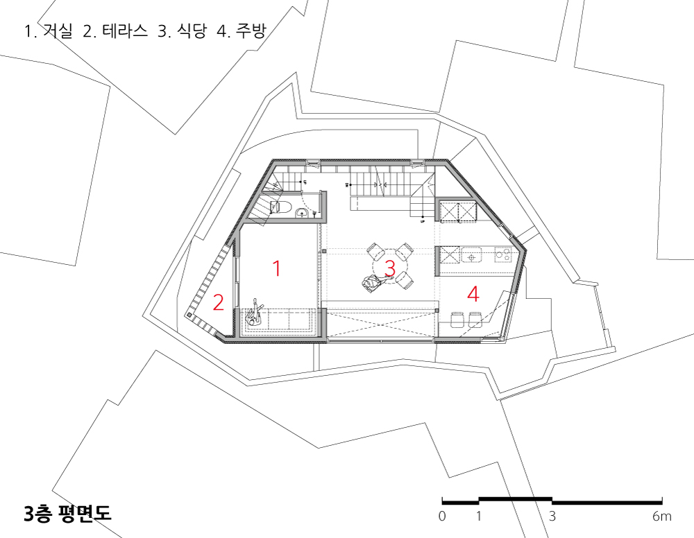 임대 세대가 들어갈 지상 1층의 공간은 두 세대로 각각 전용의 계단과 전용의 마당을 가지고 있다. 주인세대의 2층 공간은 주로 침실로 구성되어 있다. 부부침실이 가장 안쪽에 위치해 있고, 그다음은 욕실, 그다음은 아이들 방이 복도를 통해 이어진다. 아이들 방은 남쪽의 테라스 공간을 공유하며 모든 문이 개방적인 미닫이문으로 되어있다. 아이들은 테라스와 방과 복도를 하나의 큰 놀이터로 느낄 것이다. 3층은 거실과 주방, 다이닝룸의 공간으로 그 중심에는 식당을 배치하였다. 거실은 투시형 문을 이용해 열고 닫을 수 있게 하여 공간의 독립성을 확보했다.