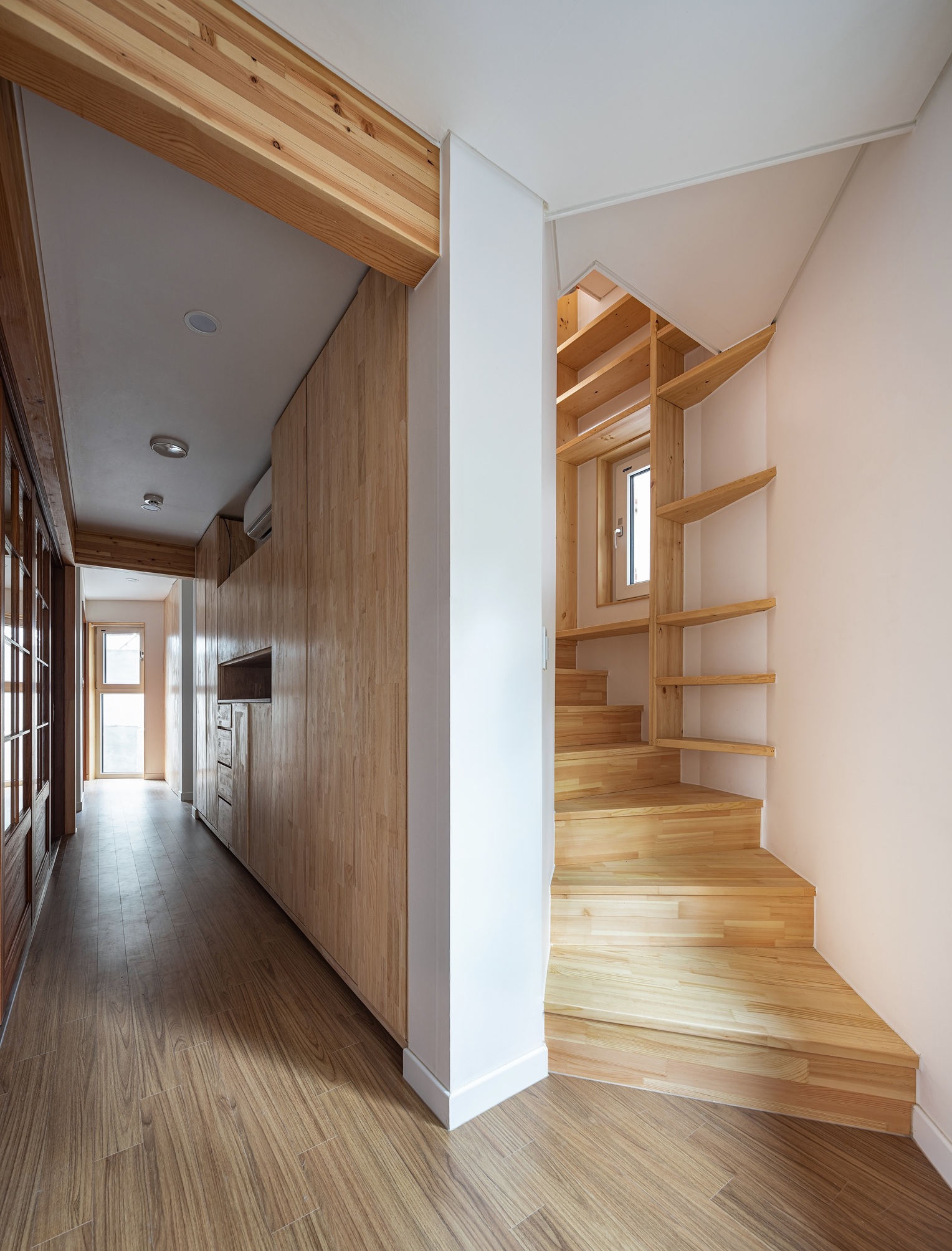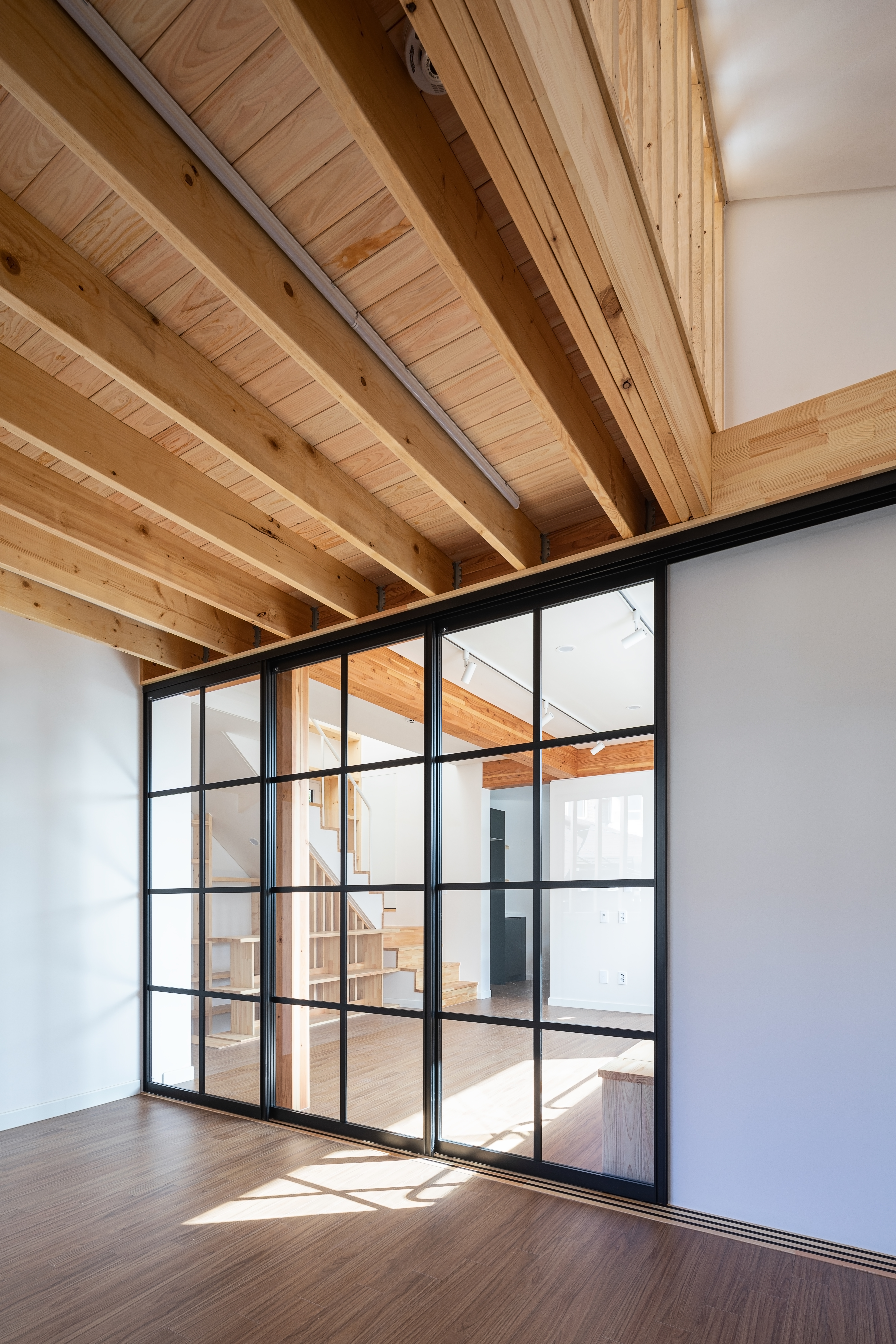 빠른 공사와 입주를 위해서 목구조를 최대한 활용하기로 결정했고, 경사지이고 층간소음의 발생을 감안해서 임대세대가 들어갈 1층은 콘크리트구조로 하고 2층, 3층의 주인세대는 목구조와 중목구조가 섞인 구조방식을 채택했다. 경골목구조와 중목구조를 섞어 사용해 합리적인 공사비와 3층에서의 넓은 개방감을 얻게 되었다. 2층에서 다락까지 연결되는 가족서가를 주요 구조재인 SPF 구조목을 사용하여 만들었고 창호 주변도 스프러스 집성목을 사용하여 전체적인 목재의 통일감을 주었다.