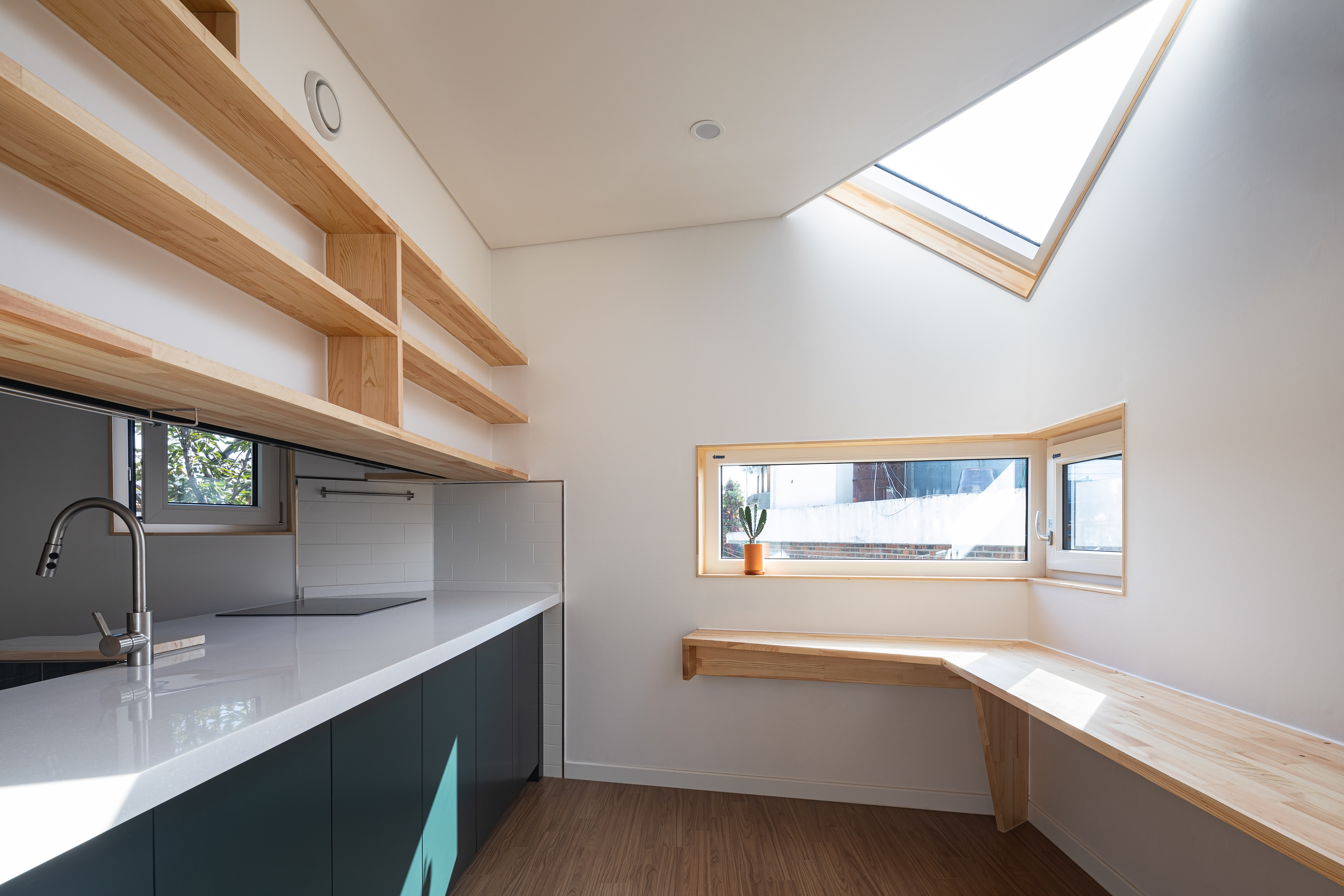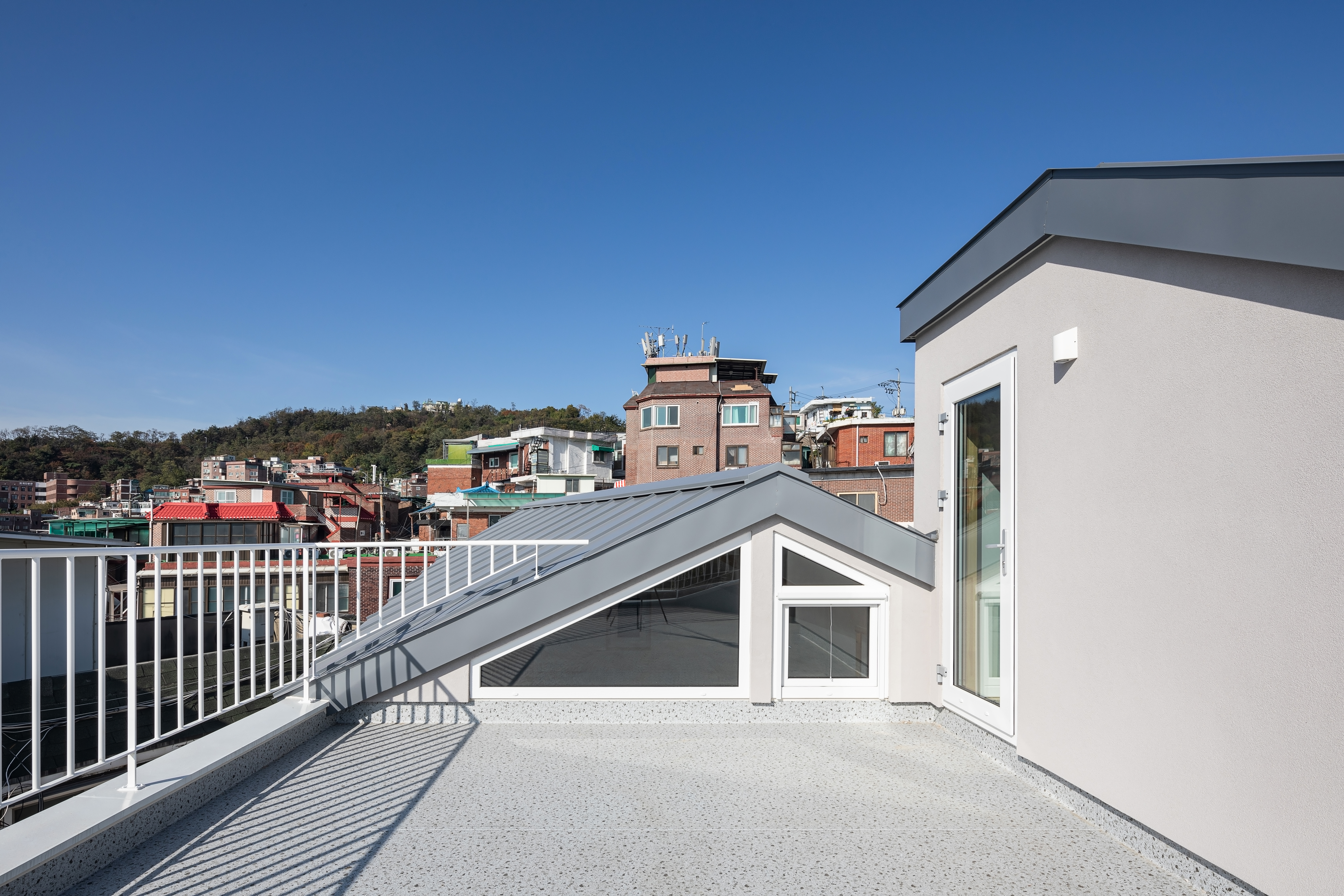 The Myeongnyun–Hyehwa district plan includes several regulations to preserve the character of the old fortress village. One key rule is the “limited parking exemption zone,” which allows houses to be built without parking if desired. Based on this, no parking was provided. Another rule is the 10-meter height limit, measured from the original ground level. Because Howawon sits on lower ground, this was a disadvantage. Still, since most nearby houses share similar heights, the view now stretches from Naksan toward Sungkyunkwan University, and on clear days even to Lotte World Tower across the Han River.