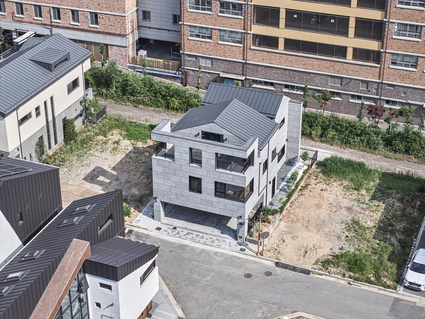 The site is located in a quiet and intimate residential neighborhood centered around a small park, where detached houses stand close together, sharing a calm village atmosphere. The site faces an internal road to the north and a pedestrian path and high school to the south. A road branching toward the park on the north allows partial park views, while the south side required careful design to secure privacy from noise and overlooking from the school.