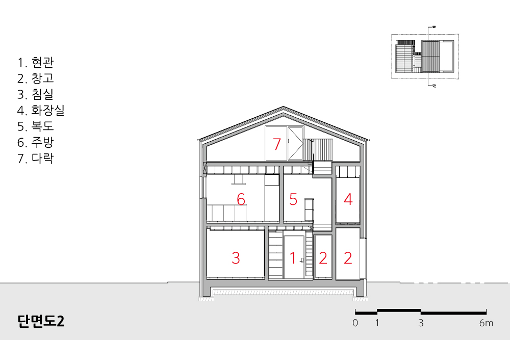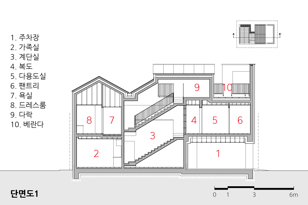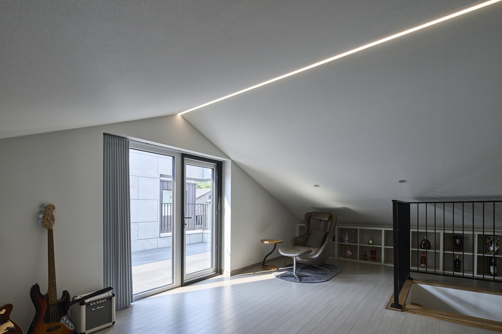 1층에 필로티 주차공간과 현관, 자녀방, 가족실을 배치하고 2층을 메인공간으로 구성하여, 거실과 식당, 주방, 다용도실 등을 하나의 공용공간으로, 부부안방을 비롯한 드레스룸, 욕실 등의 마스터존을 다른 하나의 공간으로 구성하였다. 2층 마스터존에서 다락으로 올라가면 음악활동을 취미로 가진 건축주만의 공간이 펼쳐지고 외부 테라스에서 휴식을 취할 수 있도록 계획하였다. 또한 중정을 통해 분절된 두 매스의 박공지붕 방향을 다르게 구성하여 입면상의 리듬감을 부여하고, 다락과 안방 등 내부공간에서의 공간감도 다양하게 경험할 수 있도록 계획하였다.