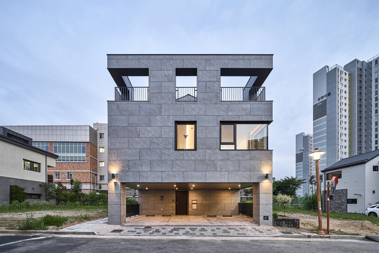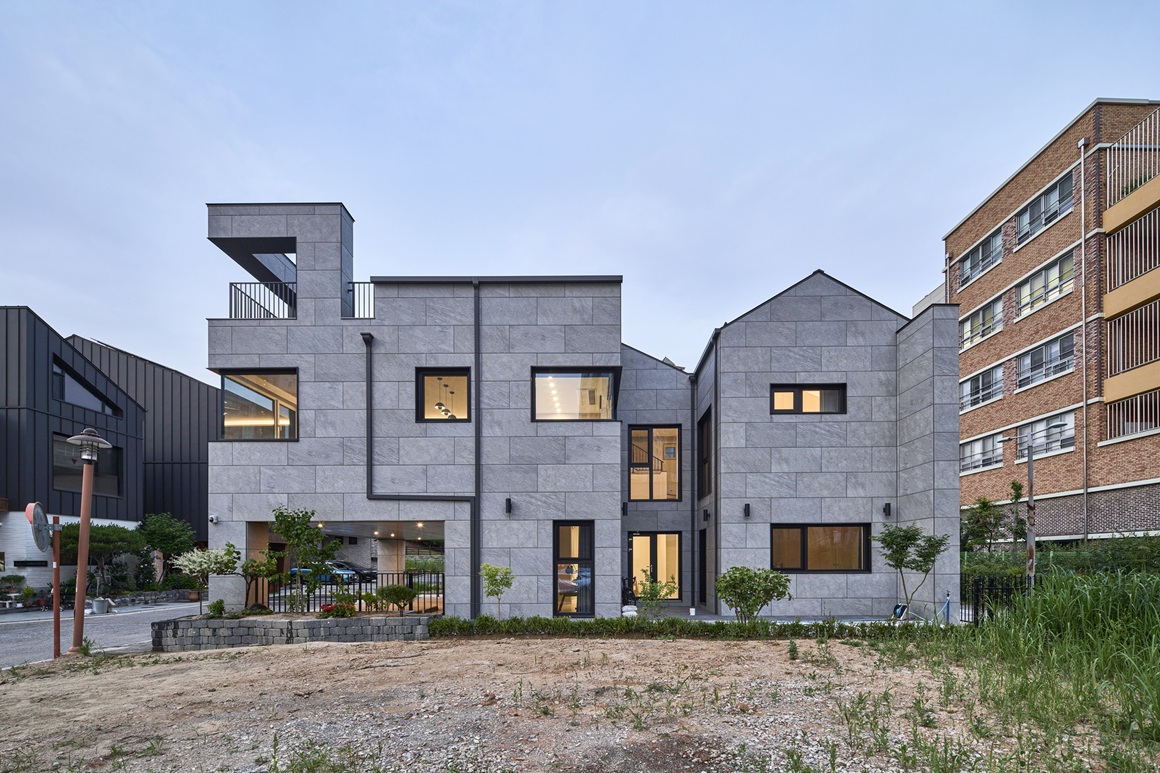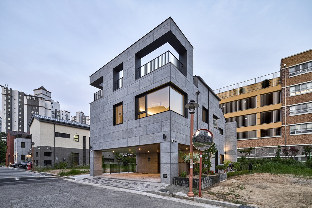 각각의 공간들과 연결되는 외부공간들을 고민하며 1층을 띄워 필로티 공간을 구성하고, 삶에서 잠시나마 여유를 느낄 수 있는 중정, 다락에서 연결되는 공원조망 테라스 등 대지의 조건에서 최대한 외부와 관계 맺을 수 있는 비워진 공간들을 삽입했다. 비워진 공간들에서 빛이 스며들고 바람이 드나들 수 있게 하고, 가족들의 다양한 삶의 모습들이 채워지길 바라며 공간을 구성했다.