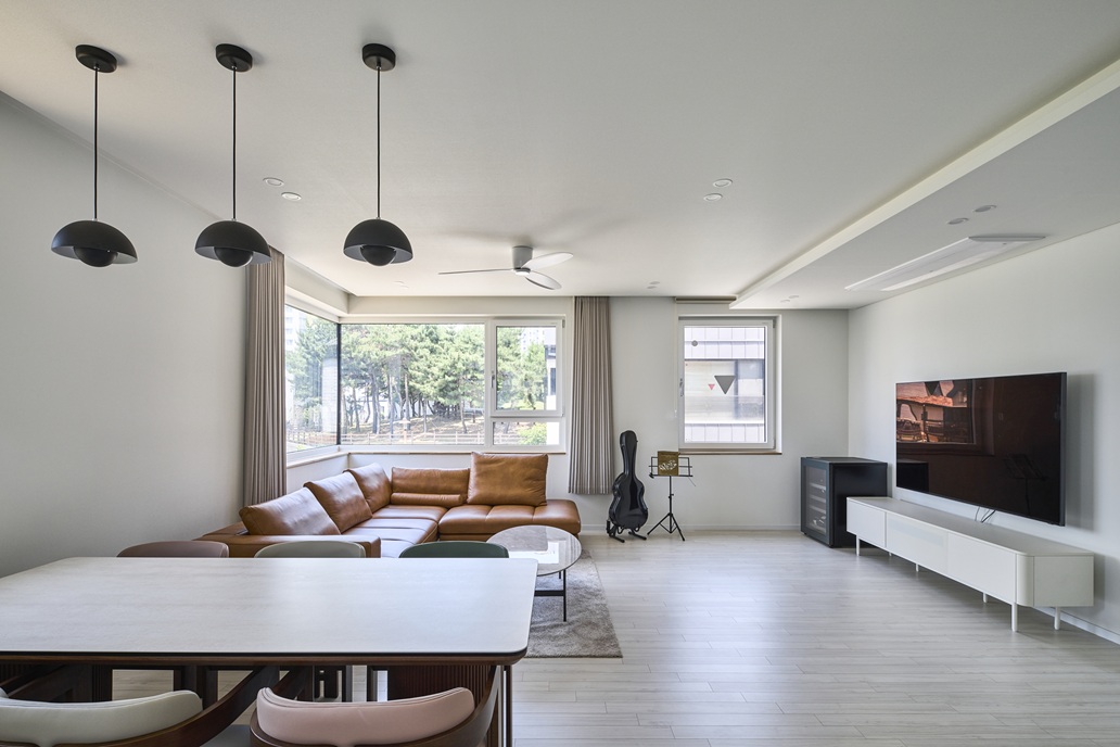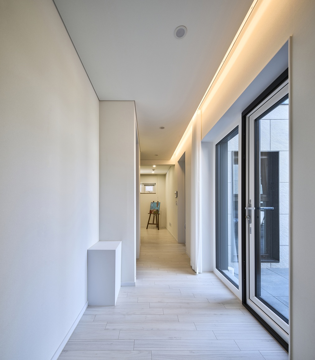 북측 공원 조망을 최대한 담아내기 위해 거실에 코너창을 설치하고, 중정을 향해 창을 내어 채광과 조망을 해결했다. 또한 남측으로 면한 공간에는 고창을 설치하여 고등학교로부터의 시선을 차단하며, 프라이버시를 확보하였다. 다락 테라스 공간의 영역을 형성하는 옥상구조물을 디자인해 외부 시선도 일부 가려줄 뿐만 아니라 가로변에서의 외관을 강조할 수 있도록 계획하였다.