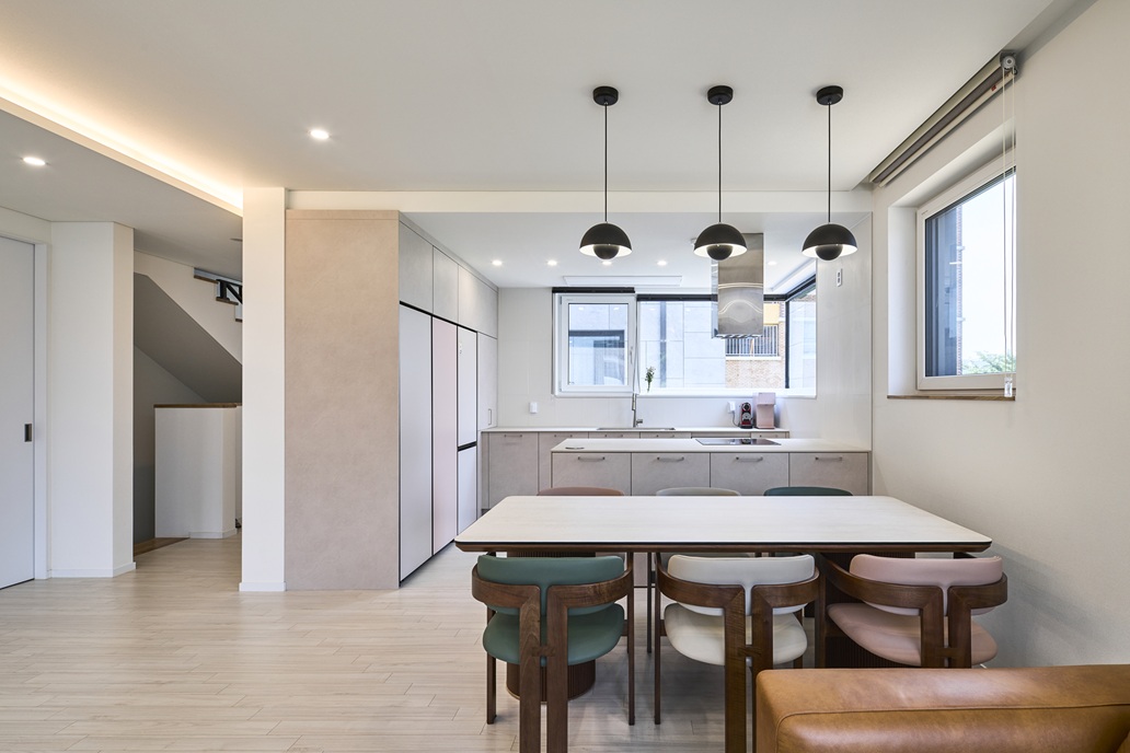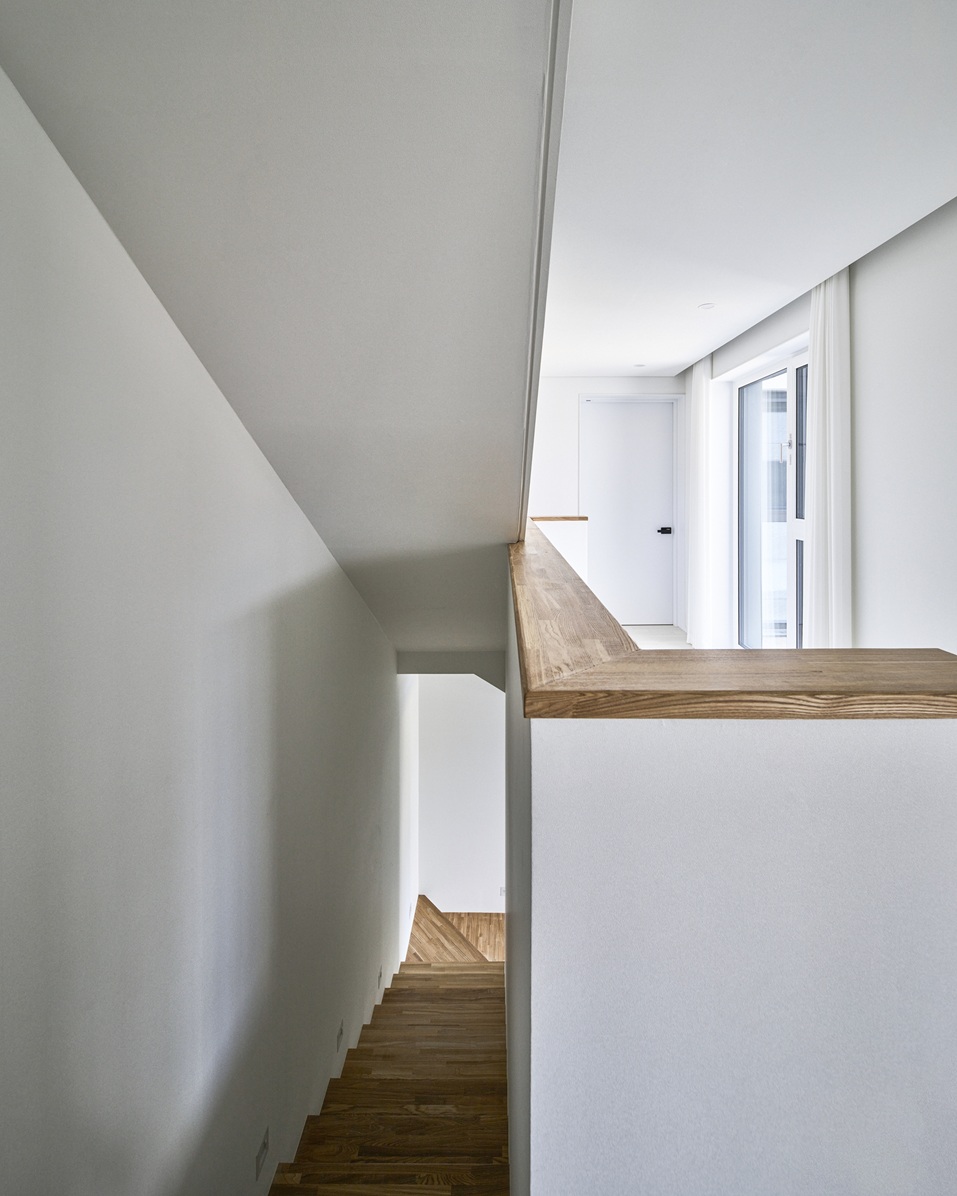 External spaces connected to each interior zone were carefully planned. The lifted first floor creates a piloti space, while the courtyard and the park-view terrace connected to the attic introduce moments of openness and rest. These emptied spaces allow light and wind to pass through, waiting to be filled with the everyday scenes of family life.