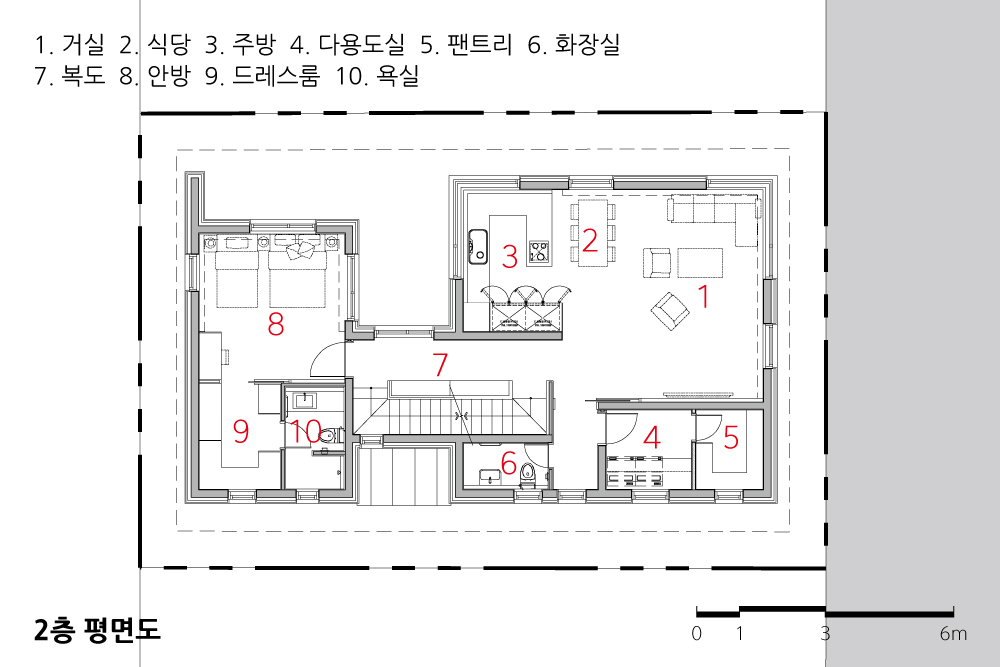 건축주 가족은 4인 가족으로, 20대의 자녀와 부부의 공간을 구분하길 원했으며, 추후에 장성한 자녀들이 출가하는 것도 염두하고 있었다. 또한 취미생활을 즐길 다락과 필로티 주차공간을 요구하였다.