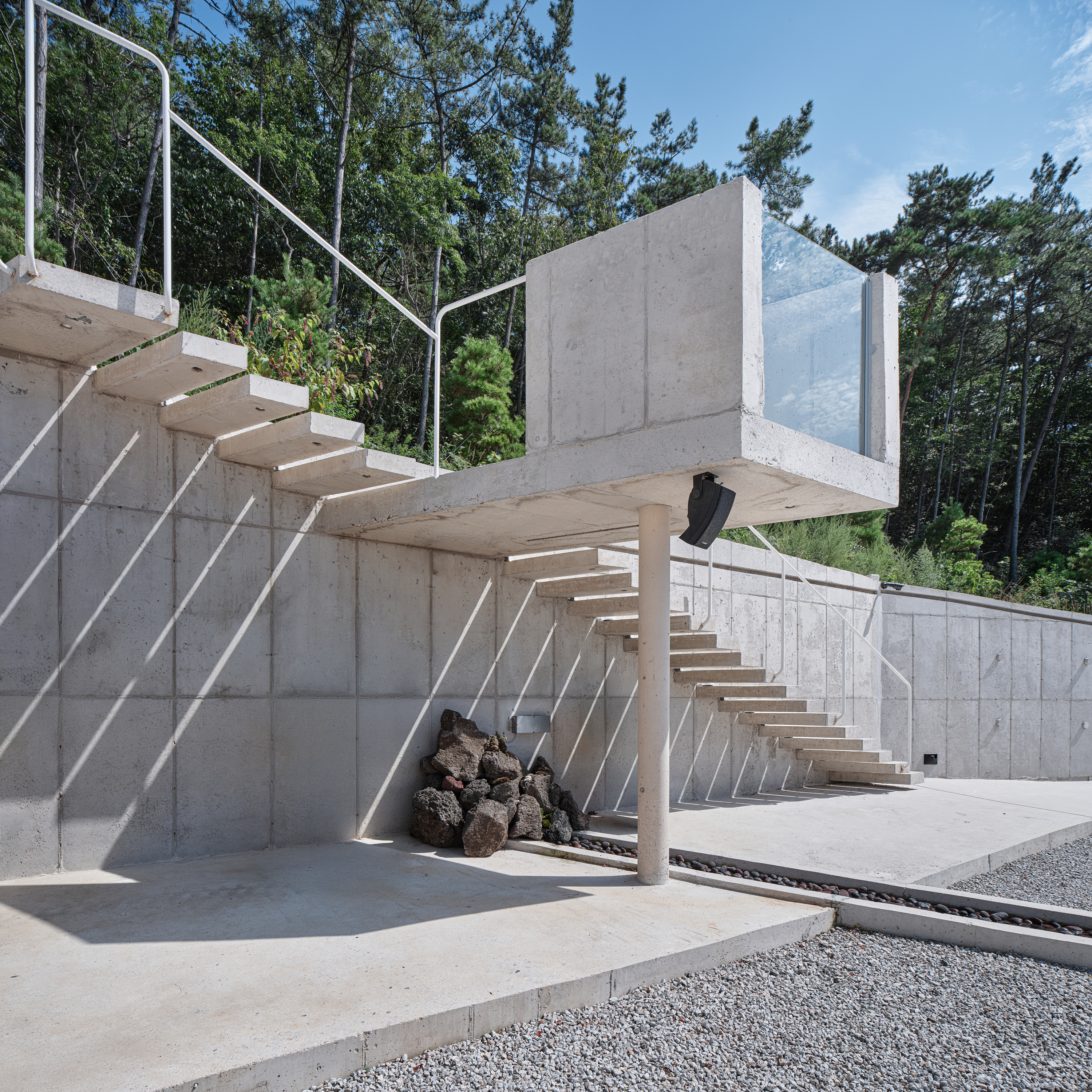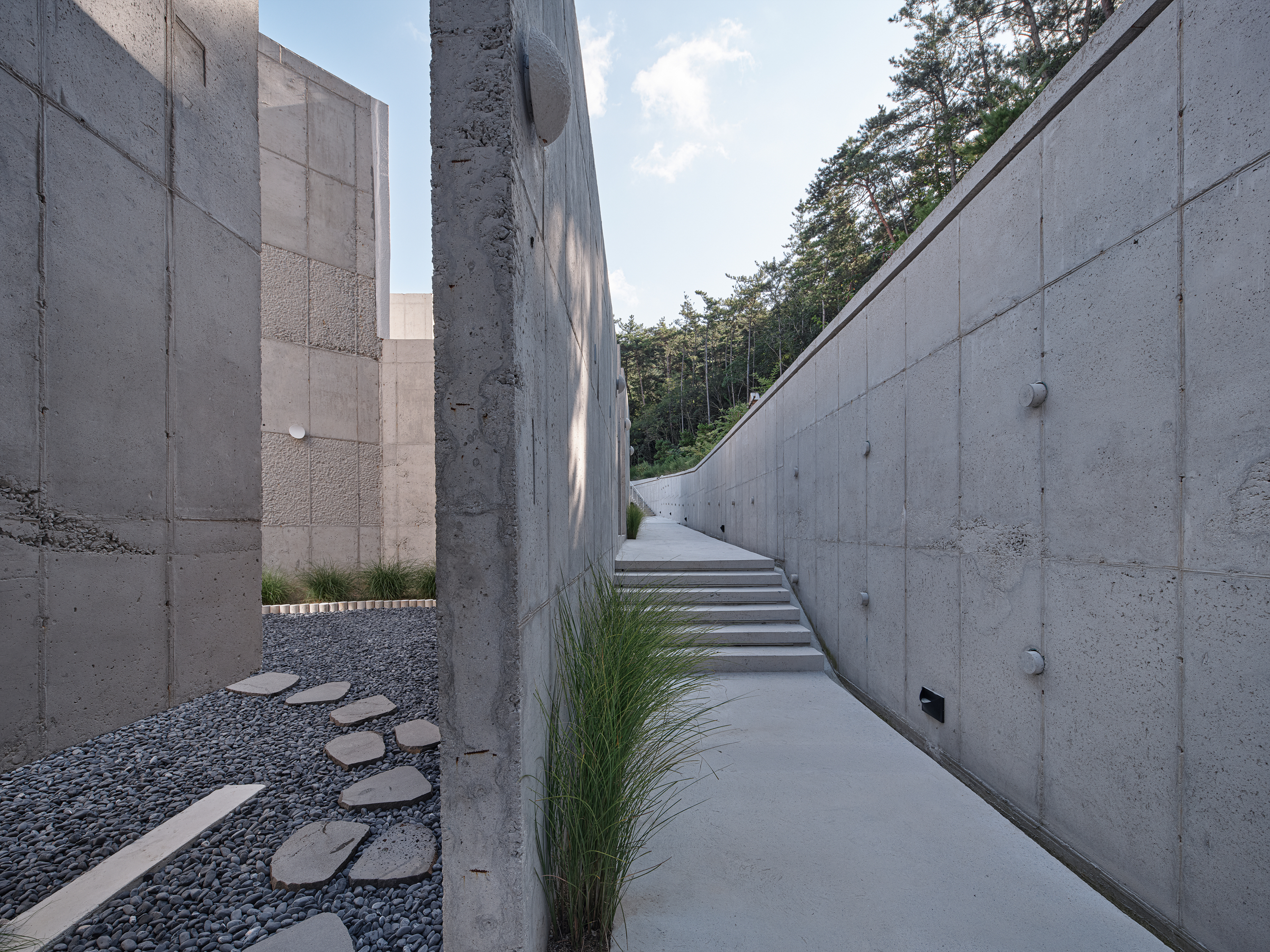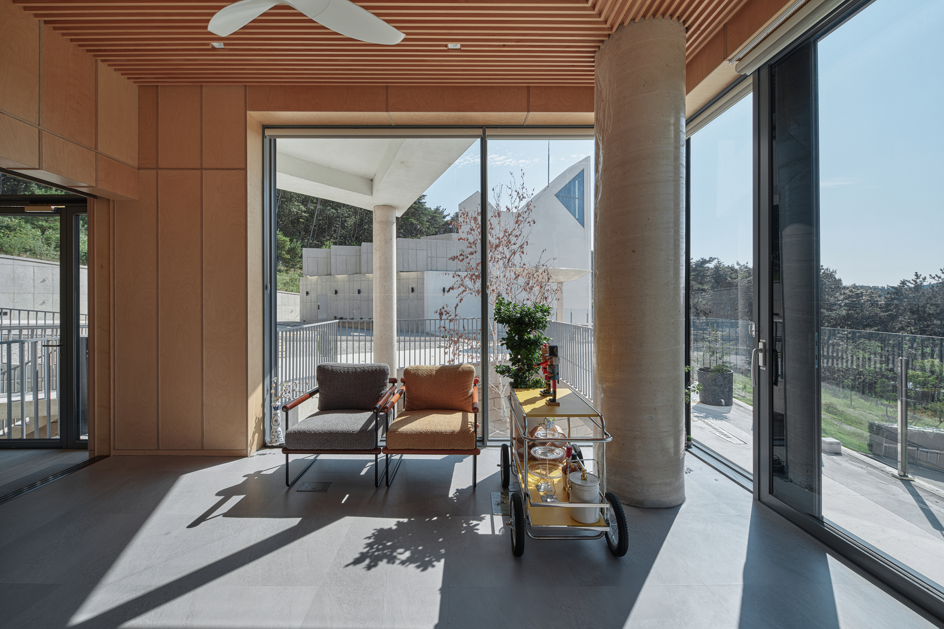 Here, what is removed becomes the center. The empty space sets the tension and the breathing of the whole. The gaps between masses are not simple separations; they are passages for light and wind, soft boundaries where nature seeps in. This loose, charged space opens the building’s breath, like the wind paths of Byeonsan, and meets the visitor along the way.