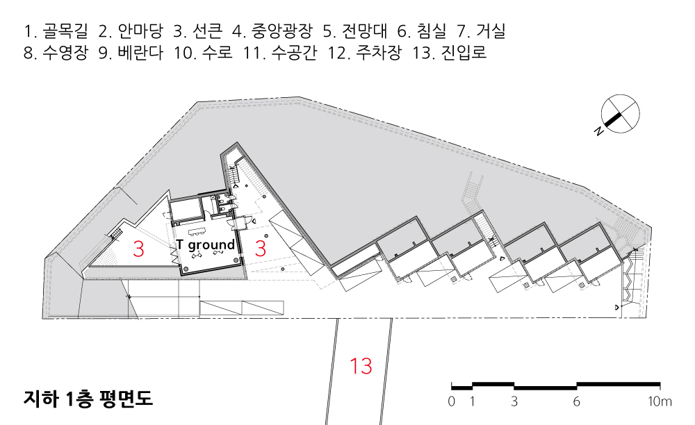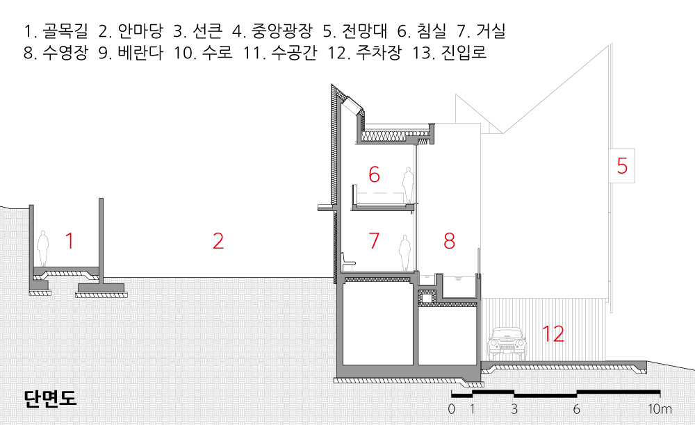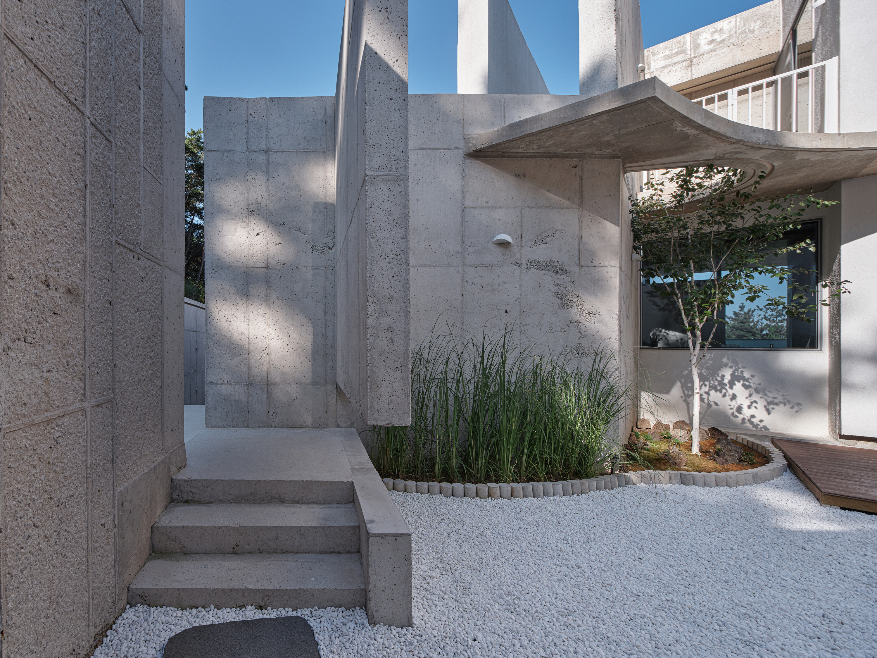 매스 간의 간격은 단순한 분절이 아니라, 빛과 바람이 흐르는 틈이자 자연이 스며드는 경계다. 그 사이의 느슨한 긴장의 공간은 마치 변산의 바람이 지나가는 길처럼 건축의 숨통을 트이게 하며 방문객과 조우한다.